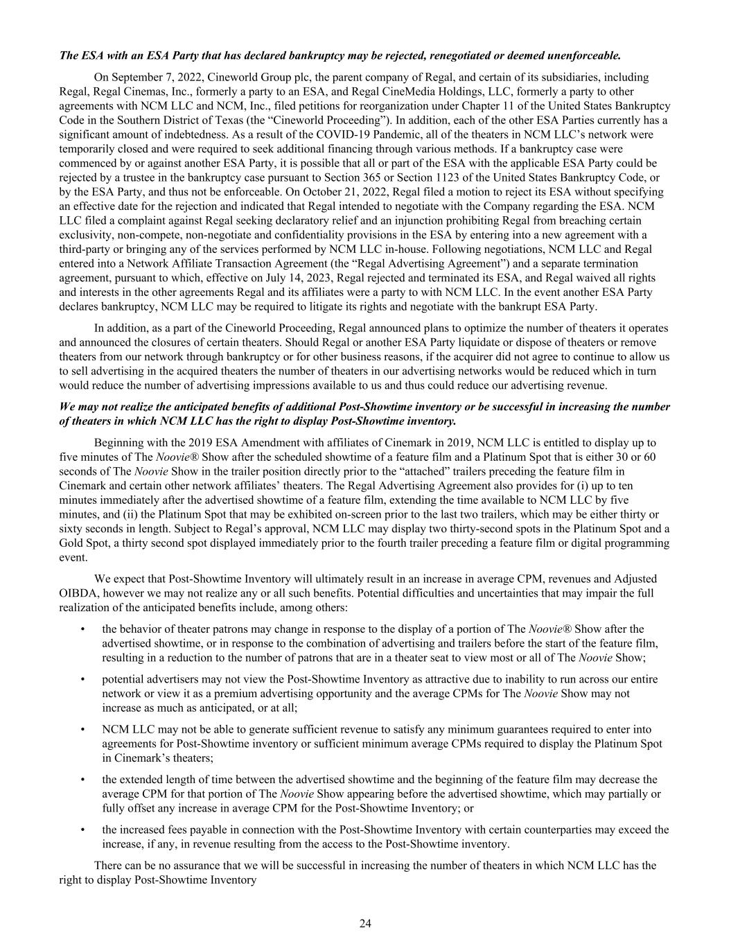 The ESA with an ESA Party that has declared bankruptcy may be rejected, renegotiated or deemed unenforceable. On September 7, 2022, Cineworld Group plc, the parent company of Regal, and certain of its subsidiaries, including Regal, Regal Cinemas, Inc., formerly a party to an ESA, and Regal CineMedia Holdings, LLC, formerly a party to other agreements with NCM LLC and NCM, Inc., filed petitions for reorganization under Chapter 11 of the United States Bankruptcy Code in the Southern District of Texas (the “Cineworld Proceeding”). In addition, each of the other ESA Parties currently has a significant amount of indebtedness. As a result of the COVID-19 Pandemic, all of the theaters in NCM LLC’s network were temporarily closed and were required to seek additional financing through various methods. If a bankruptcy case were commenced by or against another ESA Party, it is possible that all or part of the ESA with the applicable ESA Party could be rejected by a trustee in the bankruptcy case pursuant to Section 365 or Section 1123 of the United States Bankruptcy Code, or by the ESA Party, and thus not be enforceable. On October 21, 2022, Regal filed a motion to reject its ESA without specifying an effective date for the rejection and indicated that Regal intended to negotiate with the Company regarding the ESA. NCM LLC filed a complaint against Regal seeking declaratory relief and an injunction prohibiting Regal from breaching certain exclusivity, non-compete, non-negotiate and confidentiality provisions in the ESA by entering into a new agreement with a third-party or bringing any of the services performed by NCM LLC in-house. Following negotiations, NCM LLC and Regal entered into a Network Affiliate Transaction Agreement (the “Regal Advertising Agreement”) and a separate termination agreement, pursuant to which, effective on July 14, 2023, Regal rejected and terminated its ESA, and Regal waived all rights and interests in the other agreements Regal and its affiliates were a party to with NCM LLC. In the event another ESA Party declares bankruptcy, NCM LLC may be required to litigate its rights and negotiate with the bankrupt ESA Party. In addition, as a part of the Cineworld Proceeding, Regal announced plans to optimize the number of theaters it operates and announced the closures of certain theaters. Should Regal or another ESA Party liquidate or dispose of theaters or remove theaters from our network through bankruptcy or for other business reasons, if the acquirer did not agree to continue to allow us to sell advertising in the acquired theaters the number of theaters in our advertising networks would be reduced which in turn would reduce the number of advertising impressions available to us and thus could reduce our advertising revenue. We may not realize the anticipated benefits of additional Post-Showtime inventory or be successful in increasing the number of theaters in which NCM LLC has the right to display Post-Showtime inventory. Beginning with the 2019 ESA Amendment with affiliates of Cinemark in 2019, NCM LLC is entitled to display up to five minutes of The Noovie® Show after the scheduled showtime of a feature film and a Platinum Spot that is either 30 or 60 seconds of The Noovie Show in the trailer position directly prior to the “attached” trailers preceding the feature film in Cinemark and certain other network affiliates’ theaters. The Regal Advertising Agreement also provides for (i) up to ten minutes immediately after the advertised showtime of a feature film, extending the time available to NCM LLC by five minutes, and (ii) the Platinum Spot that may be exhibited on-screen prior to the last two trailers, which may be either thirty or sixty seconds in length. Subject to Regal’s approval, NCM LLC may display two thirty-second spots in the Platinum Spot and a Gold Spot, a thirty second spot displayed immediately prior to the fourth trailer preceding a feature film or digital programming event. We expect that Post-Showtime Inventory will ultimately result in an increase in average CPM, revenues and Adjusted OIBDA, however we may not realize any or all such benefits. Potential difficulties and uncertainties that may impair the full realization of the anticipated benefits include, among others: • the behavior of theater patrons may change in response to the display of a portion of The Noovie® Show after the advertised showtime, or in response to the combination of advertising and trailers before the start of the feature film, resulting in a reduction to the number of patrons that are in a theater seat to view most or all of The Noovie Show; • potential advertisers may not view the Post-Showtime Inventory as attractive due to inability to run across our entire network or view it as a premium advertising opportunity and the average CPMs for The Noovie Show may not increase as much as anticipated, or at all; • NCM LLC may not be able to generate sufficient revenue to satisfy any minimum guarantees required to enter into agreements for Post-Showtime inventory or sufficient minimum average CPMs required to display the Platinum Spot in Cinemark’s theaters; • the extended length of time between the advertised showtime and the beginning of the feature film may decrease the average CPM for that portion of The Noovie Show appearing before the advertised showtime, which may partially or fully offset any increase in average CPM for the Post-Showtime Inventory; or • the increased fees payable in connection with the Post-Showtime Inventory with certain counterparties may exceed the increase, if any, in revenue resulting from the access to the Post-Showtime inventory. There can be no assurance that we will be successful in increasing the number of theaters in which NCM LLC has the right to display Post-Showtime Inventory 24