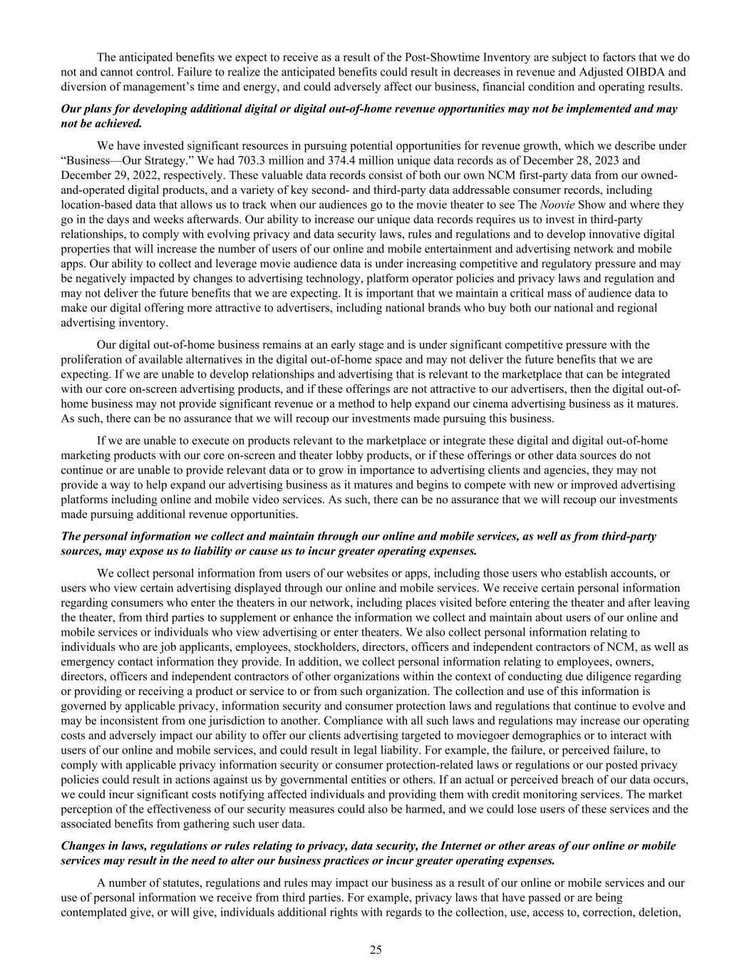The anticipated benefits we expect to receive as a result of the Post-Showtime Inventory are subject to factors that we do not and cannot control. Failure to realize the anticipated benefits could result in decreases in revenue and Adjusted OIBDA and diversion of management’s time and energy, and could adversely affect our business, financial condition and operating results. Our plans for developing additional digital or digital out-of-home revenue opportunities may not be implemented and may not be achieved. We have invested significant resources in pursuing potential opportunities for revenue growth, which we describe under “Business—Our Strategy.” We had 703.3 million and 374.4 million unique data records as of December 28, 2023 and December 29, 2022, respectively. These valuable data records consist of both our own NCM first-party data from our owned- and-operated digital products, and a variety of key second- and third-party data addressable consumer records, including location-based data that allows us to track when our audiences go to the movie theater to see The Noovie Show and where they go in the days and weeks afterwards. Our ability to increase our unique data records requires us to invest in third-party relationships, to comply with evolving privacy and data security laws, rules and regulations and to develop innovative digital properties that will increase the number of users of our online and mobile entertainment and advertising network and mobile apps. Our ability to collect and leverage movie audience data is under increasing competitive and regulatory pressure and may be negatively impacted by changes to advertising technology, platform operator policies and privacy laws and regulation and may not deliver the future benefits that we are expecting. It is important that we maintain a critical mass of audience data to make our digital offering more attractive to advertisers, including national brands who buy both our national and regional advertising inventory. Our digital out-of-home business remains at an early stage and is under significant competitive pressure with the proliferation of available alternatives in the digital out-of-home space and may not deliver the future benefits that we are expecting. If we are unable to develop relationships and advertising that is relevant to the marketplace that can be integrated with our core on-screen advertising products, and if these offerings are not attractive to our advertisers, then the digital out-of- home business may not provide significant revenue or a method to help expand our cinema advertising business as it matures. As such, there can be no assurance that we will recoup our investments made pursuing this business. If we are unable to execute on products relevant to the marketplace or integrate these digital and digital out-of-home marketing products with our core on-screen and theater lobby products, or if these offerings or other data sources do not continue or are unable to provide relevant data or to grow in importance to advertising clients and agencies, they may not provide a way to help expand our advertising business as it matures and begins to compete with new or improved advertising platforms including online and mobile video services. As such, there can be no assurance that we will recoup our investments made pursuing additional revenue opportunities. The personal information we collect and maintain through our online and mobile services, as well as from third-party sources, may expose us to liability or cause us to incur greater operating expenses. We collect personal information from users of our websites or apps, including those users who establish accounts, or users who view certain advertising displayed through our online and mobile services. We receive certain personal information regarding consumers who enter the theaters in our network, including places visited before entering the theater and after leaving the theater, from third parties to supplement or enhance the information we collect and maintain about users of our online and mobile services or individuals who view advertising or enter theaters. We also collect personal information relating to individuals who are job applicants, employees, stockholders, directors, officers and independent contractors of NCM, as well as emergency contact information they provide. In addition, we collect personal information relating to employees, owners, directors, officers and independent contractors of other organizations within the context of conducting due diligence regarding or providing or receiving a product or service to or from such organization. The collection and use of this information is governed by applicable privacy, information security and consumer protection laws and regulations that continue to evolve and may be inconsistent from one jurisdiction to another. Compliance with all such laws and regulations may increase our operating costs and adversely impact our ability to offer our clients advertising targeted to moviegoer demographics or to interact with users of our online and mobile services, and could result in legal liability. For example, the failure, or perceived failure, to comply with applicable privacy information security or consumer protection-related laws or regulations or our posted privacy policies could result in actions against us by governmental entities or others. If an actual or perceived breach of our data occurs, we could incur significant costs notifying affected individuals and providing them with credit monitoring services. The market perception of the effectiveness of our security measures could also be harmed, and we could lose users of these services and the associated benefits from gathering such user data. Changes in laws, regulations or rules relating to privacy, data security, the Internet or other areas of our online or mobile services may result in the need to alter our business practices or incur grea
