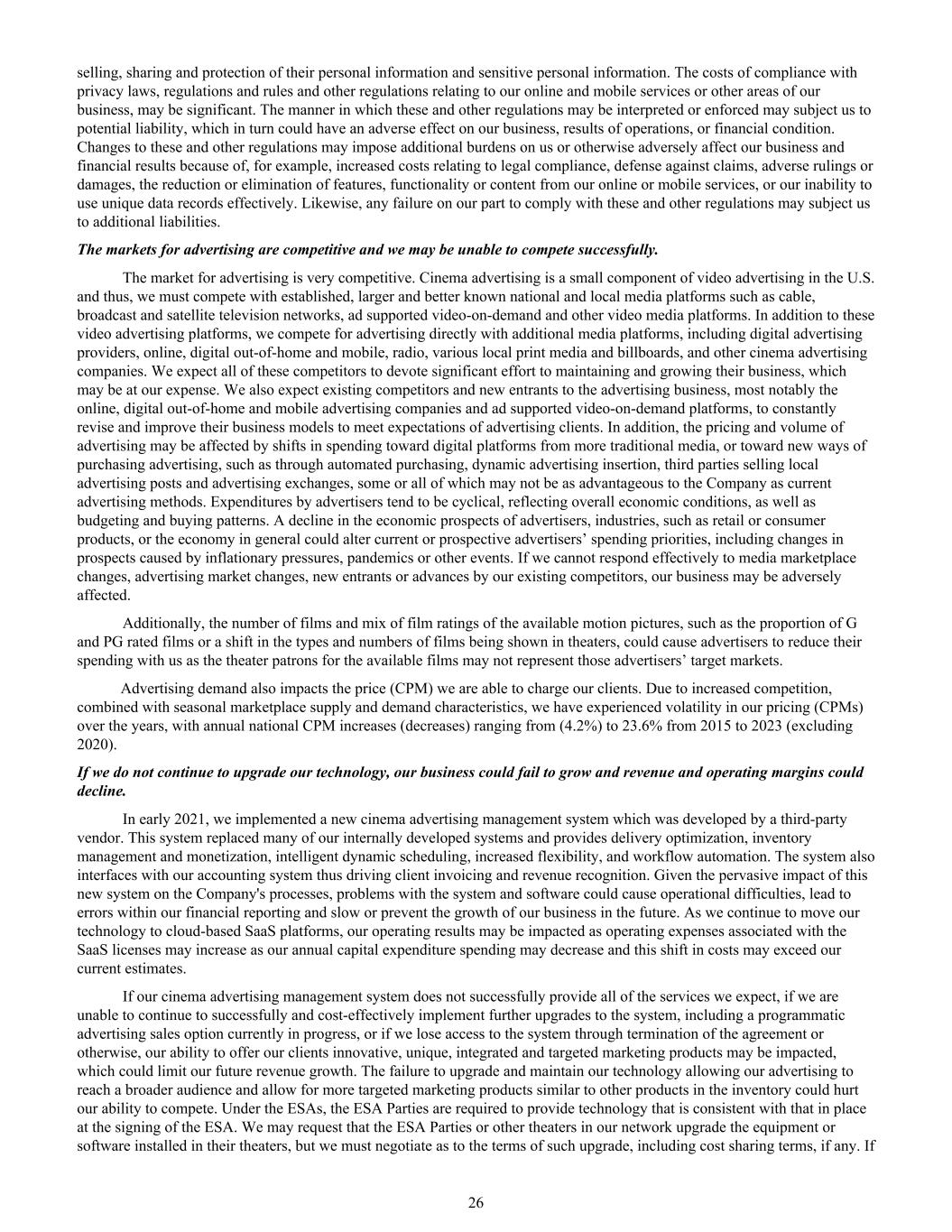 selling, sharing and protection of their personal information and sensitive personal information. The costs of compliance with privacy laws, regulations and rules and other regulations relating to our online and mobile services or other areas of our business, may be significant. The manner in which these and other regulations may be interpreted or enforced may subject us to potential liability, which in turn could have an adverse effect on our business, results of operations, or financial condition. Changes to these and other regulations may impose additional burdens on us or otherwise adversely affect our business and financial results because of, for example, increased costs relating to legal compliance, defense against claims, adverse rulings or damages, the reduction or elimination of features, functionality or content from our online or mobile services, or our inability to use unique data records effectively. Likewise, any failure on our part to comply with these and other regulations may subject us to additional liabilities. The markets for advertising are competitive and we may be unable to compete successfully. The market for advertising is very competitive. Cinema advertising is a small component of video advertising in the U.S. and thus, we must compete with established, larger and better known national and local media platforms such as cable, broadcast and satellite television networks, ad supported video-on-demand and other video media platforms. In addition to these video advertising platforms, we compete for advertising directly with additional media platforms, including digital advertising providers, online, digital out-of-home and mobile, radio, various local print media and billboards, and other cinema advertising companies. We expect all of these competitors to devote significant effort to maintaining and growing their business, which may be at our expense. We also expect existing competitors and new entrants to the advertising business, most notably the online, digital out-of-home and mobile advertising companies and ad supported video-on-demand platforms, to constantly revise and improve their business models to meet expectations of advertising clients. In addition, the pricing and volume of advertising may be affected by shifts in spending toward digital platforms from more traditional media, or toward new ways of purchasing advertising, such as through automated purchasing, dynamic advertising insertion, third parties selling local advertising posts and advertising exchanges, some or all of which may not be as advantageous to the Company as current advertising methods. Expenditures by advertisers tend to be cyclical, reflecting overall economic conditions, as well as budgeting and buying patterns. A decline in the economic prospects of advertisers, industries, such as retail or consumer products, or the economy in general could alter current or prospective advertisers’ spending priorities, including changes in prospects caused by inflationary pressures, pandemics or other events. If we cannot respond effectively to media marketplace changes, advertising market changes, new entrants or advances by our existing competitors, our business may be adversely affected. Additionally, the number of films and mix of film ratings of the available motion pictures, such as the proportion of G and PG rated films or a shift in the types and numbers of films being shown in theaters, could cause advertisers to reduce their spending with us as the theater patrons for the available films may not represent those advertisers’ target markets. Advertising demand also impacts the price (CPM) we are able to charge our clients. Due to increased competition, combined with seasonal marketplace supply and demand characteristics, we have experienced volatility in our pricing (CPMs) over the years, with annual national CPM increases (decreases) ranging from (4.2%) to 23.6% from 2015 to 2023 (excluding 2020). If we do not continue to upgrade our technology, our business could fail to grow and revenue and operating margins could decline. In early 2021, we implemented a new cinema advertising management system which was developed by a third-party vendor. This system replaced many of our internally developed systems and provides delivery optimization, inventory management and monetization, intelligent dynamic scheduling, increased flexibility, and workflow automation. The system also interfaces with our accounting system thus driving client invoicing and revenue recognition. Given the pervasive impact of this new system on the Company's processes, problems with the system and software could cause operational difficulties, lead to errors within our financial reporting and slow or prevent the growth of our business in the future. As we continue to move our technology to cloud-based SaaS platforms, our operating results may be impacted as operating expenses associated with the SaaS licenses may increase as our annual capital expenditure spending may decrease and this shift in costs may exceed our current estimates. If our cinema advertising management system does not successfully provide all of the services we expect, if we are unable to continue to successfully and cost-effectively implement further upgrades to the system, including a programmatic advertising sales option currently in progress, or if we lose access to the system through termination of the agreement or otherwise, our ability to offer our clients innovative, unique, integrated and targeted marketing products may be impacted, which could limit our future revenue growth. The failure to upgrade and maintain our technology allowing our advertising to reach a broader audience and allow for more targeted marketing products similar to other products in the inventory could hurt our ability to compete. Under the ESAs, the ESA Parties are required to provide technology that is consistent with that in place at the signing of the ESA. We may requ