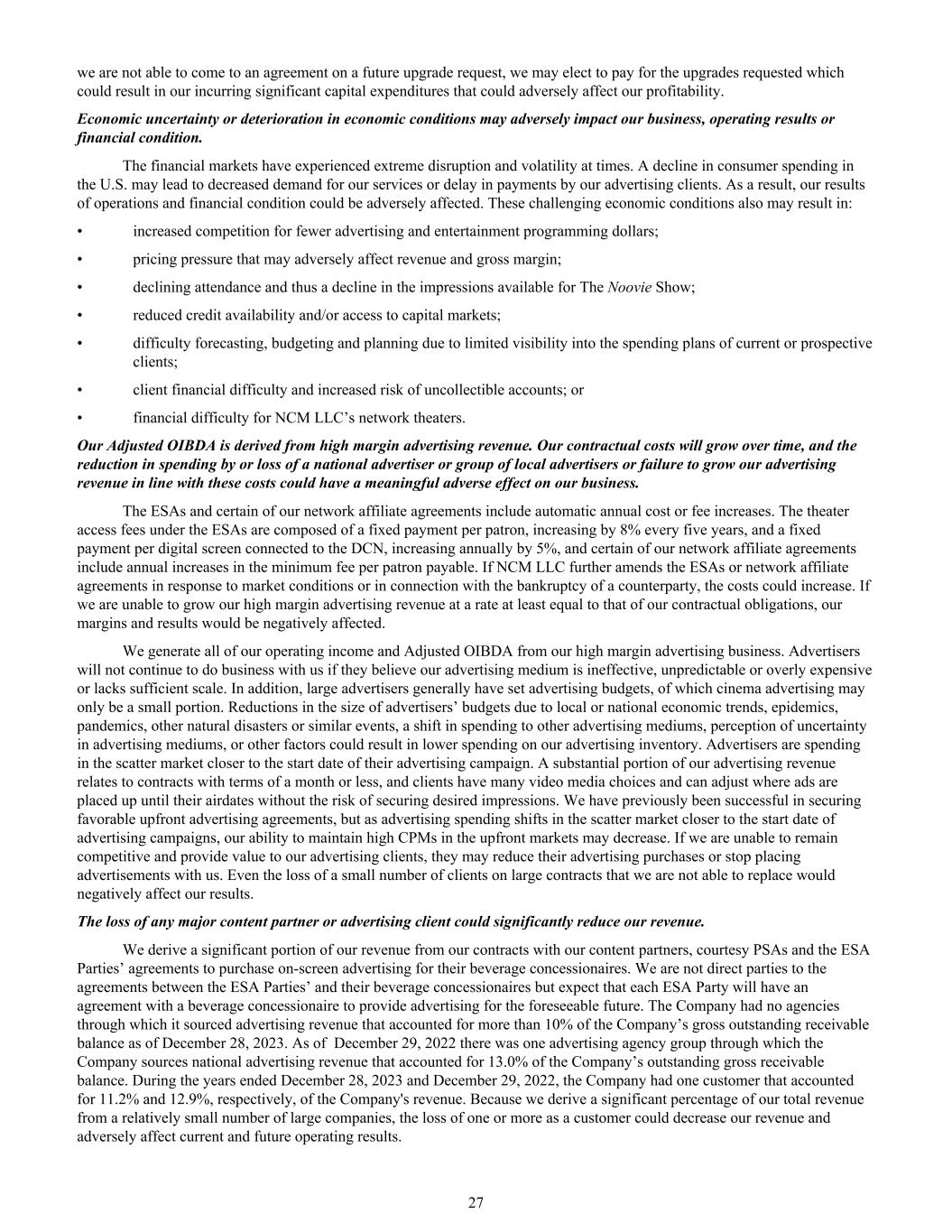 we are not able to come to an agreement on a future upgrade request, we may elect to pay for the upgrades requested which could result in our incurring significant capital expenditures that could adversely affect our profitability. Economic uncertainty or deterioration in economic conditions may adversely impact our business, operating results or financial condition. The financial markets have experienced extreme disruption and volatility at times. A decline in consumer spending in the U.S. may lead to decreased demand for our services or delay in payments by our advertising clients. As a result, our results of operations and financial condition could be adversely affected. These challenging economic conditions also may result in: • increased competition for fewer advertising and entertainment programming dollars; • pricing pressure that may adversely affect revenue and gross margin; • declining attendance and thus a decline in the impressions available for The Noovie Show; • reduced credit availability and/or access to capital markets; • difficulty forecasting, budgeting and planning due to limited visibility into the spending plans of current or prospective clients; • client financial difficulty and increased risk of uncollectible accounts; or • financial difficulty for NCM LLC’s network theaters. Our Adjusted OIBDA is derived from high margin advertising revenue. Our contractual costs will grow over time, and the reduction in spending by or loss of a national advertiser or group of local advertisers or failure to grow our advertising revenue in line with these costs could have a meaningful adverse effect on our business. The ESAs and certain of our network affiliate agreements include automatic annual cost or fee increases. The theater access fees under the ESAs are composed of a fixed payment per patron, increasing by 8% every five years, and a fixed payment per digital screen connected to the DCN, increasing annually by 5%, and certain of our network affiliate agreements include annual increases in the minimum fee per patron payable. If NCM LLC further amends the ESAs or network affiliate agreements in response to market conditions or in connection with the bankruptcy of a counterparty, the costs could increase. If we are unable to grow our high margin advertising revenue at a rate at least equal to that of our contractual obligations, our margins and results would be negatively affected. We generate all of our operating income and Adjusted OIBDA from our high margin advertising business. Advertisers will not continue to do business with us if they believe our advertising medium is ineffective, unpredictable or overly expensive or lacks sufficient scale. In addition, large advertisers generally have set advertising budgets, of which cinema advertising may only be a small portion. Reductions in the size of advertisers’ budgets due to local or national economic trends, epidemics, pandemics, other natural disasters or similar events, a shift in spending to other advertising mediums, perception of uncertainty in advertising mediums, or other factors could result in lower spending on our advertising inventory. Advertisers are spending in the scatter market closer to the start date of their advertising campaign. A substantial portion of our advertising revenue relates to contracts with terms of a month or less, and clients have many video media choices and can adjust where ads are placed up until their airdates without the risk of securing desired impressions. We have previously been successful in securing favorable upfront advertising agreements, but as advertising spending shifts in the scatter market closer to the start date of advertising campaigns, our ability to maintain high CPMs in the upfront markets may decrease. If we are unable to remain competitive and provide value to our advertising clients, they may reduce their advertising purchases or stop placing advertisements with us. Even the loss of a small number of clients on large contracts that we are not able to replace would negatively affect our results. The loss of any major content partner or advertising client could significantly reduce our revenue. We derive a significant portion of our revenue from our contracts with our content partners, courtesy PSAs and the ESA Parties’ agreements to purchase on-screen advertising for their beverage concessionaires. We are not direct parties to the agreements between the ESA Parties’ and their beverage concessionaires but expect that each ESA Party will have an agreement with a beverage concessionaire to provide advertising for the foreseeable future. The Company had no agencies through which it sourced advertising revenue that accounted for more than 10% of the Company’s gross outstanding receivable balance as of December 28, 2023. As of December 29, 2022 there was one advertising agency group through which the Company sources national advertising revenue that accounted for 13.0% of the Company’s outstanding gross receivable balance. During the years ended December 28, 2023 and December 29, 2022, the Company had one customer that accounted for 11.2% and 12.9%, respectively, of the Company's revenue. Because we derive a significant percentage of our total revenue from a relatively small number of large companies, the loss of one or more as a customer could decrease our revenue and adversely affect current and future operating results. 27