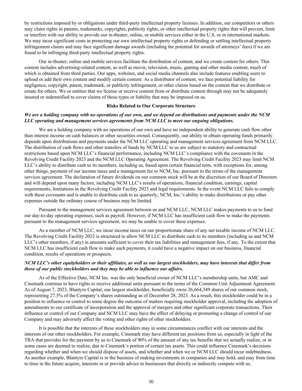 by restrictions imposed by or obligations under third-party intellectual property licenses. In addition, our competitors or others may claim rights in patents, trademarks, copyrights, publicity rights, or other intellectual property rights that will prevent, limit or interfere with our ability to provide our in-theater, online, or mobile services either in the U.S. or in international markets. We may incur significant costs in protecting our own intellectual property rights or defending or settling intellectual property infringement claims and may face significant damage awards (including the potential for awards of attorneys’ fees) if we are found to be infringing third-party intellectual property rights. Our in-theater, online and mobile services facilitate the distribution of content, and we create content for others. This content includes advertising-related content, as well as movie, television, music, gaming and other media content, much of which is obtained from third parties. Our apps, websites, and social media channels also include features enabling users to upload or add their own content and modify certain content. As a distributor of content, we face potential liability for negligence, copyright, patent, trademark, or publicity infringement, or other claims based on the content that we distribute or create for others. We or entities that we license or receive content from or distribute content through may not be adequately insured or indemnified to cover claims of these types or liability that may be imposed on us. Risks Related to Our Corporate Structure We are a holding company with no operations of our own, and we depend on distributions and payments under the NCM LLC operating and management services agreements from NCM LLC to meet our ongoing obligations. We are a holding company with no operations of our own and have no independent ability to generate cash flow other than interest income on cash balances or other securities owned. Consequently, our ability to obtain operating funds primarily depends upon distributions and payments under the NCM LLC operating and management services agreement from NCM LLC. The distribution of cash flows and other transfers of funds by NCM LLC to us are subject to statutory and contractual restrictions based upon NCM LLC’s financial performance, including NCM LLC’s compliance with the covenants in the Revolving Credit Facility 2023 and the NCM LLC Operating Agreement. The Revolving Credit Facility 2023 may limit NCM LLC’s ability to distribute cash to its members, including us, based upon certain financial tests, with exceptions for, among other things, payment of our income taxes and a management fee to NCM, Inc. pursuant to the terms of the management services agreement. The declaration of future dividends on our common stock will be at the discretion of our Board of Directors and will depend upon many factors, including NCM LLC’s results of operations, financial condition, earnings, capital requirements, limitations in the Revolving Credit Facility 2023 and legal requirements. In the event NCM LLC fails to comply with these covenants and is unable to distribute cash to us quarterly, NCM, Inc.’s ability to make distributions or pay other expenses outside the ordinary course of business may be limited. Pursuant to the management services agreement between us and NCM LLC, NCM LLC makes payments to us to fund our day-to-day operating expenses, such as payroll. However, if NCM LLC has insufficient cash flow to make the payments pursuant to the management services agreement, we may be unable to cover these expenses. As a member of NCM LLC, we incur income taxes on our proportionate share of any net taxable income of NCM LLC. The Revolving Credit Facility 2023 is structured to allow NCM LLC to distribute cash to its members (including us and NCM LLC’s other members, if any) in amounts sufficient to cover their tax liabilities and management fees, if any. To the extent that NCM LLC has insufficient cash flow to make such payments, it could have a negative impact on our business, financial condition, results of operations or prospects. NCM LLC’s other equityholders or their affiliates, as well as our largest stockholders, may have interests that differ from those of our public stockholders and they may be able to influence our affairs. As of the Effective Date, NCM Inc. was the only beneficial owner of NCM LLC’s membership units, but AMC and Cinemark continue to have rights to receive additional units pursuant to the terms of the Common Unit Adjustment Agreement. As of August 7, 2023, Blantyre Capital, our largest stockholder, beneficially owns 26,664,349 shares of our common stock, representing 27.5% of the Company’s shares outstanding as of December 28, 2023. As a result, this stockholder could be in a position to influence or control to some degree the outcome of matters requiring stockholder approval, including the adoption of amendments to our certificate of incorporation and the approval of mergers and other significant corporate transactions. Their influence or control of our Company and NCM LLC may have the effect of delaying or promoting a change of control of our Company and may adversely affect the voting and other rights of other stockholders. It is possible that the interests of these stockholders may in some circumstances conflict with our interests and the interests of our other stockholders. For example, Cinemark may have different tax positions from us, especially in light of the TRA that provides for the payment by us to Cinemark of 90% of the amount of any tax benefits that we actually realize, or in some cases are deemed to realize, due to Cinemark’s portion of certain tax assets. This could influence Cinemark’s decisions regarding whether and when we should dispose of assets, and whether and when we or NCM LLC should incur indebtedness. As another example, Blantyre Capital is in the business of maki