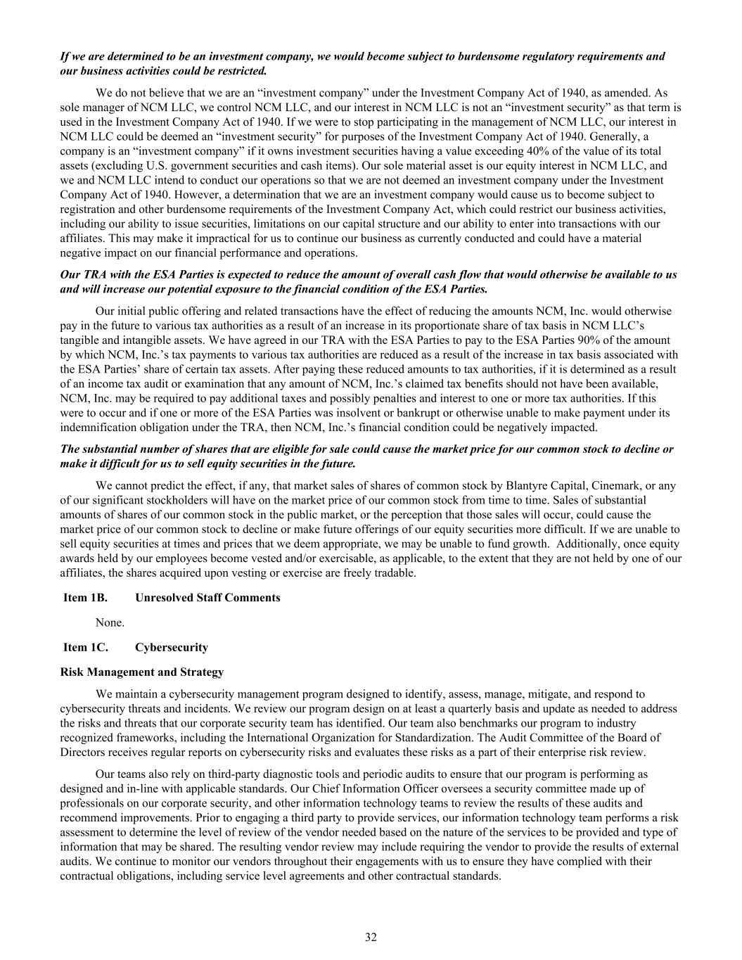 If we are determined to be an investment company, we would become subject to burdensome regulatory requirements and our business activities could be restricted. We do not believe that we are an “investment company” under the Investment Company Act of 1940, as amended. As sole manager of NCM LLC, we control NCM LLC, and our interest in NCM LLC is not an “investment security” as that term is used in the Investment Company Act of 1940. If we were to stop participating in the management of NCM LLC, our interest in NCM LLC could be deemed an “investment security” for purposes of the Investment Company Act of 1940. Generally, a company is an “investment company” if it owns investment securities having a value exceeding 40% of the value of its total assets (excluding U.S. government securities and cash items). Our sole material asset is our equity interest in NCM LLC, and we and NCM LLC intend to conduct our operations so that we are not deemed an investment company under the Investment Company Act of 1940. However, a determination that we are an investment company would cause us to become subject to registration and other burdensome requirements of the Investment Company Act, which could restrict our business activities, including our ability to issue securities, limitations on our capital structure and our ability to enter into transactions with our affiliates. This may make it impractical for us to continue our business as currently conducted and could have a material negative impact on our financial performance and operations. Our TRA with the ESA Parties is expected to reduce the amount of overall cash flow that would otherwise be available to us and will increase our potential exposure to the financial condition of the ESA Parties. Our initial public offering and related transactions have the effect of reducing the amounts NCM, Inc. would otherwise pay in the future to various tax authorities as a result of an increase in its proportionate share of tax basis in NCM LLC’s tangible and intangible assets. We have agreed in our TRA with the ESA Parties to pay to the ESA Parties 90% of the amount by which NCM, Inc.’s tax payments to various tax authorities are reduced as a result of the increase in tax basis associated with the ESA Parties’ share of certain tax assets. After paying these reduced amounts to tax authorities, if it is determined as a result of an income tax audit or examination that any amount of NCM, Inc.’s claimed tax benefits should not have been available, NCM, Inc. may be required to pay additional taxes and possibly penalties and interest to one or more tax authorities. If this were to occur and if one or more of the ESA Parties was insolvent or bankrupt or otherwise unable to make payment under its indemnification obligation under the TRA, then NCM, Inc.’s financial condition could be negatively impacted. The substantial number of shares that are eligible for sale could cause the market price for our common stock to decline or make it difficult for us to sell equity securities in the future. We cannot predict the effect, if any, that market sales of shares of common stock by Blantyre Capital, Cinemark, or any of our significant stockholders will have on the market price of our common stock from time to time. Sales of substantial amounts of shares of our common stock in the public market, or the perception that those sales will occur, could cause the market price of our common stock to decline or make future offerings of our equity securities more difficult. If we are unable to sell equity securities at times and prices that we deem appropriate, we may be unable to fund growth. Additionally, once equity awards held by our employees become vested and/or exercisable, as applicable, to the extent that they are not held by one of our affiliates, the shares acquired upon vesting or exercise are freely tradable. Item 1B. Unresolved Staff Comments None. Item 1C. Cybersecurity Risk Management and Strategy We maintain a cybersecurity management program designed to identify, assess, manage, mitigate, and respond to cybersecurity threats and incidents. We review our program design on at least a quarterly basis and update as needed to address the risks and threats that our corporate security team has identified. Our team also benchmarks our program to industry recognized frameworks, including the International Organization for Standardization. The Audit Committee of the Board of Directors receives regular reports on cybersecurity risks and evaluates these risks as a part of their enterprise risk review. Our teams also rely on third-party diagnostic tools and periodic audits to ensure that our program is performing as designed and in-line with applicable standards. Our Chief Information Officer oversees a security committee made up of professionals on our corporate security, and other information technology teams to review the results of these audits and recommend improvements. Prior to engaging a third party to provide services, our information technology team performs a risk assessment to determine the level of review of the vendor needed based on the nature of the services to be provided and type of information that may be shared. The resulting vendor review may include requiring the vendor to provide the results of external audits. We continue to monitor our vendors throughout their engagements with us to ensure they have complied with their contractual obligations, including service level agreements and other contractual standards. 32