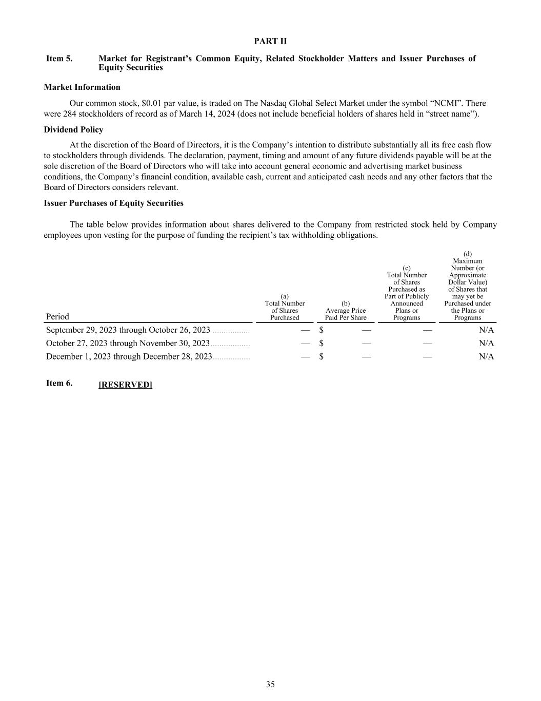PART II Item 5. Market for Registrant’s Common Equity, Related Stockholder Matters and Issuer Purchases of Equity Securities Market Information Our common stock, $0.01 par value, is traded on The Nasdaq Global Select Market under the symbol “NCMI”. There were 284 stockholders of record as of March 14, 2024 (does not include beneficial holders of shares held in “street name”). Dividend Policy At the discretion of the Board of Directors, it is the Company’s intention to distribute substantially all its free cash flow to stockholders through dividends. The declaration, payment, timing and amount of any future dividends payable will be at the sole discretion of the Board of Directors who will take into account general economic and advertising market business conditions, the Company’s financial condition, available cash, current and anticipated cash needs and any other factors that the Board of Directors considers relevant. Issuer Purchases of Equity Securities The table below provides information about shares delivered to the Company from restricted stock held by Company employees upon vesting for the purpose of funding the recipient’s tax withholding obligations. Period (a) Total Number of Shares Purchased (b) Average Price Paid Per Share (c) Total Number of Shares Purchased as Part of Publicly Announced Plans or Programs (d) Maximum Number (or Approximate Dollar Value) of Shares that may yet be Purchased under the Plans or Programs September 29, 2023 through October 26, 2023 ................. — $ — — N/A October 27, 2023 through November 30, 2023 .................. — $ — — N/A December 1, 2023 through December 28, 2023 ................. — $ — — N/A Item 6. [RESERVED] 35