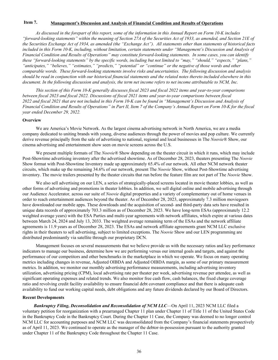 Item 7. Management’s Discussion and Analysis of Financial Condition and Results of Operations As discussed in the forepart of this report, some of the information in this Annual Report on Form 10-K includes “forward-looking statements” within the meaning of Section 27A of the Securities Act of 1933, as amended, and Section 21E of the Securities Exchange Act of 1934, as amended (the “Exchange Act”). All statements other than statements of historical facts included in this Form 10-K, including, without limitation, certain statements under “Management’s Discussion and Analysis of Financial Condition and Results of Operations” may constitute forward-looking statements. In some cases, you can identify these “forward-looking statements” by the specific words, including but not limited to “may,” “should,” “expects,” “plans,” “anticipates,” “believes,” “estimates,” “predicts,” “potential” or “continue” or the negative of those words and other comparable words. These forward-looking statements involve risks and uncertainties. The following discussion and analysis should be read in conjunction with our historical financial statements and the related notes thereto included elsewhere in this document. In the following discussion and analysis, the term net income refers to net income attributable to NCM, Inc. This section of this Form 10-K generally discusses fiscal 2023 and fiscal 2022 items and year-to-year comparisons between fiscal 2023 and fiscal 2022. Discussions of fiscal 2021 items and year-to-year comparisons between fiscal 2022 and fiscal 2021 that are not included in this Form 10-K can be found in “Management’s Discussion and Analysis of Financial Condition and Results of Operations” in Part II, Item 7 of the Company’s Annual Report on Form 10-K for the fiscal year ended December 29, 2022. Overview We are America’s Movie Network. As the largest cinema advertising network in North America, we are a media company dedicated to uniting brands with young, diverse audiences through the power of movies and pop culture. We currently derive revenue principally from the sale of advertising to national, regional and local businesses in The Noovie® Show, our cinema advertising and entertainment show seen on movie screens across the U.S. We present multiple formats of The Noovie® Show depending on the theater circuit in which it runs, which may include Post-Showtime advertising inventory after the advertised showtime. As of December 28, 2023, theaters presenting The Noovie Show format with Post-Showtime Inventory made up approximately 65.4% of our network. All other NCM network theater circuits, which make up the remaining 34.6% of our network, present The Noovie Show, without Post-Showtime advertising inventory. The movie trailers presented by the theater circuits that run before the feature film are not part of The Noovie Show. We also sell advertising on our LEN, a series of strategically-placed screens located in movie theater lobbies, as well as other forms of advertising and promotions in theater lobbies. In addition, we sell digital online and mobile advertising through our Audience Accelerator, across our suite of Noovie digital properties and a variety of complementary out of home venues in order to reach entertainment audiences beyond the theater. As of December 28, 2023, approximately 7.3 million moviegoers have downloaded our mobile apps. These downloads and the acquisition of second- and third-party data sets have resulted in unique data records of approximately 703.3 million as of December 28, 2023. We have long-term ESAs (approximately 12.2 weighted average years) with the ESA Parties and multi-year agreements with network affiliates, which expire at various dates between March 24, 2024 and July 13, 2033. The weighted average remaining term of the ESAs and the network affiliate agreements is 11.9 years as of December 28, 2023. The ESAs and network affiliate agreements grant NCM LLC exclusive rights in their theaters to sell advertising, subject to limited exceptions. The Noovie Show and our LEN programming are distributed predominantly via satellite through our proprietary DCN. Management focuses on several measurements that we believe provide us with the necessary ratios and key performance indicators to manage our business, determine how we are performing versus our internal goals and targets, and against the performance of our competitors and other benchmarks in the marketplace in which we operate. We focus on many operating metrics including changes in revenue, Adjusted OIBDA and Adjusted OIBDA margin, as some of our primary measurement metrics. In addition, we monitor our monthly advertising performance measurements, including advertising inventory utilization, advertising pricing (CPM), local advertising rate per theater per week, advertising revenue per attendee, as well as significant operating expenses and related trends. We also monitor free cash flow, cash balances, the fixed charge coverage ratio and revolving credit facility availability to ensure financial debt covenant compliance and that there is adequate cash availability to fund our working capital needs, debt obligations and any future dividends declared by our Board of Directors. Recent Developments Bankruptcy Filing, Deconsolidation and Reconsolidation of NCM LLC—On April 11, 2023 NCM LLC filed a voluntary petition for reorganization with a prearranged Chapter 11 plan under Chapter 11 of Title 11 of the United States Code in the Bankruptcy Code in the Bankruptcy Court. During the Chapter 11 Case, the Company was deemed to no longer control NCM LLC for accounting purposes and NCM LLC was deconsolidated from the Company’s financial statements prospectively as of April 11, 2023. We continued to operate as the manager of the debtor-in-possession pursuant to the authority granted under Chapter 11 of the Bankruptcy Code throughout the Chapter 11 Ca