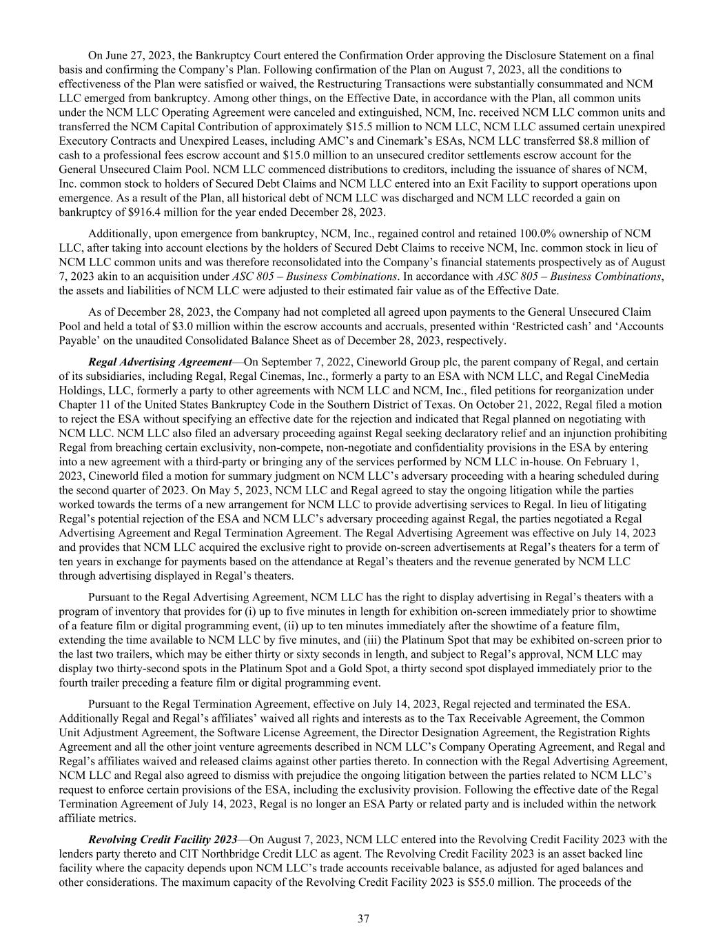 On June 27, 2023, the Bankruptcy Court entered the Confirmation Order approving the Disclosure Statement on a final basis and confirming the Company’s Plan. Following confirmation of the Plan on August 7, 2023, all the conditions to effectiveness of the Plan were satisfied or waived, the Restructuring Transactions were substantially consummated and NCM LLC emerged from bankruptcy. Among other things, on the Effective Date, in accordance with the Plan, all common units under the NCM LLC Operating Agreement were canceled and extinguished, NCM, Inc. received NCM LLC common units and transferred the NCM Capital Contribution of approximately $15.5 million to NCM LLC, NCM LLC assumed certain unexpired Executory Contracts and Unexpired Leases, including AMC’s and Cinemark’s ESAs, NCM LLC transferred $8.8 million of cash to a professional fees escrow account and $15.0 million to an unsecured creditor settlements escrow account for the General Unsecured Claim Pool. NCM LLC commenced distributions to creditors, including the issuance of shares of NCM, Inc. common stock to holders of Secured Debt Claims and NCM LLC entered into an Exit Facility to support operations upon emergence. As a result of the Plan, all historical debt of NCM LLC was discharged and NCM LLC recorded a gain on bankruptcy of $916.4 million for the year ended December 28, 2023. Additionally, upon emergence from bankruptcy, NCM, Inc., regained control and retained 100.0% ownership of NCM LLC, after taking into account elections by the holders of Secured Debt Claims to receive NCM, Inc. common stock in lieu of NCM LLC common units and was therefore reconsolidated into the Company’s financial statements prospectively as of August 7, 2023 akin to an acquisition under ASC 805 – Business Combinations. In accordance with ASC 805 – Business Combinations, the assets and liabilities of NCM LLC were adjusted to their estimated fair value as of the Effective Date. As of December 28, 2023, the Company had not completed all agreed upon payments to the General Unsecured Claim Pool and held a total of $3.0 million within the escrow accounts and accruals, presented within ‘Restricted cash’ and ‘Accounts Payable’ on the unaudited Consolidated Balance Sheet as of December 28, 2023, respectively. Regal Advertising Agreement—On September 7, 2022, Cineworld Group plc, the parent company of Regal, and certain of its subsidiaries, including Regal, Regal Cinemas, Inc., formerly a party to an ESA with NCM LLC, and Regal CineMedia Holdings, LLC, formerly a party to other agreements with NCM LLC and NCM, Inc., filed petitions for reorganization under Chapter 11 of the United States Bankruptcy Code in the Southern District of Texas. On October 21, 2022, Regal filed a motion to reject the ESA without specifying an effective date for the rejection and indicated that Regal planned on negotiating with NCM LLC. NCM LLC also filed an adversary proceeding against Regal seeking declaratory relief and an injunction prohibiting Regal from breaching certain exclusivity, non-compete, non-negotiate and confidentiality provisions in the ESA by entering into a new agreement with a third-party or bringing any of the services performed by NCM LLC in-house. On February 1, 2023, Cineworld filed a motion for summary judgment on NCM LLC’s adversary proceeding with a hearing scheduled during the second quarter of 2023. On May 5, 2023, NCM LLC and Regal agreed to stay the ongoing litigation while the parties worked towards the terms of a new arrangement for NCM LLC to provide advertising services to Regal. In lieu of litigating Regal’s potential rejection of the ESA and NCM LLC’s adversary proceeding against Regal, the parties negotiated a Regal Advertising Agreement and Regal Termination Agreement. The Regal Advertising Agreement was effective on July 14, 2023 and provides that NCM LLC acquired the exclusive right to provide on-screen advertisements at Regal’s theaters for a term of ten years in exchange for payments based on the attendance at Regal’s theaters and the revenue generated by NCM LLC through advertising displayed in Regal’s theaters. Pursuant to the Regal Advertising Agreement, NCM LLC has the right to display advertising in Regal’s theaters with a program of inventory that provides for (i) up to five minutes in length for exhibition on-screen immediately prior to showtime of a feature film or digital programming event, (ii) up to ten minutes immediately after the showtime of a feature film, extending the time available to NCM LLC by five minutes, and (iii) the Platinum Spot that may be exhibited on-screen prior to the last two trailers, which may be either thirty or sixty seconds in length, and subject to Regal’s approval, NCM LLC may display two thirty-second spots in the Platinum Spot and a Gold Spot, a thirty second spot displayed immediately prior to the fourth trailer preceding a feature film or digital programming event. Pursuant to the Regal Termination Agreement, effective on July 14, 2023, Regal rejected and terminated the ESA. Additionally Regal and Regal’s affiliates’ waived all rights and interests as to the Tax Receivable Agreement, the Common Unit Adjustment Agreement, the Software License Agreement, the Director Designation Agreement, the Registration Rights Agreement and all the other joint venture agreements described in NCM LLC’s Company Operating Agreement, and Regal and Regal’s affiliates waived and released claims against other parties thereto. In connection with the Regal Advertising Agreement, NCM LLC and Regal also agreed to dismiss with prejudice the ongoing litigation between the parties related to NCM LLC’s request to enforce certain provisions of the ESA, including the exclusivity provision. Following the effective date of the Regal Termination Agreement of July 14, 2023, Regal is no longer an ESA Party or related party and is included within the network affiliate metrics. Revolving Credit 