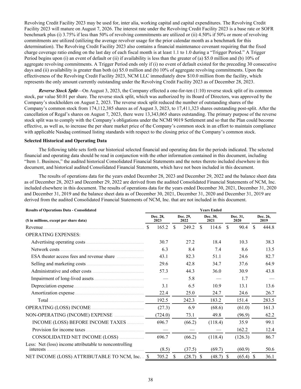 Revolving Credit Facility 2023 may be used for, inter alia, working capital and capital expenditures. The Revolving Credit Facility 2023 will mature on August 7, 2026. The interest rate under the Revolving Credit Facility 2023 is a base rate or SOFR benchmark plus (i) 3.75% if less than 50% of revolving commitments are utilized or (ii) 4.50% if 50% or more of revolving commitments are utilized (utilizing the average revolver usage for the prior calendar month as a benchmark for this determination). The Revolving Credit Facility 2023 also contains a financial maintenance covenant requiring that the fixed charge coverage ratio ending on the last day of each fiscal month is at least 1.1 to 1.0 during a “Trigger Period.” A Trigger Period begins upon (i) an event of default or (ii) if availability is less than the greater of (a) $5.0 million and (b) 10% of aggregate revolving commitments. A Trigger Period ends only if (i) no event of default existed for the preceding 30 consecutive days and (ii) availability is greater than both (a) $5.0 million and (b) 10% of aggregate revolving commitments. Upon the effectiveness of the Revolving Credit Facility 2023, NCM LLC immediately drew $10.0 million from the facility, which represents the only amount currently outstanding under the Revolving Credit Facility 2023 as of December 28, 2023. Reverse Stock Split—On August 3, 2023, the Company effected a one-for-ten (1:10) reverse stock split of its common stock, par value $0.01 per share. The reverse stock split, which was authorized by its Board of Directors, was approved by the Company’s stockholders on August 2, 2023. The reverse stock split reduced the number of outstanding shares of the Company’s common stock from 174,112,385 shares as of August 3, 2023, to 17,411,323 shares outstanding post-split. After the cancellation of Regal’s shares on August 7, 2023, there were 13,343,065 shares outstanding. The primary purpose of the reverse stock split was to comply with the Company’s obligations under the NCMI 9019 Settlement and so that the Plan could become effective, as well as, to increase the per share market price of the Company’s common stock in an effort to maintain compliance with applicable Nasdaq continued listing standards with respect to the closing price of the Company’s common stock. Selected Historical and Operating Data The following table sets forth our historical selected financial and operating data for the periods indicated. The selected financial and operating data should be read in conjunction with the other information contained in this document, including “Item 1. Business,” the audited historical Consolidated Financial Statements and the notes thereto included elsewhere in this document, and historical audited Consolidated Financial Statements, which have not been included in this document. The results of operations data for the years ended December 28, 2023 and December 29, 2022 and the balance sheet data as of December 28, 2023 and December 29, 2022 are derived from the audited Consolidated Financial Statements of NCM, Inc. included elsewhere in this document. The results of operations data for the years ended December 30, 2021, December 31, 2020 and December 31, 2019 and the balance sheet data as of December 30, 2021, December 31, 2020 and December 31, 2019 are derived from the audited Consolidated Financial Statements of NCM, Inc. that are not included in this document. Results of Operations Data - Consolidated Years Ended ($ in millions, except per share data) Dec. 28, 2023 Dec. 29, 2022 Dec. 30, 2021 Dec. 31, 2020 Dec. 26, 2019 Revenue .................................................................................. $ 165.2 $ 249.2 $ 114.6 $ 90.4 $ 444.8 OPERATING EXPENSES: Advertising operating costs ............................................... 30.7 27.2 18.4 10.3 38.3 Network costs .................................................................... 6.3 8.4 7.4 8.6 13.5 ESA theater access fees and revenue share ...................... 43.1 82.3 51.1 24.6 82.7 Selling and marketing costs ............................................... 29.6 42.8 34.7 37.6 64.9 Administrative and other costs .......................................... 57.3 44.3 36.0 30.9 43.8 Impairment of long-lived assets ......................................... — 5.8 — 1.7 — Depreciation expense ......................................................... 3.1 6.5 10.9 13.1 13.6 Amortization expense ........................................................ 22.4 25.0 24.7 24.6 26.7 Total ............................................................................. 192.5 242.3 183.2 151.4 283.5 OPERATING (LOSS) INCOME ........................................... (27.3) 6.9 (68.6) (61.0) 161.3 NON-OPERATING (INCOME) EXPENSE ........................ (724.0) 73.1 49.8 (96.9) 62.2 INCOME (LOSS) BEFORE INCOME TAXES .............. 696.7 (66.2) (118.4) 35.9 99.1 Provision for income taxes ............................................... — — — 162.2 12.4 CONSOLIDATED NET INCOME (LOSS) .................... 696.7 (66.2) (118.4) (126.3) 86.7 Less: Net (loss) income attributable to noncontrolling interests ............................................................................... (8.5) (37.5) (69.7) (60.9) 50.6 NET INCOME (LOSS) ATTRIBUTABLE TO NCM, Inc. .. $ 705.2 $ (28.7) $ (48.7) $ (65.4) $ 36.1 38