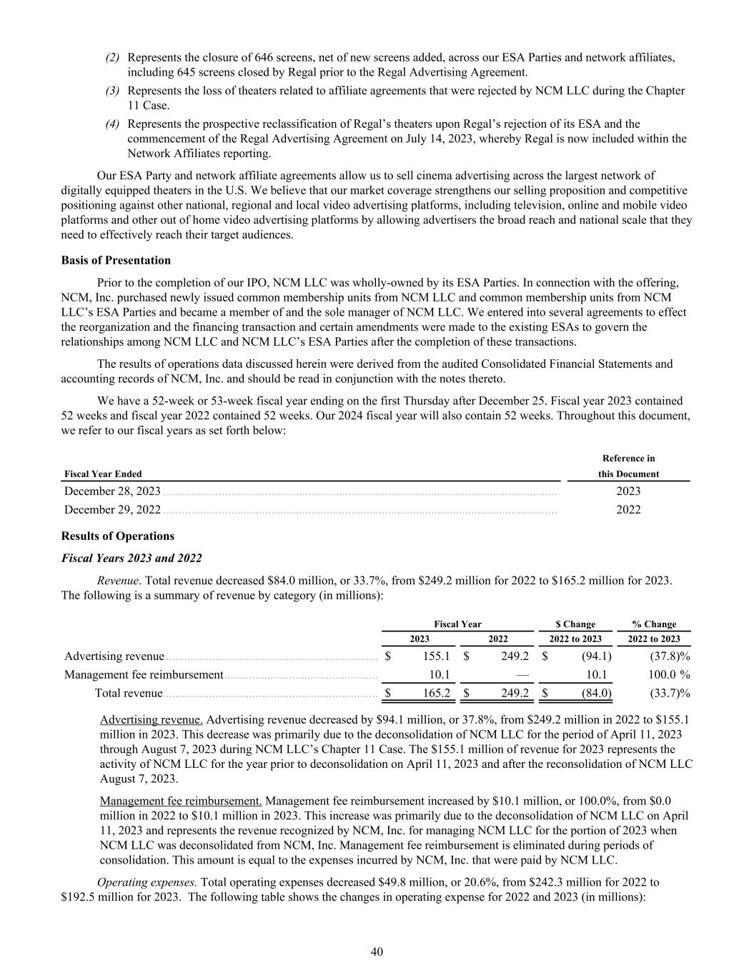 (2) Represents the closure of 646 screens, net of new screens added, across our ESA Parties and network affiliates, including 645 screens closed by Regal prior to the Regal Advertising Agreement. (3) Represents the loss of theaters related to affiliate agreements that were rejected by NCM LLC during the Chapter 11 Case. (4) Represents the prospective reclassification of Regal’s theaters upon Regal’s rejection of its ESA and the commencement of the Regal Advertising Agreement on July 14, 2023, whereby Regal is now included within the Network Affiliates reporting. Our ESA Party and network affiliate agreements allow us to sell cinema advertising across the largest network of digitally equipped theaters in the U.S. We believe that our market coverage strengthens our selling proposition and competitive positioning against other national, regional and local video advertising platforms, including television, online and mobile video platforms and other out of home video advertising platforms by allowing advertisers the broad reach and national scale that they need to effectively reach their target audiences. Basis of Presentation Prior to the completion of our IPO, NCM LLC was wholly-owned by its ESA Parties. In connection with the offering, NCM, Inc. purchased newly issued common membership units from NCM LLC and common membership units from NCM LLC’s ESA Parties and became a member of and the sole manager of NCM LLC. We entered into several agreements to effect the reorganization and the financing transaction and certain amendments were made to the existing ESAs to govern the relationships among NCM LLC and NCM LLC’s ESA Parties after the completion of these transactions. The results of operations data discussed herein were derived from the audited Consolidated Financial Statements and accounting records of NCM, Inc. and should be read in conjunction with the notes thereto. We have a 52-week or 53-week fiscal year ending on the first Thursday after December 25. Fiscal year 2023 contained 52 weeks and fiscal year 2022 contained 52 weeks. Our 2024 fiscal year will also contain 52 weeks. Throughout this document, we refer to our fiscal years as set forth below: Reference in Fiscal Year Ended this Document December 28, 2023 ................................................................................................................................ 2023 December 29, 2022 ................................................................................................................................ 2022 Results of Operations Fiscal Years 2023 and 2022 Revenue. Total revenue decreased $84.0 million, or 33.7%, from $249.2 million for 2022 to $165.2 million for 2023. The following is a summary of revenue by category (in millions): Fiscal Year $ Change % Change 2023 2022 2022 to 2023 2022 to 2023 Advertising revenue ..................................................................... $ 155.1 $ 249.2 $ (94.1) (37.8) % Management fee reimbursement .................................................. 10.1 — 10.1 100.0 % Total revenue ...................................................................... $ 165.2 $ 249.2 $ (84.0) (33.7) % Advertising revenue. Advertising revenue decreased by $94.1 million, or 37.8%, from $249.2 million in 2022 to $155.1 million in 2023. This decrease was primarily due to the deconsolidation of NCM LLC for the period of April 11, 2023 through August 7, 2023 during NCM LLC’s Chapter 11 Case. The $155.1 million of revenue for 2023 represents the activity of NCM LLC for the year prior to deconsolidation on April 11, 2023 and after the reconsolidation of NCM LLC August 7, 2023. Management fee reimbursement. Management fee reimbursement increased by $10.1 million, or 100.0%, from $0.0 million in 2022 to $10.1 million in 2023. This increase was primarily due to the deconsolidation of NCM LLC on April 11, 2023 and represents the revenue recognized by NCM, Inc. for managing NCM LLC for the portion of 2023 when NCM LLC was deconsolidated from NCM, Inc. Management fee reimbursement is eliminated during periods of consolidation. This amount is equal to the expenses incurred by NCM, Inc. that were paid by NCM LLC. Operating expenses. Total operating expenses decreased $49.8 million, or 20.6%, from $242.3 million for 2022 to $192.5 million for 2023. The following table shows the changes in operating expense for 2022 and 2023 (in millions): 40
