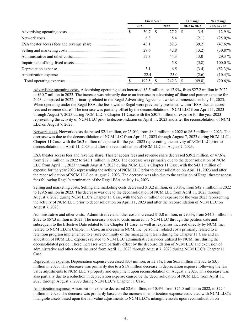 Fiscal Year $ Change % Change 2023 2022 2022 to 2023 2022 to 2023 Advertising operating costs .......................................................... $ 30.7 $ 27.2 $ 3.5 12.9 % Network costs ............................................................................... 6.3 8.4 (2.1) (25.0) % ESA theater access fees and revenue share .................................. 43.1 82.3 (39.2) (47.6) % Selling and marketing costs ......................................................... 29.6 42.8 (13.2) (30.8) % Administrative and other costs ..................................................... 57.3 44.3 13.0 29.3 % Impairment of long-lived assets ................................................... — 5.8 (5.8) 100.0 % Depreciation expense ................................................................... 3.1 6.5 (3.4) (52.3) % Amortization expense .................................................................. 22.4 25.0 (2.6) (10.4) % Total operating expenses ........................................................... $ 192.5 $ 242.3 $ (49.8) (20.6) % Advertising operating costs. Advertising operating costs increased $3.5 million, or 12.9%, from $27.2 million in 2022 to $30.7 million in 2023. The increase was primarily due to an increase in advertising affiliate and partner expense for 2023, compared to 2022, primarily related to the Regal Advertising Agreement which commenced on July 14, 2023. When operating under the Regal ESA, the fees owed to Regal were previously presented within “ESA theater access fees and revenue share”. The increase was partially offset by the deconsolidation of NCM LLC from April 11, 2023 through August 7, 2023 during NCM LLC’s Chapter 11 Case, with the $30.7 million of expense for the year 2023 representing the activity of NCM LLC prior to deconsolidation on April 11, 2023 and after the reconsolidation of NCM LLC on August 7, 2023. Network costs. Network costs decreased $2.1 million, or 25.0%, from $8.4 million in 2022 to $6.3 million in 2023. The decrease was due to the deconsolidation of NCM LLC from April 11, 2023 through August 7, 2023 during NCM LLC’s Chapter 11 Case, with the $6.3 million of expense for the year 2023 representing the activity of NCM LLC prior to deconsolidation on April 11, 2023 and after the reconsolidation of NCM LLC on August 7, 2023. ESA theater access fees and revenue share. Theater access fees and revenue share decreased $39.2 million, or 47.6%, from $82.3 million in 2022 to $43.1 million in 2023. The decrease was primarily due to the deconsolidation of NCM LLC from April 11, 2023 through August 7, 2023 during NCM LLC’s Chapter 11 Case, with the $43.1 million of expense for the year 2023 representing the activity of NCM LLC prior to deconsolidation on April 11, 2023 and after the reconsolidation of NCM LLC on August 7, 2023. The decrease was also due to the exclusion of Regal theater access fees following Regal’s termination of the Regal ESA on July 14, 2023. Selling and marketing costs. Selling and marketing costs decreased $13.2 million, or 30.8%, from $42.8 million in 2022 to $29.6 million in 2023. The decrease was due to the deconsolidation of NCM LLC from April 11, 2023 through August 7, 2023 during NCM LLC’s Chapter 11 Case, with the $29.6 million of expense for the year 2023 representing the activity of NCM LLC prior to deconsolidation on April 11, 2023 and after the reconsolidation of NCM LLC on August 7, 2023. Administrative and other costs. Administrative and other costs increased $13.0 million, or 29.3%, from $44.3 million in 2022 to $57.3 million in 2023. The increase is due to costs incurred by NCM LLC through the petition date and subsequent to the Effective Date related to the Chapter 11 Case, as well as, expenses incurred directly by NCM, Inc. related to NCM LLC’s Chapter 11 Case, an increase in NCM, Inc. personnel related costs primarily related to a retention program implemented to ensure continuity of the management team during the Chapter 11 Case and an allocation of NCM LLC expenses related to NCM LLC administrative services utilized by NCM, Inc. during the deconsolidated period. These increases were partially offset by the deconsolidation of NCM LLC and exclusion of administrative and other costs incurred from April 11, 2023 through August 7, 2023 during NCM LLC’s Chapter 11 Case. Depreciation expense. Depreciation expense decreased $3.4 million, or 52.3%, from $6.5 million in 2022 to $3.1 million in 2023. This decrease was primarily due to a $1.9 million decrease in depreciation expense following the fair value adjustments to NCM LLC’s property and equipment upon reconsolidation on August 7, 2023. This decrease was also partially due to a reduction in depreciation expense caused by the deconsolidation of NCM LLC from April 11, 2023 through August 7, 2023 during NCM LLC’s Chapter 11 Case. Amortization expense. Amortization expense decreased $2.6 million, or 10.4%, from $25.0 million in 2022, to $22.4 million in 2023. The decrease was primarily based on the increase in amortization expense associated with NCM LLC’s intangible assets based upon the fair value adjustments to NCM LLC’s intangible assets upon reconsolidation on 41