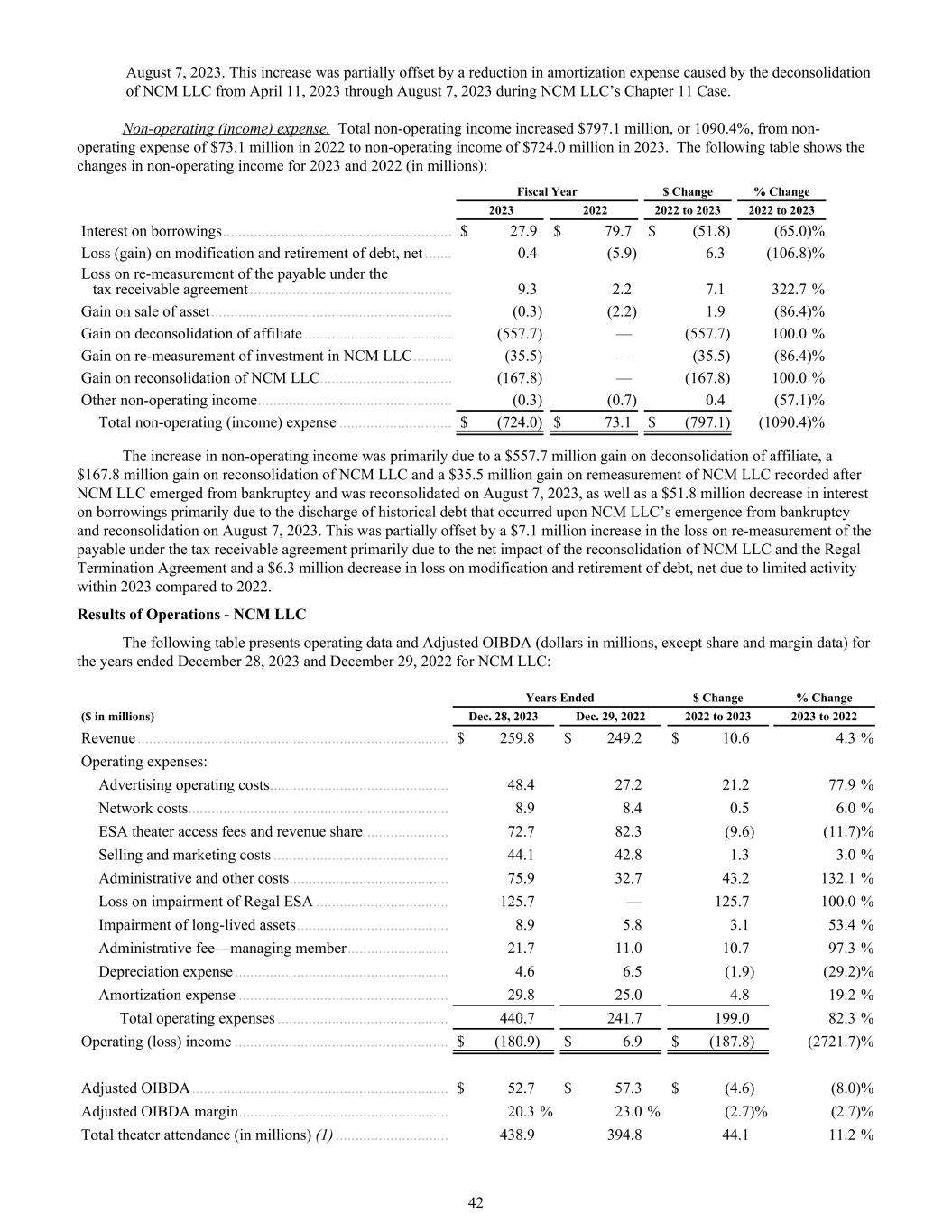 August 7, 2023. This increase was partially offset by a reduction in amortization expense caused by the deconsolidation of NCM LLC from April 11, 2023 through August 7, 2023 during NCM LLC’s Chapter 11 Case. Non-operating (income) expense. Total non-operating income increased $797.1 million, or 1090.4%, from non- operating expense of $73.1 million in 2022 to non-operating income of $724.0 million in 2023. The following table shows the changes in non-operating income for 2023 and 2022 (in millions): Fiscal Year $ Change % Change 2023 2022 2022 to 2023 2022 to 2023 Interest on borrowings ........................................................... $ 27.9 $ 79.7 $ (51.8) (65.0) % Loss (gain) on modification and retirement of debt, net ....... 0.4 (5.9) 6.3 (106.8) % Loss on re-measurement of the payable under the tax receivable agreement .................................................... 9.3 2.2 7.1 322.7 % Gain on sale of asset .............................................................. (0.3) (2.2) 1.9 (86.4) % Gain on deconsolidation of affiliate ...................................... (557.7) — (557.7) 100.0 % Gain on re-measurement of investment in NCM LLC .......... (35.5) — (35.5) (86.4) % Gain on reconsolidation of NCM LLC .................................. (167.8) — (167.8) 100.0 % Other non-operating income .................................................. (0.3) (0.7) 0.4 (57.1) % Total non-operating (income) expense ............................. $ (724.0) $ 73.1 $ (797.1) (1090.4) % The increase in non-operating income was primarily due to a $557.7 million gain on deconsolidation of affiliate, a $167.8 million gain on reconsolidation of NCM LLC and a $35.5 million gain on remeasurement of NCM LLC recorded after NCM LLC emerged from bankruptcy and was reconsolidated on August 7, 2023, as well as a $51.8 million decrease in interest on borrowings primarily due to the discharge of historical debt that occurred upon NCM LLC’s emergence from bankruptcy and reconsolidation on August 7, 2023. This was partially offset by a $7.1 million increase in the loss on re-measurement of the payable under the tax receivable agreement primarily due to the net impact of the reconsolidation of NCM LLC and the Regal Termination Agreement and a $6.3 million decrease in loss on modification and retirement of debt, net due to limited activity within 2023 compared to 2022. Results of Operations - NCM LLC The following table presents operating data and Adjusted OIBDA (dollars in millions, except share and margin data) for the years ended December 28, 2023 and December 29, 2022 for NCM LLC: Years Ended $ Change % Change ($ in millions) Dec. 28, 2023 Dec. 29, 2022 2022 to 2023 2023 to 2022 Revenue ................................................................................ $ 259.8 $ 249.2 $ 10.6 4.3 % Operating expenses: Advertising operating costs .............................................. 48.4 27.2 21.2 77.9 % Network costs ................................................................... 8.9 8.4 0.5 6.0 % ESA theater access fees and revenue share ...................... 72.7 82.3 (9.6) (11.7) % Selling and marketing costs ............................................. 44.1 42.8 1.3 3.0 % Administrative and other costs ......................................... 75.9 32.7 43.2 132.1 % Loss on impairment of Regal ESA .................................. 125.7 — 125.7 100.0 % Impairment of long-lived assets ....................................... 8.9 5.8 3.1 53.4 % Administrative fee—managing member .......................... 21.7 11.0 10.7 97.3 % Depreciation expense ....................................................... 4.6 6.5 (1.9) (29.2) % Amortization expense ...................................................... 29.8 25.0 4.8 19.2 % Total operating expenses ............................................ 440.7 241.7 199.0 82.3 % Operating (loss) income ....................................................... $ (180.9) $ 6.9 $ (187.8) (2721.7) % Adjusted OIBDA .................................................................. $ 52.7 $ 57.3 $ (4.6) (8.0) % Adjusted OIBDA margin ...................................................... 20.3 % 23.0 % (2.7) % (2.7) % Total theater attendance (in millions) (1) ............................. 438.9 394.8 44.1 11.2 % 42