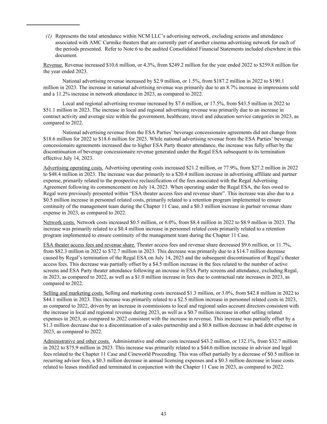 (1) Represents the total attendance within NCM LLC’s advertising network, excluding screens and attendance associated with AMC Carmike theaters that are currently part of another cinema advertising network for each of the periods presented. Refer to Note 6 to the audited Consolidated Financial Statements included elsewhere in this document. Revenue. Revenue increased $10.6 million, or 4.3%, from $249.2 million for the year ended 2022 to $259.8 million for the year ended 2023. National advertising revenue increased by $2.9 million, or 1.5%, from $187.2 million in 2022 to $190.1 million in 2023. The increase in national advertising revenue was primarily due to an 8.7% increase in impressions sold and a 11.2% increase in network attendance in 2023, as compared to 2022. Local and regional advertising revenue increased by $7.6 million, or 17.5%, from $43.5 million in 2022 to $51.1 million in 2023. The increase in local and regional advertising revenue was primarily due to an increase in contract activity and average size within the government, healthcare, travel and education service categories in 2023, as compared to 2022. National advertising revenue from the ESA Parties’ beverage concessionaire agreements did not change from $18.6 million for 2022 to $18.6 million for 2023. While national advertising revenue from the ESA Parties’ beverage concessionaire agreements increased due to higher ESA Party theater attendance, the increase was fully offset by the discontinuation of beverage concessionaire revenue generated under the Regal ESA subsequent to its termination effective July 14, 2023. Advertising operating costs. Advertising operating costs increased $21.2 million, or 77.9%, from $27.2 million in 2022 to $48.4 million in 2023. The increase was due primarily to a $20.4 million increase in advertising affiliate and partner expense, primarily related to the prospective reclassification of the fees associated with the Regal Advertising Agreement following its commencement on July 14, 2023. When operating under the Regal ESA, the fees owed to Regal were previously presented within “ESA theater access fees and revenue share”. This increase was also due to a $0.5 million increase in personnel related costs, primarily related to a retention program implemented to ensure continuity of the management team during the Chapter 11 Case, and a $0.3 million increase in partner revenue share expense in 2023, as compared to 2022. Network costs. Network costs increased $0.5 million, or 6.0%, from $8.4 million in 2022 to $8.9 million in 2023. The increase was primarily related to a $0.4 million increase in personnel related costs primarily related to a retention program implemented to ensure continuity of the management team during the Chapter 11 Case. ESA theater access fees and revenue share. Theater access fees and revenue share decreased $9.6 million, or 11.7%, from $82.3 million in 2022 to $72.7 million in 2023. This decrease was primarily due to a $14.7 million decrease caused by Regal’s termination of the Regal ESA on July 14, 2023 and the subsequent discontinuation of Regal’s theater access fees. This decrease was partially offset by a $4.5 million increase in the fees related to the number of active screens and ESA Party theater attendance following an increase in ESA Party screens and attendance, excluding Regal, in 2023, as compared to 2022, as well as a $1.0 million increase in fees due to contractual rate increases in 2023, as compared to 2022. Selling and marketing costs. Selling and marketing costs increased $1.3 million, or 3.0%, from $42.8 million in 2022 to $44.1 million in 2023. This increase was primarily related to a $2.5 million increase in personnel related costs in 2023, as compared to 2022, driven by an increase in commissions to local and regional sales account directors consistent with the increase in local and regional revenue during 2023, as well as a $0.7 million increase in other selling related expenses in 2023, as compared to 2022 consistent with the increase in revenue. This increase was partially offset by a $1.3 million decrease due to a discontinuation of a sales partnership and a $0.8 million decrease in bad debt expense in 2023, as compared to 2022. Administrative and other costs. Administrative and other costs increased $43.2 million, or 132.1%, from $32.7 million in 2022 to $75.9 million in 2023. This increase was primarily related to a $44.6 million increase in advisor and legal fees related to the Chapter 11 Case and Cineworld Proceeding. This was offset partially by a decrease of $0.5 million in recurring advisor fees, a $0.3 million decrease in annual licensing expenses and a $0.3 million decrease in lease costs related to leases modified and terminated in conjunction with the Chapter 11 Case in 2023, as compared to 2022. 43