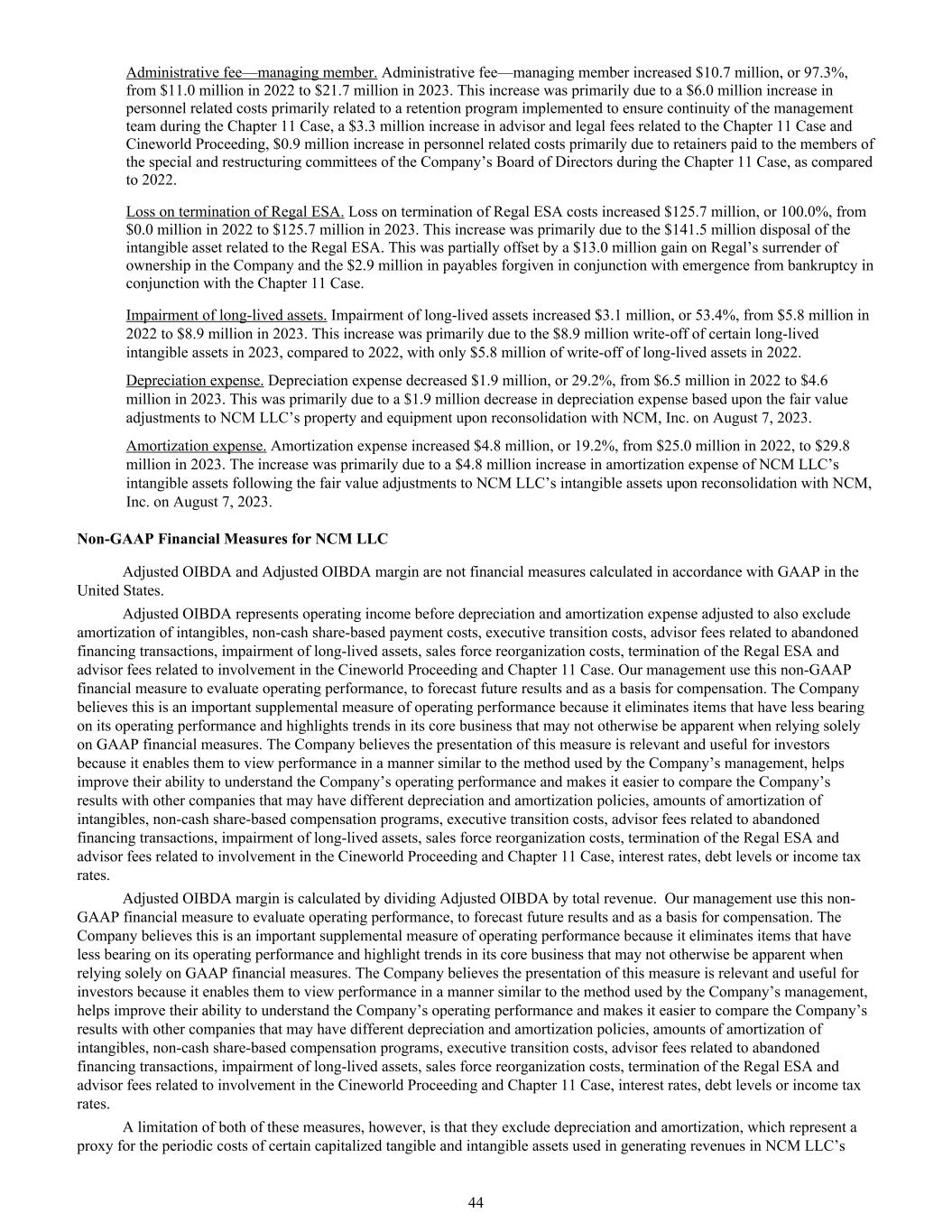 Administrative fee—managing member. Administrative fee—managing member increased $10.7 million, or 97.3%, from $11.0 million in 2022 to $21.7 million in 2023. This increase was primarily due to a $6.0 million increase in personnel related costs primarily related to a retention program implemented to ensure continuity of the management team during the Chapter 11 Case, a $3.3 million increase in advisor and legal fees related to the Chapter 11 Case and Cineworld Proceeding, $0.9 million increase in personnel related costs primarily due to retainers paid to the members of the special and restructuring committees of the Company’s Board of Directors during the Chapter 11 Case, as compared to 2022. Loss on termination of Regal ESA. Loss on termination of Regal ESA costs increased $125.7 million, or 100.0%, from $0.0 million in 2022 to $125.7 million in 2023. This increase was primarily due to the $141.5 million disposal of the intangible asset related to the Regal ESA. This was partially offset by a $13.0 million gain on Regal’s surrender of ownership in the Company and the $2.9 million in payables forgiven in conjunction with emergence from bankruptcy in conjunction with the Chapter 11 Case. Impairment of long-lived assets. Impairment of long-lived assets increased $3.1 million, or 53.4%, from $5.8 million in 2022 to $8.9 million in 2023. This increase was primarily due to the $8.9 million write-off of certain long-lived intangible assets in 2023, compared to 2022, with only $5.8 million of write-off of long-lived assets in 2022. Depreciation expense. Depreciation expense decreased $1.9 million, or 29.2%, from $6.5 million in 2022 to $4.6 million in 2023. This was primarily due to a $1.9 million decrease in depreciation expense based upon the fair value adjustments to NCM LLC’s property and equipment upon reconsolidation with NCM, Inc. on August 7, 2023. Amortization expense. Amortization expense increased $4.8 million, or 19.2%, from $25.0 million in 2022, to $29.8 million in 2023. The increase was primarily due to a $4.8 million increase in amortization expense of NCM LLC’s intangible assets following the fair value adjustments to NCM LLC’s intangible assets upon reconsolidation with NCM, Inc. on August 7, 2023. Non-GAAP Financial Measures for NCM LLC Adjusted OIBDA and Adjusted OIBDA margin are not financial measures calculated in accordance with GAAP in the United States. Adjusted OIBDA represents operating income before depreciation and amortization expense adjusted to also exclude amortization of intangibles, non-cash share-based payment costs, executive transition costs, advisor fees related to abandoned financing transactions, impairment of long-lived assets, sales force reorganization costs, termination of the Regal ESA and advisor fees related to involvement in the Cineworld Proceeding and Chapter 11 Case. Our management use this non-GAAP financial measure to evaluate operating performance, to forecast future results and as a basis for compensation. The Company believes this is an important supplemental measure of operating performance because it eliminates items that have less bearing on its operating performance and highlights trends in its core business that may not otherwise be apparent when relying solely on GAAP financial measures. The Company believes the presentation of this measure is relevant and useful for investors because it enables them to view performance in a manner similar to the method used by the Company’s management, helps improve their ability to understand the Company’s operating performance and makes it easier to compare the Company’s results with other companies that may have different depreciation and amortization policies, amounts of amortization of intangibles, non-cash share-based compensation programs, executive transition costs, advisor fees related to abandoned financing transactions, impairment of long-lived assets, sales force reorganization costs, termination of the Regal ESA and advisor fees related to involvement in the Cineworld Proceeding and Chapter 11 Case, interest rates, debt levels or income tax rates. Adjusted OIBDA margin is calculated by dividing Adjusted OIBDA by total revenue. Our management use this non- GAAP financial measure to evaluate operating performance, to forecast future results and as a basis for compensation. The Company believes this is an important supplemental measure of operating performance because it eliminates items that have less bearing on its operating performance and highlight trends in its core business that may not otherwise be apparent when relying solely on GAAP financial measures. The Company believes the presentation of this measure is relevant and useful for investors because it enables them to view performance in a manner similar to the method used by the Company’s management, helps improve their ability to understand the Company’s operating performance and makes it easier to compare the Company’s results with other companies that may have different depreciation and amortization policies, amounts of amortization of intangibles, non-cash share-based compensation programs, executive transition costs, advisor fees related to abandoned financing transactions, impairment of long-lived assets, sales force reorganization costs, termination of the Regal ESA and advisor fees related to involvement in the Cineworld Proceeding and Chapter 11 Case, interest rates, debt levels or income tax rates. A limitation of both of these measures, however, is that they exclude depreciation and amortization, which represent a proxy for the periodic costs of certain capitalized tangible and intangible assets used in generating revenues in NCM LLC’s 44