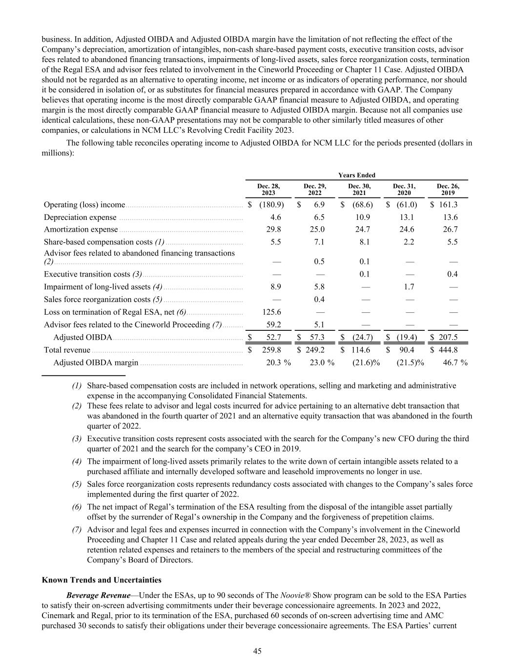 business. In addition, Adjusted OIBDA and Adjusted OIBDA margin have the limitation of not reflecting the effect of the Company’s depreciation, amortization of intangibles, non-cash share-based payment costs, executive transition costs, advisor fees related to abandoned financing transactions, impairments of long-lived assets, sales force reorganization costs, termination of the Regal ESA and advisor fees related to involvement in the Cineworld Proceeding or Chapter 11 Case. Adjusted OIBDA should not be regarded as an alternative to operating income, net income or as indicators of operating performance, nor should it be considered in isolation of, or as substitutes for financial measures prepared in accordance with GAAP. The Company believes that operating income is the most directly comparable GAAP financial measure to Adjusted OIBDA, and operating margin is the most directly comparable GAAP financial measure to Adjusted OIBDA margin. Because not all companies use identical calculations, these non-GAAP presentations may not be comparable to other similarly titled measures of other companies, or calculations in NCM LLC’s Revolving Credit Facility 2023. The following table reconciles operating income to Adjusted OIBDA for NCM LLC for the periods presented (dollars in millions): Years Ended Dec. 28, 2023 Dec. 29, 2022 Dec. 30, 2021 Dec. 31, 2020 Dec. 26, 2019 Operating (loss) income ........................................................ $ (180.9) $ 6.9 $ (68.6) $ (61.0) $ 161.3 Depreciation expense ........................................................... 4.6 6.5 10.9 13.1 13.6 Amortization expense ........................................................... 29.8 25.0 24.7 24.6 26.7 Share-based compensation costs (1) ..................................... 5.5 7.1 8.1 2.2 5.5 Advisor fees related to abandoned financing transactions (2) .......................................................................................... — 0.5 0.1 — — Executive transition costs (3) ................................................ — — 0.1 — 0.4 Impairment of long-lived assets (4) ...................................... 8.9 5.8 — 1.7 — Sales force reorganization costs (5) ...................................... — 0.4 — — — Loss on termination of Regal ESA, net (6) ........................... 125.6 — — — — Advisor fees related to the Cineworld Proceeding (7) .......... 59.2 5.1 — — — Adjusted OIBDA .............................................................. $ 52.7 $ 57.3 $ (24.7) $ (19.4) $ 207.5 Total revenue ........................................................................ $ 259.8 $ 249.2 $ 114.6 $ 90.4 $ 444.8 Adjusted OIBDA margin ................................................. 20.3 % 23.0 % (21.6) % (21.5) % 46.7 % (1) Share-based compensation costs are included in network operations, selling and marketing and administrative expense in the accompanying Consolidated Financial Statements. (2) These fees relate to advisor and legal costs incurred for advice pertaining to an alternative debt transaction that was abandoned in the fourth quarter of 2021 and an alternative equity transaction that was abandoned in the fourth quarter of 2022. (3) Executive transition costs represent costs associated with the search for the Company’s new CFO during the third quarter of 2021 and the search for the company’s CEO in 2019. (4) The impairment of long-lived assets primarily relates to the write down of certain intangible assets related to a purchased affiliate and internally developed software and leasehold improvements no longer in use. (5) Sales force reorganization costs represents redundancy costs associated with changes to the Company’s sales force implemented during the first quarter of 2022. (6) The net impact of Regal’s termination of the ESA resulting from the disposal of the intangible asset partially offset by the surrender of Regal’s ownership in the Company and the forgiveness of prepetition claims. (7) Advisor and legal fees and expenses incurred in connection with the Company’s involvement in the Cineworld Proceeding and Chapter 11 Case and related appeals during the year ended December 28, 2023, as well as retention related expenses and retainers to the members of the special and restructuring committees of the Company’s Board of Directors. Known Trends and Uncertainties Beverage Revenue—Under the ESAs, up to 90 seconds of The Noovie® Show program can be sold to the ESA Parties to satisfy their on-screen advertising commitments under their beverage concessionaire agreements. In 2023 and 2022, Cinemark and Regal, prior to its termination of the ESA, purchased 60 seconds of on-screen advertising time and AMC purchased 30 seconds to satisfy their obligations under their beverage concessionaire agreements. The ESA Parties’ current 45