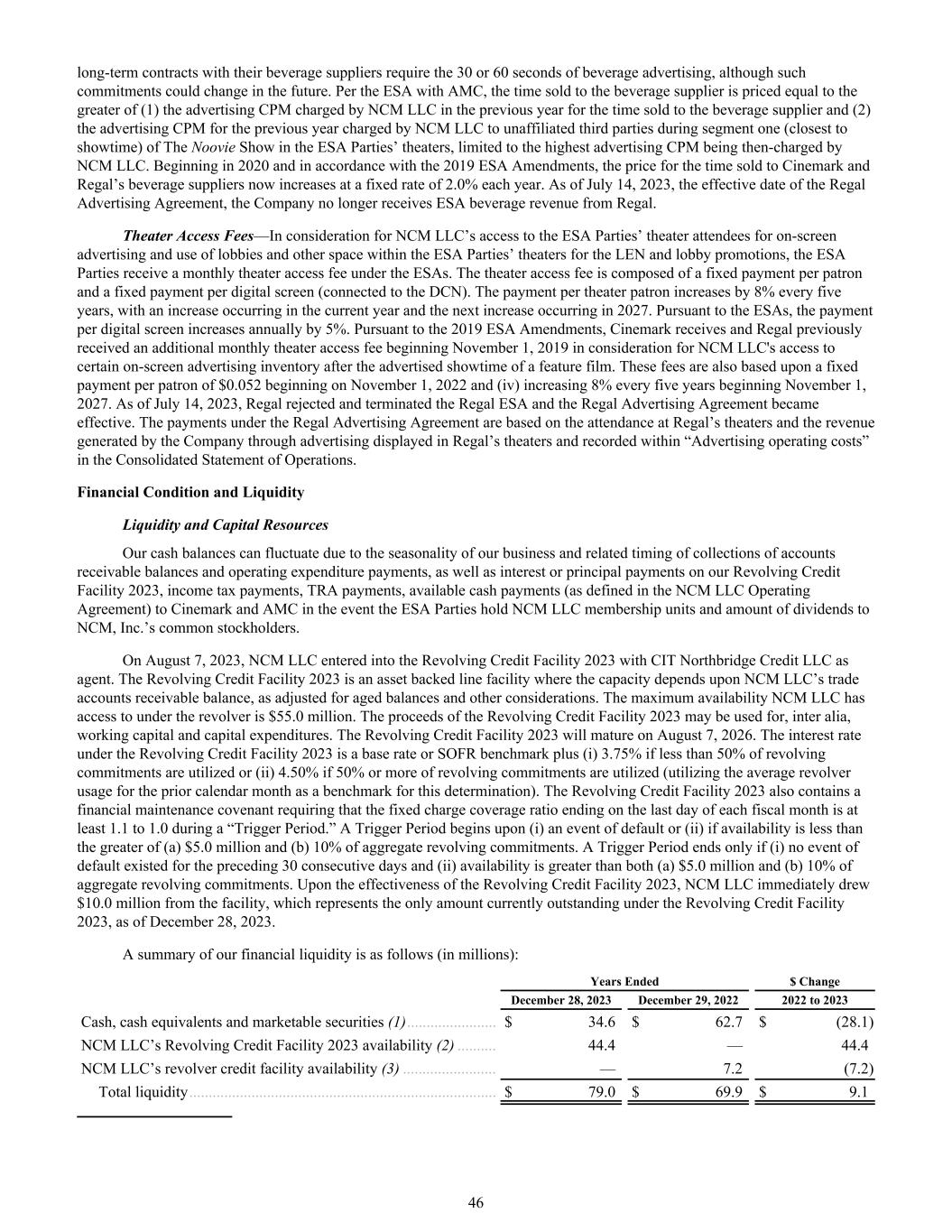 long-term contracts with their beverage suppliers require the 30 or 60 seconds of beverage advertising, although such commitments could change in the future. Per the ESA with AMC, the time sold to the beverage supplier is priced equal to the greater of (1) the advertising CPM charged by NCM LLC in the previous year for the time sold to the beverage supplier and (2) the advertising CPM for the previous year charged by NCM LLC to unaffiliated third parties during segment one (closest to showtime) of The Noovie Show in the ESA Parties’ theaters, limited to the highest advertising CPM being then-charged by NCM LLC. Beginning in 2020 and in accordance with the 2019 ESA Amendments, the price for the time sold to Cinemark and Regal’s beverage suppliers now increases at a fixed rate of 2.0% each year. As of July 14, 2023, the effective date of the Regal Advertising Agreement, the Company no longer receives ESA beverage revenue from Regal. Theater Access Fees—In consideration for NCM LLC’s access to the ESA Parties’ theater attendees for on-screen advertising and use of lobbies and other space within the ESA Parties’ theaters for the LEN and lobby promotions, the ESA Parties receive a monthly theater access fee under the ESAs. The theater access fee is composed of a fixed payment per patron and a fixed payment per digital screen (connected to the DCN). The payment per theater patron increases by 8% every five years, with an increase occurring in the current year and the next increase occurring in 2027. Pursuant to the ESAs, the payment per digital screen increases annually by 5%. Pursuant to the 2019 ESA Amendments, Cinemark receives and Regal previously received an additional monthly theater access fee beginning November 1, 2019 in consideration for NCM LLC's access to certain on-screen advertising inventory after the advertised showtime of a feature film. These fees are also based upon a fixed payment per patron of $0.052 beginning on November 1, 2022 and (iv) increasing 8% every five years beginning November 1, 2027. As of July 14, 2023, Regal rejected and terminated the Regal ESA and the Regal Advertising Agreement became effective. The payments under the Regal Advertising Agreement are based on the attendance at Regal’s theaters and the revenue generated by the Company through advertising displayed in Regal’s theaters and recorded within “Advertising operating costs” in the Consolidated Statement of Operations. Financial Condition and Liquidity Liquidity and Capital Resources Our cash balances can fluctuate due to the seasonality of our business and related timing of collections of accounts receivable balances and operating expenditure payments, as well as interest or principal payments on our Revolving Credit Facility 2023, income tax payments, TRA payments, available cash payments (as defined in the NCM LLC Operating Agreement) to Cinemark and AMC in the event the ESA Parties hold NCM LLC membership units and amount of dividends to NCM, Inc.’s common stockholders. On August 7, 2023, NCM LLC entered into the Revolving Credit Facility 2023 with CIT Northbridge Credit LLC as agent. The Revolving Credit Facility 2023 is an asset backed line facility where the capacity depends upon NCM LLC’s trade accounts receivable balance, as adjusted for aged balances and other considerations. The maximum availability NCM LLC has access to under the revolver is $55.0 million. The proceeds of the Revolving Credit Facility 2023 may be used for, inter alia, working capital and capital expenditures. The Revolving Credit Facility 2023 will mature on August 7, 2026. The interest rate under the Revolving Credit Facility 2023 is a base rate or SOFR benchmark plus (i) 3.75% if less than 50% of revolving commitments are utilized or (ii) 4.50% if 50% or more of revolving commitments are utilized (utilizing the average revolver usage for the prior calendar month as a benchmark for this determination). The Revolving Credit Facility 2023 also contains a financial maintenance covenant requiring that the fixed charge coverage ratio ending on the last day of each fiscal month is at least 1.1 to 1.0 during a “Trigger Period.” A Trigger Period begins upon (i) an event of default or (ii) if availability is less than the greater of (a) $5.0 million and (b) 10% of aggregate revolving commitments. A Trigger Period ends only if (i) no event of default existed for the preceding 30 consecutive days and (ii) availability is greater than both (a) $5.0 million and (b) 10% of aggregate revolving commitments. Upon the effectiveness of the Revolving Credit Facility 2023, NCM LLC immediately drew $10.0 million from the facility, which represents the only amount currently outstanding under the Revolving Credit Facility 2023, as of December 28, 2023. A summary of our financial liquidity is as follows (in millions): Years Ended $ Change December 28, 2023 December 29, 2022 2022 to 2023 Cash, cash equivalents and marketable securities (1) ....................... $ 34.6 $ 62.7 $ (28.1) NCM LLC’s Revolving Credit Facility 2023 availability (2) .......... 44.4 — 44.4 NCM LLC’s revolver credit facility availability (3) ........................ — 7.2 (7.2) Total liquidity ............................................................................... $ 79.0 $ 69.9 $ 9.1 46
