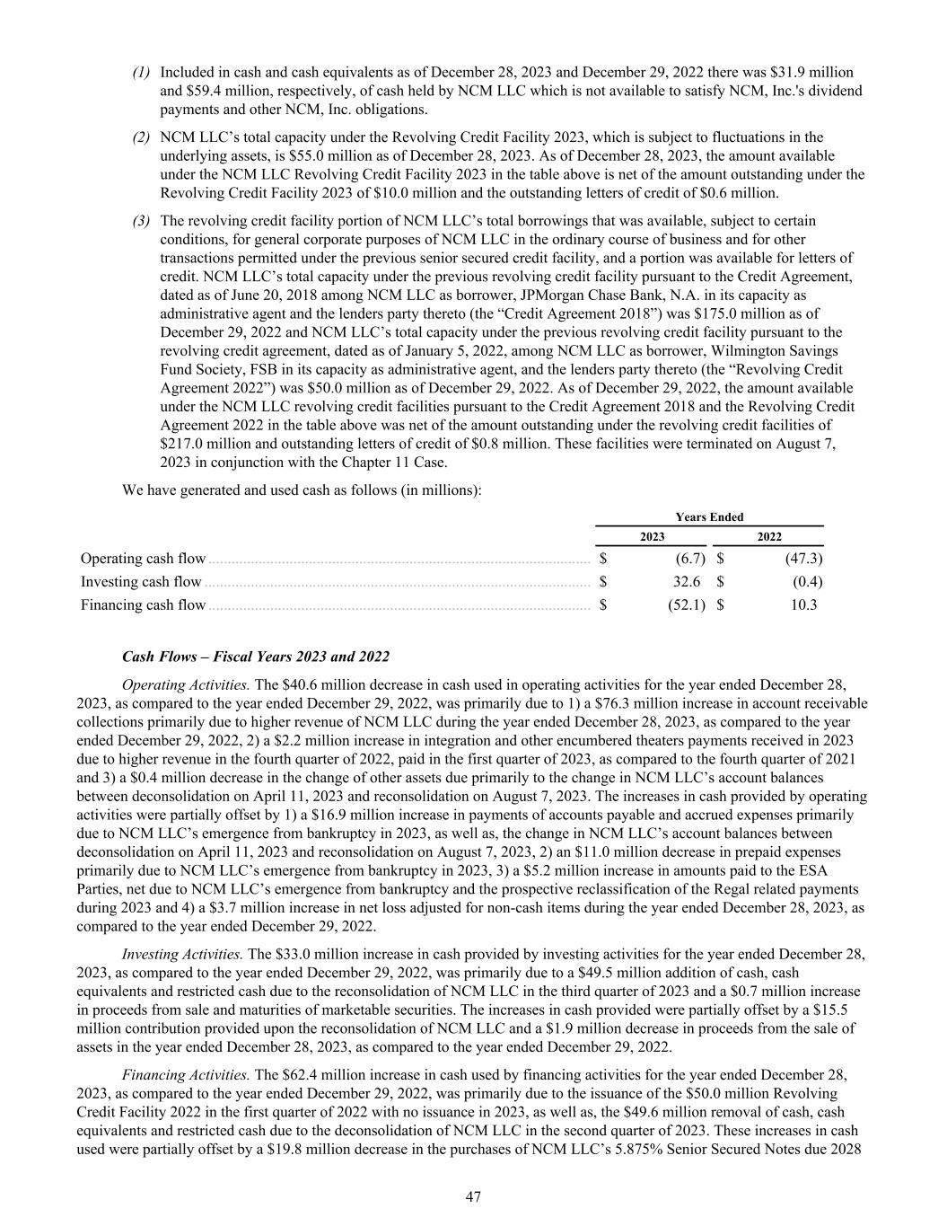 (1) Included in cash and cash equivalents as of December 28, 2023 and December 29, 2022 there was $31.9 million and $59.4 million, respectively, of cash held by NCM LLC which is not available to satisfy NCM, Inc.'s dividend payments and other NCM, Inc. obligations. (2) NCM LLC’s total capacity under the Revolving Credit Facility 2023, which is subject to fluctuations in the underlying assets, is $55.0 million as of December 28, 2023. As of December 28, 2023, the amount available under the NCM LLC Revolving Credit Facility 2023 in the table above is net of the amount outstanding under the Revolving Credit Facility 2023 of $10.0 million and the outstanding letters of credit of $0.6 million. (3) The revolving credit facility portion of NCM LLC’s total borrowings that was available, subject to certain conditions, for general corporate purposes of NCM LLC in the ordinary course of business and for other transactions permitted under the previous senior secured credit facility, and a portion was available for letters of credit. NCM LLC’s total capacity under the previous revolving credit facility pursuant to the Credit Agreement, dated as of June 20, 2018 among NCM LLC as borrower, JPMorgan Chase Bank, N.A. in its capacity as administrative agent and the lenders party thereto (the “Credit Agreement 2018”) was $175.0 million as of December 29, 2022 and NCM LLC’s total capacity under the previous revolving credit facility pursuant to the revolving credit agreement, dated as of January 5, 2022, among NCM LLC as borrower, Wilmington Savings Fund Society, FSB in its capacity as administrative agent, and the lenders party thereto (the “Revolving Credit Agreement 2022”) was $50.0 million as of December 29, 2022. As of December 29, 2022, the amount available under the NCM LLC revolving credit facilities pursuant to the Credit Agreement 2018 and the Revolving Credit Agreement 2022 in the table above was net of the amount outstanding under the revolving credit facilities of $217.0 million and outstanding letters of credit of $0.8 million. These facilities were terminated on August 7, 2023 in conjunction with the Chapter 11 Case. We have generated and used cash as follows (in millions): Years Ended 2023 2022 Operating cash flow ................................................................................................... $ (6.7) $ (47.3) Investing cash flow .................................................................................................... $ 32.6 $ (0.4) Financing cash flow ................................................................................................... $ (52.1) $ 10.3 Cash Flows – Fiscal Years 2023 and 2022 Operating Activities. The $40.6 million decrease in cash used in operating activities for the year ended December 28, 2023, as compared to the year ended December 29, 2022, was primarily due to 1) a $76.3 million increase in account receivable collections primarily due to higher revenue of NCM LLC during the year ended December 28, 2023, as compared to the year ended December 29, 2022, 2) a $2.2 million increase in integration and other encumbered theaters payments received in 2023 due to higher revenue in the fourth quarter of 2022, paid in the first quarter of 2023, as compared to the fourth quarter of 2021 and 3) a $0.4 million decrease in the change of other assets due primarily to the change in NCM LLC’s account balances between deconsolidation on April 11, 2023 and reconsolidation on August 7, 2023. The increases in cash provided by operating activities were partially offset by 1) a $16.9 million increase in payments of accounts payable and accrued expenses primarily due to NCM LLC’s emergence from bankruptcy in 2023, as well as, the change in NCM LLC’s account balances between deconsolidation on April 11, 2023 and reconsolidation on August 7, 2023, 2) an $11.0 million decrease in prepaid expenses primarily due to NCM LLC’s emergence from bankruptcy in 2023, 3) a $5.2 million increase in amounts paid to the ESA Parties, net due to NCM LLC’s emergence from bankruptcy and the prospective reclassification of the Regal related payments during 2023 and 4) a $3.7 million increase in net loss adjusted for non-cash items during the year ended December 28, 2023, as compared to the year ended December 29, 2022. Investing Activities. The $33.0 million increase in cash provided by investing activities for the year ended December 28, 2023, as compared to the year ended December 29, 2022, was primarily due to a $49.5 million addition of cash, cash equivalents and restricted cash due to the reconsolidation of NCM LLC in the third quarter of 2023 and a $0.7 million increase in proceeds from sale and maturities of marketable securities. The increases in cash provided were partially offset by a $15.5 million contribution provided upon the reconsolidation of NCM LLC and a $1.9 million decrease in proceeds from the sale of assets in the year ended December 28, 2023, as compared to the year ended December 29, 2022. Financing Activities. The $62.4 million increase in cash used by financing activities for the year ended December 28, 2023, as compared to the year ended December 29, 2022, was primarily due to the issuance of the $50.0 million Revolving Credit Facility 2022 in the first quarter of 2022 with no issuance in 2023, as well as, the $49.6 million removal of cash, cash equivalents and restricted cash due to the deconsolidation of NCM LLC in the second quarter of 2023. These increases in cash used were partially offset by a $19.8 million decrease in the purchases of NCM LLC’s 5.875% Senior Secured Notes due 2028 47