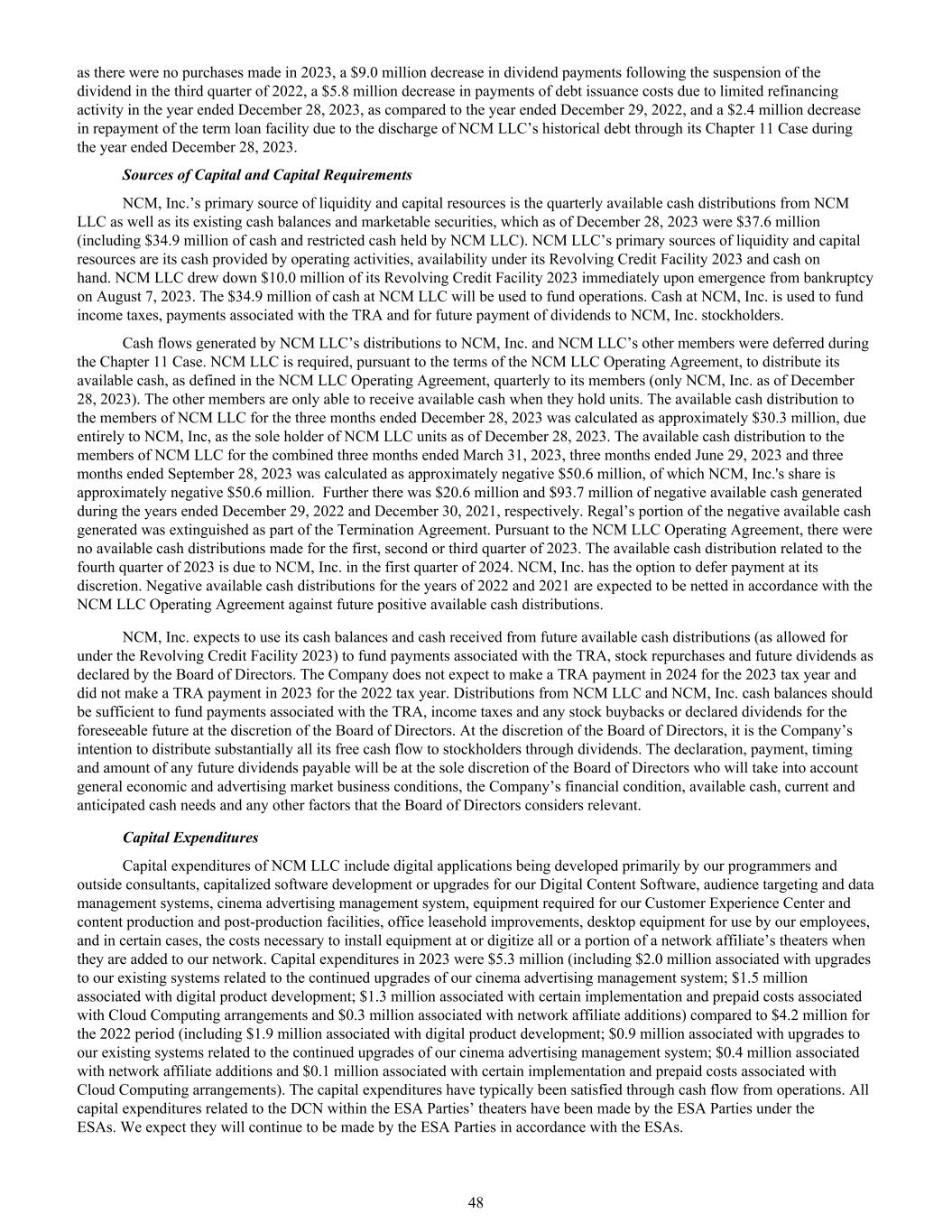 as there were no purchases made in 2023, a $9.0 million decrease in dividend payments following the suspension of the dividend in the third quarter of 2022, a $5.8 million decrease in payments of debt issuance costs due to limited refinancing activity in the year ended December 28, 2023, as compared to the year ended December 29, 2022, and a $2.4 million decrease in repayment of the term loan facility due to the discharge of NCM LLC’s historical debt through its Chapter 11 Case during the year ended December 28, 2023. Sources of Capital and Capital Requirements NCM, Inc.’s primary source of liquidity and capital resources is the quarterly available cash distributions from NCM LLC as well as its existing cash balances and marketable securities, which as of December 28, 2023 were $37.6 million (including $34.9 million of cash and restricted cash held by NCM LLC). NCM LLC’s primary sources of liquidity and capital resources are its cash provided by operating activities, availability under its Revolving Credit Facility 2023 and cash on hand. NCM LLC drew down $10.0 million of its Revolving Credit Facility 2023 immediately upon emergence from bankruptcy on August 7, 2023. The $34.9 million of cash at NCM LLC will be used to fund operations. Cash at NCM, Inc. is used to fund income taxes, payments associated with the TRA and for future payment of dividends to NCM, Inc. stockholders. Cash flows generated by NCM LLC’s distributions to NCM, Inc. and NCM LLC’s other members were deferred during the Chapter 11 Case. NCM LLC is required, pursuant to the terms of the NCM LLC Operating Agreement, to distribute its available cash, as defined in the NCM LLC Operating Agreement, quarterly to its members (only NCM, Inc. as of December 28, 2023). The other members are only able to receive available cash when they hold units. The available cash distribution to the members of NCM LLC for the three months ended December 28, 2023 was calculated as approximately $30.3 million, due entirely to NCM, Inc, as the sole holder of NCM LLC units as of December 28, 2023. The available cash distribution to the members of NCM LLC for the combined three months ended March 31, 2023, three months ended June 29, 2023 and three months ended September 28, 2023 was calculated as approximately negative $50.6 million, of which NCM, Inc.'s share is approximately negative $50.6 million. Further there was $20.6 million and $93.7 million of negative available cash generated during the years ended December 29, 2022 and December 30, 2021, respectively. Regal’s portion of the negative available cash generated was extinguished as part of the Termination Agreement. Pursuant to the NCM LLC Operating Agreement, there were no available cash distributions made for the first, second or third quarter of 2023. The available cash distribution related to the fourth quarter of 2023 is due to NCM, Inc. in the first quarter of 2024. NCM, Inc. has the option to defer payment at its discretion. Negative available cash distributions for the years of 2022 and 2021 are expected to be netted in accordance with the NCM LLC Operating Agreement against future positive available cash distributions. NCM, Inc. expects to use its cash balances and cash received from future available cash distributions (as allowed for under the Revolving Credit Facility 2023) to fund payments associated with the TRA, stock repurchases and future dividends as declared by the Board of Directors. The Company does not expect to make a TRA payment in 2024 for the 2023 tax year and did not make a TRA payment in 2023 for the 2022 tax year. Distributions from NCM LLC and NCM, Inc. cash balances should be sufficient to fund payments associated with the TRA, income taxes and any stock buybacks or declared dividends for the foreseeable future at the discretion of the Board of Directors. At the discretion of the Board of Directors, it is the Company’s intention to distribute substantially all its free cash flow to stockholders through dividends. The declaration, payment, timing and amount of any future dividends payable will be at the sole discretion of the Board of Directors who will take into account general economic and advertising market business conditions, the Company’s financial condition, available cash, current and anticipated cash needs and any other factors that the Board of Directors considers relevant. Capital Expenditures Capital expenditures of NCM LLC include digital applications being developed primarily by our programmers and outside consultants, capitalized software development or upgrades for our Digital Content Software, audience targeting and data management systems, cinema advertising management system, equipment required for our Customer Experience Center and content production and post-production facilities, office leasehold improvements, desktop equipment for use by our employees, and in certain cases, the costs necessary to install equipment at or digitize all or a portion of a network affiliate’s theaters when they are added to our network. Capital expenditures in 2023 were $5.3 million (including $2.0 million associated with upgrades to our existing systems related to the continued upgrades of our cinema advertising management system; $1.5 million associated with digital product development; $1.3 million associated with certain implementation and prepaid costs associated with Cloud Computing arrangements and $0.3 million associated with network affiliate additions) compared to $4.2 million for the 2022 period (including $1.9 million associated with digital product development; $0.9 million associated with upgrades to our existing systems related to the continued upgrades of our cinema advertising management system; $0.4 million associated with network affiliate additions and $0.1 million associated with certain implementation and prepaid costs associated with Cloud Computing arrangements). The capital expenditures have typically been satisfied thr