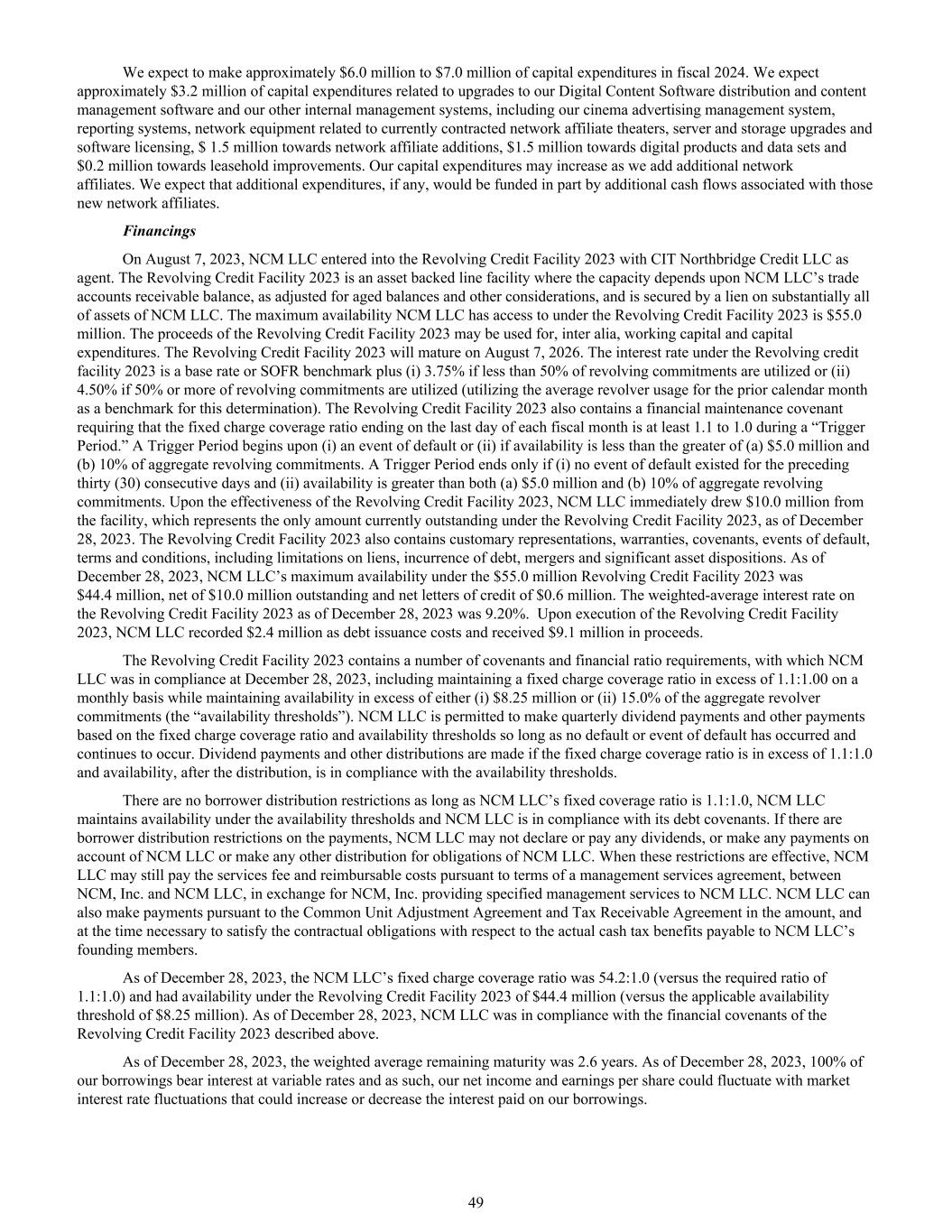 We expect to make approximately $6.0 million to $7.0 million of capital expenditures in fiscal 2024. We expect approximately $3.2 million of capital expenditures related to upgrades to our Digital Content Software distribution and content management software and our other internal management systems, including our cinema advertising management system, reporting systems, network equipment related to currently contracted network affiliate theaters, server and storage upgrades and software licensing, $ 1.5 million towards network affiliate additions, $1.5 million towards digital products and data sets and $0.2 million towards leasehold improvements. Our capital expenditures may increase as we add additional network affiliates. We expect that additional expenditures, if any, would be funded in part by additional cash flows associated with those new network affiliates. Financings On August 7, 2023, NCM LLC entered into the Revolving Credit Facility 2023 with CIT Northbridge Credit LLC as agent. The Revolving Credit Facility 2023 is an asset backed line facility where the capacity depends upon NCM LLC’s trade accounts receivable balance, as adjusted for aged balances and other considerations, and is secured by a lien on substantially all of assets of NCM LLC. The maximum availability NCM LLC has access to under the Revolving Credit Facility 2023 is $55.0 million. The proceeds of the Revolving Credit Facility 2023 may be used for, inter alia, working capital and capital expenditures. The Revolving Credit Facility 2023 will mature on August 7, 2026. The interest rate under the Revolving credit facility 2023 is a base rate or SOFR benchmark plus (i) 3.75% if less than 50% of revolving commitments are utilized or (ii) 4.50% if 50% or more of revolving commitments are utilized (utilizing the average revolver usage for the prior calendar month as a benchmark for this determination). The Revolving Credit Facility 2023 also contains a financial maintenance covenant requiring that the fixed charge coverage ratio ending on the last day of each fiscal month is at least 1.1 to 1.0 during a “Trigger Period.” A Trigger Period begins upon (i) an event of default or (ii) if availability is less than the greater of (a) $5.0 million and (b) 10% of aggregate revolving commitments. A Trigger Period ends only if (i) no event of default existed for the preceding thirty (30) consecutive days and (ii) availability is greater than both (a) $5.0 million and (b) 10% of aggregate revolving commitments. Upon the effectiveness of the Revolving Credit Facility 2023, NCM LLC immediately drew $10.0 million from the facility, which represents the only amount currently outstanding under the Revolving Credit Facility 2023, as of December 28, 2023. The Revolving Credit Facility 2023 also contains customary representations, warranties, covenants, events of default, terms and conditions, including limitations on liens, incurrence of debt, mergers and significant asset dispositions. As of December 28, 2023, NCM LLC’s maximum availability under the $55.0 million Revolving Credit Facility 2023 was $44.4 million, net of $10.0 million outstanding and net letters of credit of $0.6 million. The weighted-average interest rate on the Revolving Credit Facility 2023 as of December 28, 2023 was 9.20%. Upon execution of the Revolving Credit Facility 2023, NCM LLC recorded $2.4 million as debt issuance costs and received $9.1 million in proceeds. The Revolving Credit Facility 2023 contains a number of covenants and financial ratio requirements, with which NCM LLC was in compliance at December 28, 2023, including maintaining a fixed charge coverage ratio in excess of 1.1:1.00 on a monthly basis while maintaining availability in excess of either (i) $8.25 million or (ii) 15.0% of the aggregate revolver commitments (the “availability thresholds”). NCM LLC is permitted to make quarterly dividend payments and other payments based on the fixed charge coverage ratio and availability thresholds so long as no default or event of default has occurred and continues to occur. Dividend payments and other distributions are made if the fixed charge coverage ratio is in excess of 1.1:1.0 and availability, after the distribution, is in compliance with the availability thresholds. There are no borrower distribution restrictions as long as NCM LLC’s fixed coverage ratio is 1.1:1.0, NCM LLC maintains availability under the availability thresholds and NCM LLC is in compliance with its debt covenants. If there are borrower distribution restrictions on the payments, NCM LLC may not declare or pay any dividends, or make any payments on account of NCM LLC or make any other distribution for obligations of NCM LLC. When these restrictions are effective, NCM LLC may still pay the services fee and reimbursable costs pursuant to terms of a management services agreement, between NCM, Inc. and NCM LLC, in exchange for NCM, Inc. providing specified management services to NCM LLC. NCM LLC can also make payments pursuant to the Common Unit Adjustment Agreement and Tax Receivable Agreement in the amount, and at the time necessary to satisfy the contractual obligations with respect to the actual cash tax benefits payable to NCM LLC’s founding members. As of December 28, 2023, the NCM LLC’s fixed charge coverage ratio was 54.2:1.0 (versus the required ratio of 1.1:1.0) and had availability under the Revolving Credit Facility 2023 of $44.4 million (versus the applicable availability threshold of $8.25 million). As of December 28, 2023, NCM LLC was in compliance with the financial covenants of the Revolving Credit Facility 2023 described above. As of December 28, 2023, the weighted average remaining maturity was 2.6 years. As of December 28, 2023, 100% of our borrowings bear interest at variable rates and as such, our net income and earnings per share could fluctuate with market interest rate fluctuations that could increase or decrease the interest paid on our borro
