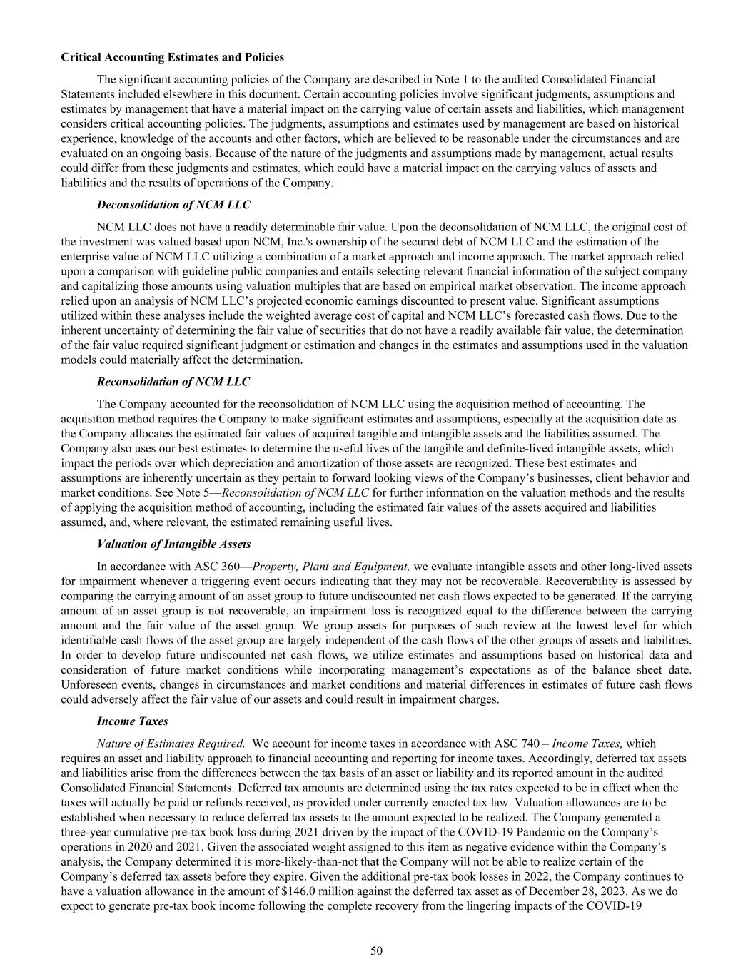 Critical Accounting Estimates and Policies The significant accounting policies of the Company are described in Note 1 to the audited Consolidated Financial Statements included elsewhere in this document. Certain accounting policies involve significant judgments, assumptions and estimates by management that have a material impact on the carrying value of certain assets and liabilities, which management considers critical accounting policies. The judgments, assumptions and estimates used by management are based on historical experience, knowledge of the accounts and other factors, which are believed to be reasonable under the circumstances and are evaluated on an ongoing basis. Because of the nature of the judgments and assumptions made by management, actual results could differ from these judgments and estimates, which could have a material impact on the carrying values of assets and liabilities and the results of operations of the Company. Deconsolidation of NCM LLC NCM LLC does not have a readily determinable fair value. Upon the deconsolidation of NCM LLC, the original cost of the investment was valued based upon NCM, Inc.'s ownership of the secured debt of NCM LLC and the estimation of the enterprise value of NCM LLC utilizing a combination of a market approach and income approach. The market approach relied upon a comparison with guideline public companies and entails selecting relevant financial information of the subject company and capitalizing those amounts using valuation multiples that are based on empirical market observation. The income approach relied upon an analysis of NCM LLC’s projected economic earnings discounted to present value. Significant assumptions utilized within these analyses include the weighted average cost of capital and NCM LLC’s forecasted cash flows. Due to the inherent uncertainty of determining the fair value of securities that do not have a readily available fair value, the determination of the fair value required significant judgment or estimation and changes in the estimates and assumptions used in the valuation models could materially affect the determination. Reconsolidation of NCM LLC The Company accounted for the reconsolidation of NCM LLC using the acquisition method of accounting. The acquisition method requires the Company to make significant estimates and assumptions, especially at the acquisition date as the Company allocates the estimated fair values of acquired tangible and intangible assets and the liabilities assumed. The Company also uses our best estimates to determine the useful lives of the tangible and definite-lived intangible assets, which impact the periods over which depreciation and amortization of those assets are recognized. These best estimates and assumptions are inherently uncertain as they pertain to forward looking views of the Company’s businesses, client behavior and market conditions. See Note 5—Reconsolidation of NCM LLC for further information on the valuation methods and the results of applying the acquisition method of accounting, including the estimated fair values of the assets acquired and liabilities assumed, and, where relevant, the estimated remaining useful lives. Valuation of Intangible Assets In accordance with ASC 360—Property, Plant and Equipment, we evaluate intangible assets and other long-lived assets for impairment whenever a triggering event occurs indicating that they may not be recoverable. Recoverability is assessed by comparing the carrying amount of an asset group to future undiscounted net cash flows expected to be generated. If the carrying amount of an asset group is not recoverable, an impairment loss is recognized equal to the difference between the carrying amount and the fair value of the asset group. We group assets for purposes of such review at the lowest level for which identifiable cash flows of the asset group are largely independent of the cash flows of the other groups of assets and liabilities. In order to develop future undiscounted net cash flows, we utilize estimates and assumptions based on historical data and consideration of future market conditions while incorporating management’s expectations as of the balance sheet date. Unforeseen events, changes in circumstances and market conditions and material differences in estimates of future cash flows could adversely affect the fair value of our assets and could result in impairment charges. Income Taxes Nature of Estimates Required. We account for income taxes in accordance with ASC 740 – Income Taxes, which requires an asset and liability approach to financial accounting and reporting for income taxes. Accordingly, deferred tax assets and liabilities arise from the differences between the tax basis of an asset or liability and its reported amount in the audited Consolidated Financial Statements. Deferred tax amounts are determined using the tax rates expected to be in effect when the taxes will actually be paid or refunds received, as provided under currently enacted tax law. Valuation allowances are to be established when necessary to reduce deferred tax assets to the amount expected to be realized. The Company generated a three-year cumulative pre-tax book loss during 2021 driven by the impact of the COVID-19 Pandemic on the Company’s operations in 2020 and 2021. Given the associated weight assigned to this item as negative evidence within the Company’s analysis, the Company determined it is more-likely-than-not that the Company will not be able to realize certain of the Company’s deferred tax assets before they expire. Given the additional pre-tax book losses in 2022, the Company continues to have a valuation allowance in the amount of $146.0 million against the deferred tax asset as of December 28, 2023. As we do expect to generate pre-tax book income following the complete recovery from the lingering impacts of the COVID-19 50