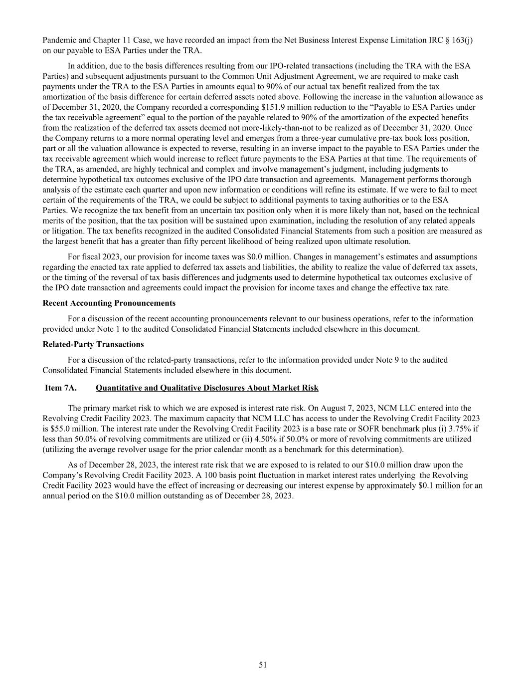 Pandemic and Chapter 11 Case, we have recorded an impact from the Net Business Interest Expense Limitation IRC § 163(j) on our payable to ESA Parties under the TRA. In addition, due to the basis differences resulting from our IPO-related transactions (including the TRA with the ESA Parties) and subsequent adjustments pursuant to the Common Unit Adjustment Agreement, we are required to make cash payments under the TRA to the ESA Parties in amounts equal to 90% of our actual tax benefit realized from the tax amortization of the basis difference for certain deferred assets noted above. Following the increase in the valuation allowance as of December 31, 2020, the Company recorded a corresponding $151.9 million reduction to the “Payable to ESA Parties under the tax receivable agreement” equal to the portion of the payable related to 90% of the amortization of the expected benefits from the realization of the deferred tax assets deemed not more-likely-than-not to be realized as of December 31, 2020. Once the Company returns to a more normal operating level and emerges from a three-year cumulative pre-tax book loss position, part or all the valuation allowance is expected to reverse, resulting in an inverse impact to the payable to ESA Parties under the tax receivable agreement which would increase to reflect future payments to the ESA Parties at that time. The requirements of the TRA, as amended, are highly technical and complex and involve management’s judgment, including judgments to determine hypothetical tax outcomes exclusive of the IPO date transaction and agreements. Management performs thorough analysis of the estimate each quarter and upon new information or conditions will refine its estimate. If we were to fail to meet certain of the requirements of the TRA, we could be subject to additional payments to taxing authorities or to the ESA Parties. We recognize the tax benefit from an uncertain tax position only when it is more likely than not, based on the technical merits of the position, that the tax position will be sustained upon examination, including the resolution of any related appeals or litigation. The tax benefits recognized in the audited Consolidated Financial Statements from such a position are measured as the largest benefit that has a greater than fifty percent likelihood of being realized upon ultimate resolution. For fiscal 2023, our provision for income taxes was $0.0 million. Changes in management’s estimates and assumptions regarding the enacted tax rate applied to deferred tax assets and liabilities, the ability to realize the value of deferred tax assets, or the timing of the reversal of tax basis differences and judgments used to determine hypothetical tax outcomes exclusive of the IPO date transaction and agreements could impact the provision for income taxes and change the effective tax rate. Recent Accounting Pronouncements For a discussion of the recent accounting pronouncements relevant to our business operations, refer to the information provided under Note 1 to the audited Consolidated Financial Statements included elsewhere in this document. Related-Party Transactions For a discussion of the related-party transactions, refer to the information provided under Note 9 to the audited Consolidated Financial Statements included elsewhere in this document. Item 7A. Quantitative and Qualitative Disclosures About Market Risk The primary market risk to which we are exposed is interest rate risk. On August 7, 2023, NCM LLC entered into the Revolving Credit Facility 2023. The maximum capacity that NCM LLC has access to under the Revolving Credit Facility 2023 is $55.0 million. The interest rate under the Revolving Credit Facility 2023 is a base rate or SOFR benchmark plus (i) 3.75% if less than 50.0% of revolving commitments are utilized or (ii) 4.50% if 50.0% or more of revolving commitments are utilized (utilizing the average revolver usage for the prior calendar month as a benchmark for this determination). As of December 28, 2023, the interest rate risk that we are exposed to is related to our $10.0 million draw upon the Company’s Revolving Credit Facility 2023. A 100 basis point fluctuation in market interest rates underlying the Revolving Credit Facility 2023 would have the effect of increasing or decreasing our interest expense by approximately $0.1 million for an annual period on the $10.0 million outstanding as of December 28, 2023. 51