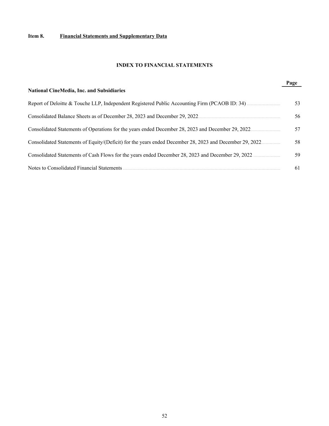 Item 8. Financial Statements and Supplementary Data INDEX TO FINANCIAL STATEMENTS Page National CineMedia, Inc. and Subsidiaries Report of Deloitte & Touche LLP, Independent Registered Public Accounting Firm (PCAOB ID: 34) ......................... 53 Consolidated Balance Sheets as of December 28, 2023 and December 29, 2022 ............................................................. 56 Consolidated Statements of Operations for the years ended December 28, 2023 and December 29, 2022 ...................... 57 Consolidated Statements of Equity/(Deficit) for the years ended December 28, 2023 and December 29, 2022 .............. 58 Consolidated Statements of Cash Flows for the years ended December 28, 2023 and December 29, 2022 .................... 59 Notes to Consolidated Financial Statements ..................................................................................................................... 61 52