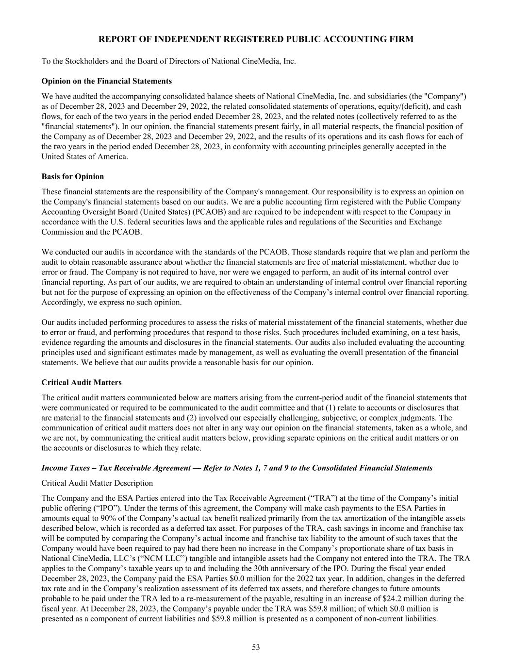 REPORT OF INDEPENDENT REGISTERED PUBLIC ACCOUNTING FIRM To the Stockholders and the Board of Directors of National CineMedia, Inc. Opinion on the Financial Statements We have audited the accompanying consolidated balance sheets of National CineMedia, Inc. and subsidiaries (the "Company") as of December 28, 2023 and December 29, 2022, the related consolidated statements of operations, equity/(deficit), and cash flows, for each of the two years in the period ended December 28, 2023, and the related notes (collectively referred to as the "financial statements"). In our opinion, the financial statements present fairly, in all material respects, the financial position of the Company as of December 28, 2023 and December 29, 2022, and the results of its operations and its cash flows for each of the two years in the period ended December 28, 2023, in conformity with accounting principles generally accepted in the United States of America. Basis for Opinion These financial statements are the responsibility of the Company's management. Our responsibility is to express an opinion on the Company's financial statements based on our audits. We are a public accounting firm registered with the Public Company Accounting Oversight Board (United States) (PCAOB) and are required to be independent with respect to the Company in accordance with the U.S. federal securities laws and the applicable rules and regulations of the Securities and Exchange Commission and the PCAOB. We conducted our audits in accordance with the standards of the PCAOB. Those standards require that we plan and perform the audit to obtain reasonable assurance about whether the financial statements are free of material misstatement, whether due to error or fraud. The Company is not required to have, nor were we engaged to perform, an audit of its internal control over financial reporting. As part of our audits, we are required to obtain an understanding of internal control over financial reporting but not for the purpose of expressing an opinion on the effectiveness of the Company’s internal control over financial reporting. Accordingly, we express no such opinion. Our audits included performing procedures to assess the risks of material misstatement of the financial statements, whether due to error or fraud, and performing procedures that respond to those risks. Such procedures included examining, on a test basis, evidence regarding the amounts and disclosures in the financial statements. Our audits also included evaluating the accounting principles used and significant estimates made by management, as well as evaluating the overall presentation of the financial statements. We believe that our audits provide a reasonable basis for our opinion. Critical Audit Matters The critical audit matters communicated below are matters arising from the current-period audit of the financial statements that were communicated or required to be communicated to the audit committee and that (1) relate to accounts or disclosures that are material to the financial statements and (2) involved our especially challenging, subjective, or complex judgments. The communication of critical audit matters does not alter in any way our opinion on the financial statements, taken as a whole, and we are not, by communicating the critical audit matters below, providing separate opinions on the critical audit matters or on the accounts or disclosures to which they relate. Income Taxes – Tax Receivable Agreement — Refer to Notes 1, 7 and 9 to the Consolidated Financial Statements Critical Audit Matter Description The Company and the ESA Parties entered into the Tax Receivable Agreement (“TRA”) at the time of the Company’s initial public offering (“IPO”). Under the terms of this agreement, the Company will make cash payments to the ESA Parties in amounts equal to 90% of the Company’s actual tax benefit realized primarily from the tax amortization of the intangible assets described below, which is recorded as a deferred tax asset. For purposes of the TRA, cash savings in income and franchise tax will be computed by comparing the Company’s actual income and franchise tax liability to the amount of such taxes that the Company would have been required to pay had there been no increase in the Company’s proportionate share of tax basis in National CineMedia, LLC’s (“NCM LLC”) tangible and intangible assets had the Company not entered into the TRA. The TRA applies to the Company’s taxable years up to and including the 30th anniversary of the IPO. During the fiscal year ended December 28, 2023, the Company paid the ESA Parties $0.0 million for the 2022 tax year. In addition, changes in the deferred tax rate and in the Company’s realization assessment of its deferred tax assets, and therefore changes to future amounts probable to be paid under the TRA led to a re-measurement of the payable, resulting in an increase of $24.2 million during the fiscal year. At December 28, 2023, the Company’s payable under the TRA was $59.8 million; of which $0.0 million is presented as a component of current liabilities and $59.8 million is presented as a component of non-current liabilities. 53