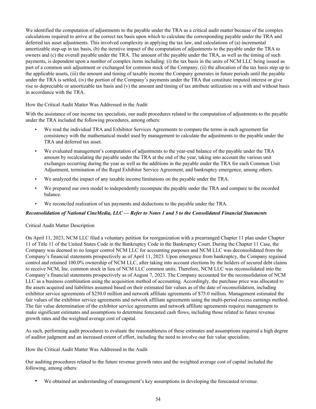 We identified the computation of adjustments to the payable under the TRA as a critical audit matter because of the complex calculations required to arrive at the correct tax basis upon which to calculate the corresponding payable under the TRA and deferred tax asset adjustments. This involved complexity in applying the tax law, and calculations of (a) incremental amortizable step-up in tax basis, (b) the iterative impact of the computation of adjustments to the payable under the TRA to owners and (c) the overall payable under the TRA. The amount of the payable under the TRA, as well as the timing of such payments, is dependent upon a number of complex items including: (i) the tax basis in the units of NCM LLC being issued as part of a common unit adjustment or exchanged for common stock of the Company, (ii) the allocation of the tax basis step up to the applicable assets, (iii) the amount and timing of taxable income the Company generates in future periods until the payable under the TRA is settled, (iv) the portion of the Company’s payments under the TRA that constitute imputed interest or give rise to depreciable or amortizable tax basis and (v) the amount and timing of tax attribute utilization on a with and without basis in accordance with the TRA. How the Critical Audit Matter Was Addressed in the Audit With the assistance of our income tax specialists, our audit procedures related to the computation of adjustments to the payable under the TRA included the following procedures, among others: • We read the individual TRA and Exhibitor Services Agreements to compare the terms in each agreement for consistency with the mathematical model used by management to calculate the adjustments to the payable under the TRA and deferred tax asset. • We evaluated management’s computation of adjustments to the year-end balance of the payable under the TRA amount by recalculating the payable under the TRA at the end of the year, taking into account the various unit exchanges occurring during the year as well as the additions in the payable under the TRA for each Common Unit Adjustment, termination of the Regal Exhibitor Service Agreement, and bankruptcy emergence, among others. • We analyzed the impact of any taxable income limitations on the payable under the TRA. • We prepared our own model to independently recompute the payable under the TRA and compare to the recorded balance. • We reconciled realization of tax payments and deductions to the payable under the TRA. Reconsolidation of National CineMedia, LLC — Refer to Notes 1 and 5 to the Consolidated Financial Statements Critical Audit Matter Description On April 11, 2023, NCM LLC filed a voluntary petition for reorganization with a prearranged Chapter 11 plan under Chapter 11 of Title 11 of the United States Code in the Bankruptcy Code in the Bankruptcy Court. During the Chapter 11 Case, the Company was deemed to no longer control NCM LLC for accounting purposes and NCM LLC was deconsolidated from the Company’s financial statements prospectively as of April 11, 2023. Upon emergence from bankruptcy, the Company regained control and retained 100.0% ownership of NCM LLC, after taking into account elections by the holders of secured debt claims to receive NCM, Inc. common stock in lieu of NCM LLC common units. Therefore, NCM LLC was reconsolidated into the Company’s financial statements prospectively as of August 7, 2023. The Company accounted for the reconsolidation of NCM LLC as a business combination using the acquisition method of accounting. Accordingly, the purchase price was allocated to the assets acquired and liabilities assumed based on their estimated fair values as of the date of reconsolidation, including exhibitor service agreements of $250.0 million and network affiliate agreements of $75.0 million. Management estimated the fair values of the exhibitor service agreements and network affiliate agreements using the multi-period excess earnings method. The fair value determination of the exhibitor service agreements and network affiliate agreements requires management to make significant estimates and assumptions to determine forecasted cash flows, including those related to future revenue growth rates and the weighted average cost of capital. As such, performing audit procedures to evaluate the reasonableness of these estimates and assumptions required a high degree of auditor judgment and an increased extent of effort, including the need to involve our fair value specialists. How the Critical Audit Matter Was Addressed in the Audit Our auditing procedures related to the future revenue growth rates and the weighted average cost of capital included the following, among others: • We obtained an understanding of management’s key assumptions in developing the forecasted revenue. 54