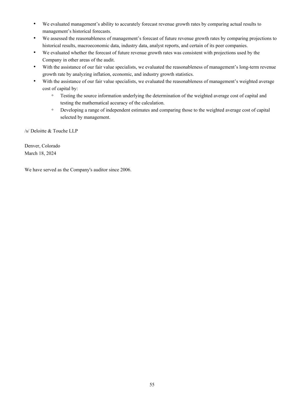 • We evaluated management’s ability to accurately forecast revenue growth rates by comparing actual results to management’s historical forecasts. • We assessed the reasonableness of management’s forecast of future revenue growth rates by comparing projections to historical results, macroeconomic data, industry data, analyst reports, and certain of its peer companies. • We evaluated whether the forecast of future revenue growth rates was consistent with projections used by the Company in other areas of the audit. • With the assistance of our fair value specialists, we evaluated the reasonableness of management’s long-term revenue growth rate by analyzing inflation, economic, and industry growth statistics. • With the assistance of our fair value specialists, we evaluated the reasonableness of management’s weighted average cost of capital by: ◦ Testing the source information underlying the determination of the weighted average cost of capital and testing the mathematical accuracy of the calculation. ◦ Developing a range of independent estimates and comparing those to the weighted average cost of capital selected by management. /s/ Deloitte & Touche LLP Denver, Colorado March 18, 2024 We have served as the Company's auditor since 2006. 55