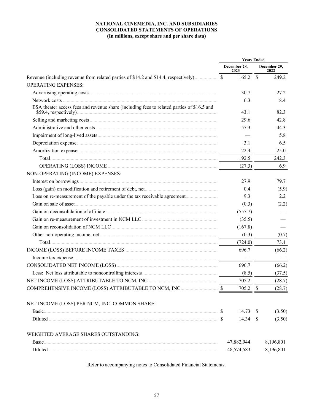 NATIONAL CINEMEDIA, INC. AND SUBSIDIARIES CONSOLIDATED STATEMENTS OF OPERATIONS (In millions, except share and per share data) Years Ended December 28, 2023 December 29, 2022 Revenue (including revenue from related parties of $14.2 and $14.4, respectively) .................. $ 165.2 $ 249.2 OPERATING EXPENSES: Advertising operating costs .................................................................................................... 30.7 27.2 Network costs ......................................................................................................................... 6.3 8.4 ESA theater access fees and revenue share (including fees to related parties of $16.5 and $59.4, respectively) .............................................................................................................. 43.1 82.3 Selling and marketing costs .................................................................................................... 29.6 42.8 Administrative and other costs ............................................................................................... 57.3 44.3 Impairment of long-lived assets .............................................................................................. — 5.8 Depreciation expense .............................................................................................................. 3.1 6.5 Amortization expense ............................................................................................................. 22.4 25.0 Total ................................................................................................................................... 192.5 242.3 OPERATING (LOSS) INCOME ...................................................................................... (27.3) 6.9 NON-OPERATING (INCOME) EXPENSES: Interest on borrowings ............................................................................................................ 27.9 79.7 Loss (gain) on modification and retirement of debt, net ......................................................... 0.4 (5.9) Loss on re-measurement of the payable under the tax receivable agreement ......................... 9.3 2.2 Gain on sale of asset ............................................................................................................... (0.3) (2.2) Gain on deconsolidation of affiliate ....................................................................................... (557.7) — Gain on re-measurement of investment in NCM LLC ........................................................... (35.5) — Gain on reconsolidation of NCM LLC ................................................................................... (167.8) — Other non-operating income, net ............................................................................................ (0.3) (0.7) Total ................................................................................................................................... (724.0) 73.1 INCOME (LOSS) BEFORE INCOME TAXES ......................................................................... 696.7 (66.2) Income tax expense ................................................................................................................. — — CONSOLIDATED NET INCOME (LOSS) ............................................................................... 696.7 (66.2) Less: Net loss attributable to noncontrolling interests ........................................................... (8.5) (37.5) NET INCOME (LOSS) ATTRIBUTABLE TO NCM, INC. ..................................................... 705.2 (28.7) COMPREHENSIVE INCOME (LOSS) ATTRIBUTABLE TO NCM, INC. ............................ $ 705.2 $ (28.7) NET INCOME (LOSS) PER NCM, INC. COMMON SHARE: Basic ........................................................................................................................................ $ 14.73 $ (3.50) Diluted .................................................................................................................................... $ 14.34 $ (3.50) WEIGHTED AVERAGE SHARES OUTSTANDING: Basic ........................................................................................................................................ 47,882,944 8,196,801 Diluted .................................................................................................................................... 48,574,583 8,196,801 Refer to accompanying notes to Consolidated Financial Statements. 57