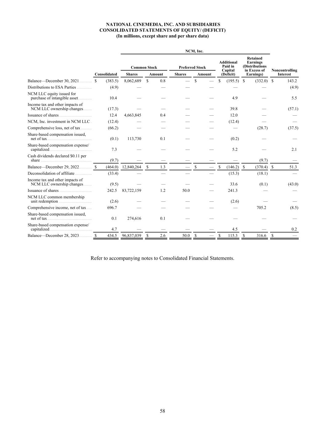 NATIONAL CINEMEDIA, INC. AND SUBSIDIARIES CONSOLIDATED STATEMENTS OF EQUITY/ (DEFICIT) (In millions, except share and per share data) NCM, Inc. Common Stock Preferred Stock Additional Paid in Capital (Deficit) Retained Earnings (Distributions in Excess of Earnings) Noncontrolling InterestConsolidated Shares Amount Shares Amount Balance—December 30, 2021 ............ $ (383.5) 8,062,689 $ 0.8 — $ — $ (195.5) $ (332.0) $ 143.2 Distributions to ESA Parties .............. (4.9) — — — — — — (4.9) NCM LLC equity issued for purchase of intangible asset ............. 10.4 — — — — 4.9 — 5.5 Income tax and other impacts of NCM LLC ownership changes ........ (17.3) — — — — 39.8 — (57.1) Issuance of shares ............................... 12.4 4,663,845 0.4 — — 12.0 — — NCM, Inc. investment in NCM LLC . (12.4) — — — — (12.4) — — Comprehensive loss, net of tax .......... (66.2) — — — — — (28.7) (37.5) Share-based compensation issued, net of tax .......................................... (0.1) 113,730 0.1 — — (0.2) — — Share-based compensation expense/ capitalized ........................................ 7.3 — — — — 5.2 — 2.1 Cash dividends declared $0.11 per share ................................................ (9.7) — — — — — (9.7) — Balance—December 29, 2022 ............ $ (464.0) 12,840,264 $ 1.3 — $ — $ (146.2) $ (370.4) $ 51.3 Deconsolidation of affiliate ................ (33.4) — — — — (15.3) (18.1) — Income tax and other impacts of NCM LLC ownership changes ........ (9.5) — — — — 33.6 (0.1) (43.0) Issuance of shares ............................... 242.5 83,722,159 1.2 50.0 — 241.3 — — NCM LLC common membership unit redemption ............................... (2.6) — — — — (2.6) — — Comprehensive income, net of tax ..... 696.7 — — — — — 705.2 (8.5) Share-based compensation issued, net of tax .......................................... 0.1 274,616 0.1 — — — — — Share-based compensation expense/ capitalized ........................................ 4.7 — — — — 4.5 — 0.2 Balance—December 28, 2023 ............ $ 434.5 96,837,039 $ 2.6 50.0 $ — $ 115.3 $ 316.6 $ — Refer to accompanying notes to Consolidated Financial Statements. 58