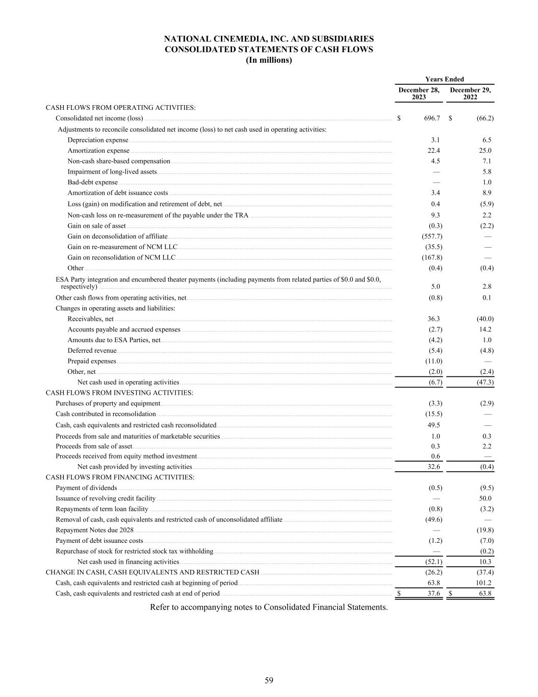 NATIONAL CINEMEDIA, INC. AND SUBSIDIARIES CONSOLIDATED STATEMENTS OF CASH FLOWS (In millions) Years Ended December 28, 2023 December 29, 2022 CASH FLOWS FROM OPERATING ACTIVITIES: Consolidated net income (loss) ............................................................................................................................................. $ 696.7 $ (66.2) Adjustments to reconcile consolidated net income (loss) to net cash used in operating activities: Depreciation expense ...................................................................................................................................................... 3.1 6.5 Amortization expense ..................................................................................................................................................... 22.4 25.0 Non-cash share-based compensation .............................................................................................................................. 4.5 7.1 Impairment of long-lived assets ...................................................................................................................................... — 5.8 Bad-debt expense ............................................................................................................................................................ — 1.0 Amortization of debt issuance costs ............................................................................................................................... 3.4 8.9 Loss (gain) on modification and retirement of debt, net ................................................................................................. 0.4 (5.9) Non-cash loss on re-measurement of the payable under the TRA ................................................................................. 9.3 2.2 Gain on sale of asset ....................................................................................................................................................... (0.3) (2.2) Gain on deconsolidation of affiliate ................................................................................................................................ (557.7) — Gain on re-measurement of NCM LLC .......................................................................................................................... (35.5) — Gain on reconsolidation of NCM LLC ........................................................................................................................... (167.8) — Other ............................................................................................................................................................................... (0.4) (0.4) ESA Party integration and encumbered theater payments (including payments from related parties of $0.0 and $0.0, respectively) ....................................................................................................................................................................... 5.0 2.8 Other cash flows from operating activities, net ..................................................................................................................... (0.8) 0.1 Changes in operating assets and liabilities: Receivables, net .............................................................................................................................................................. 36.3 (40.0) Accounts payable and accrued expenses ........................................................................................................................ (2.7) 14.2 Amounts due to ESA Parties, net .................................................................................................................................... (4.2) 1.0 Deferred revenue ............................................................................................................................................................. (5.4) (4.8) Prepaid expenses ............................................................................................................................................................. (11.0) — Other, net ........................................................................................................................................................................ (2.0) (2.4) Net cash used in operating activities ......................................................................................................................... (6.7) (47.3) CASH FLOWS FROM INVESTING ACTIVITIES: Purchases of property and equipment .................................................................................................................................... (3.3) (2.9) Cash contributed in reconsolidation ...................................................................................................................................... (15.5) — Cash, cash equivalents and restricted cash reconsolidated .................................................................................................... 49.5 — Proceeds from sale and maturities of marketable securities .................................................................................................. 1.0 0.3 Proceeds from sale of asset .................................................................................................................................................... 0.3 2.2 Proceeds received from equity method investment ............................................................................................................... 0.6 — Net cash provided by investing activities .................................................................................................................. 32.6 (0.4) CASH FLOWS FROM FINANCING ACTIVITIES: Payment of dividends .......................................................................................................................................................