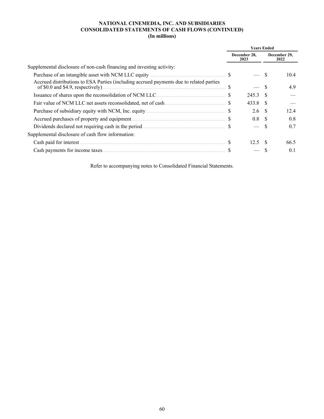 NATIONAL CINEMEDIA, INC. AND SUBSIDIARIES CONSOLIDATED STATEMENTS OF CASH FLOWS (CONTINUED) (In millions) Years Ended December 28, 2023 December 29, 2022 Supplemental disclosure of non-cash financing and investing activity: Purchase of an intangible asset with NCM LLC equity ......................................................... $ — $ 10.4 Accrued distributions to ESA Parties (including accrued payments due to related parties of $0.0 and $4.9, respectively) ............................................................................................. $ — $ 4.9 Issuance of shares upon the reconsolidation of NCM LLC .................................................... $ 245.3 $ — Fair value of NCM LLC net assets reconsolidated, net of cash .............................................. $ 433.8 $ — Purchase of subsidiary equity with NCM, Inc. equity ............................................................ $ 2.6 $ 12.4 Accrued purchases of property and equipment ....................................................................... $ 0.8 $ 0.8 Dividends declared not requiring cash in the period .............................................................. $ — $ 0.7 Supplemental disclosure of cash flow information: Cash paid for interest .............................................................................................................. $ 12.5 $ 66.5 Cash payments for income taxes ............................................................................................ $ — $ 0.1 Refer to accompanying notes to Consolidated Financial Statements. 60