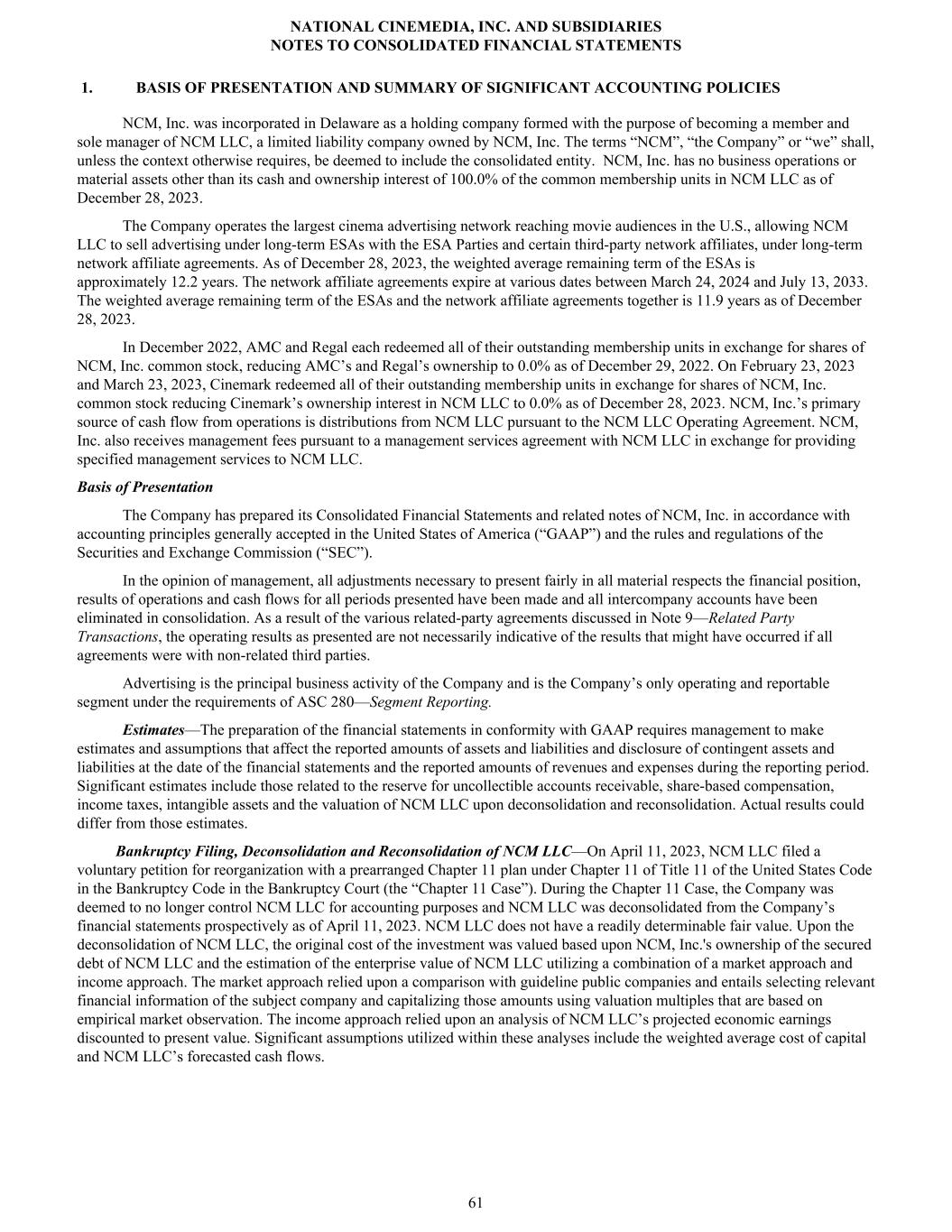1. BASIS OF PRESENTATION AND SUMMARY OF SIGNIFICANT ACCOUNTING POLICIES NCM, Inc. was incorporated in Delaware as a holding company formed with the purpose of becoming a member and sole manager of NCM LLC, a limited liability company owned by NCM, Inc. The terms “NCM”, “the Company” or “we” shall, unless the context otherwise requires, be deemed to include the consolidated entity. NCM, Inc. has no business operations or material assets other than its cash and ownership interest of 100.0% of the common membership units in NCM LLC as of December 28, 2023. The Company operates the largest cinema advertising network reaching movie audiences in the U.S., allowing NCM LLC to sell advertising under long-term ESAs with the ESA Parties and certain third-party network affiliates, under long-term network affiliate agreements. As of December 28, 2023, the weighted average remaining term of the ESAs is approximately 12.2 years. The network affiliate agreements expire at various dates between March 24, 2024 and July 13, 2033. The weighted average remaining term of the ESAs and the network affiliate agreements together is 11.9 years as of December 28, 2023. In December 2022, AMC and Regal each redeemed all of their outstanding membership units in exchange for shares of NCM, Inc. common stock, reducing AMC’s and Regal’s ownership to 0.0% as of December 29, 2022. On February 23, 2023 and March 23, 2023, Cinemark redeemed all of their outstanding membership units in exchange for shares of NCM, Inc. common stock reducing Cinemark’s ownership interest in NCM LLC to 0.0% as of December 28, 2023. NCM, Inc.’s primary source of cash flow from operations is distributions from NCM LLC pursuant to the NCM LLC Operating Agreement. NCM, Inc. also receives management fees pursuant to a management services agreement with NCM LLC in exchange for providing specified management services to NCM LLC. Basis of Presentation The Company has prepared its Consolidated Financial Statements and related notes of NCM, Inc. in accordance with accounting principles generally accepted in the United States of America (“GAAP”) and the rules and regulations of the Securities and Exchange Commission (“SEC”). In the opinion of management, all adjustments necessary to present fairly in all material respects the financial position, results of operations and cash flows for all periods presented have been made and all intercompany accounts have been eliminated in consolidation. As a result of the various related-party agreements discussed in Note 9—Related Party Transactions, the operating results as presented are not necessarily indicative of the results that might have occurred if all agreements were with non-related third parties. Advertising is the principal business activity of the Company and is the Company’s only operating and reportable segment under the requirements of ASC 280—Segment Reporting. Estimates—The preparation of the financial statements in conformity with GAAP requires management to make estimates and assumptions that affect the reported amounts of assets and liabilities and disclosure of contingent assets and liabilities at the date of the financial statements and the reported amounts of revenues and expenses during the reporting period. Significant estimates include those related to the reserve for uncollectible accounts receivable, share-based compensation, income taxes, intangible assets and the valuation of NCM LLC upon deconsolidation and reconsolidation. Actual results could differ from those estimates. Bankruptcy Filing, Deconsolidation and Reconsolidation of NCM LLC—On April 11, 2023, NCM LLC filed a voluntary petition for reorganization with a prearranged Chapter 11 plan under Chapter 11 of Title 11 of the United States Code in the Bankruptcy Code in the Bankruptcy Court (the “Chapter 11 Case”). During the Chapter 11 Case, the Company was deemed to no longer control NCM LLC for accounting purposes and NCM LLC was deconsolidated from the Company’s financial statements prospectively as of April 11, 2023. NCM LLC does not have a readily determinable fair value. Upon the deconsolidation of NCM LLC, the original cost of the investment was valued based upon NCM, Inc.'s ownership of the secured debt of NCM LLC and the estimation of the enterprise value of NCM LLC utilizing a combination of a market approach and income approach. The market approach relied upon a comparison with guideline public companies and entails selecting relevant financial information of the subject company and capitalizing those amounts using valuation multiples that are based on empirical market observation. The income approach relied upon an analysis of NCM LLC’s projected economic earnings discounted to present value. Significant assumptions utilized within these analyses include the weighted average cost of capital and NCM LLC’s forecasted cash flows. NATIONAL CINEMEDIA, INC. AND SUBSIDIARIES NOTES TO CONSOLIDATED FINANCIAL STATEMENTS 61