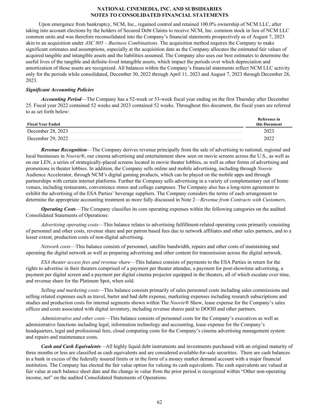 Upon emergence from bankruptcy, NCM, Inc., regained control and retained 100.0% ownership of NCM LLC, after taking into account elections by the holders of Secured Debt Claims to receive NCM, Inc. common stock in lieu of NCM LLC common units and was therefore reconsolidated into the Company’s financial statements prospectively as of August 7, 2023 akin to an acquisition under ASC 805 – Business Combinations. The acquisition method requires the Company to make significant estimates and assumptions, especially at the acquisition date as the Company allocates the estimated fair values of acquired tangible and intangible assets and the liabilities assumed. The Company also uses our best estimates to determine the useful lives of the tangible and definite-lived intangible assets, which impact the periods over which depreciation and amortization of those assets are recognized. All balances within the Company’s financial statements reflect NCM LLC activity only for the periods while consolidated, December 30, 2022 through April 11, 2023 and August 7, 2023 through December 28, 2023. Significant Accounting Policies Accounting Period—The Company has a 52-week or 53-week fiscal year ending on the first Thursday after December 25. Fiscal year 2022 contained 52 weeks and 2023 contained 52 weeks. Throughout this document, the fiscal years are referred to as set forth below: Fiscal Year Ended Reference in this Document December 28, 2023 ..................................................................................................................................... 2023 December 29, 2022 ..................................................................................................................................... 2022 Revenue Recognition—The Company derives revenue principally from the sale of advertising to national, regional and local businesses in Noovie®, our cinema advertising and entertainment show seen on movie screens across the U.S., as well as on our LEN, a series of strategically-placed screens located in movie theater lobbies, as well as other forms of advertising and promotions in theater lobbies. In addition, the Company sells online and mobile advertising, including through Noovie Audience Accelerator, through NCM’s digital gaming products, which can be played on the mobile apps and through partnerships with certain internet platforms. Further the Company sells advertising in a variety of complementary out of home venues, including restaurants, convenience stores and college campuses. The Company also has a long-term agreement to exhibit the advertising of the ESA Parties’ beverage suppliers. The Company considers the terms of each arrangement to determine the appropriate accounting treatment as more fully discussed in Note 2—Revenue from Contracts with Customers. Operating Costs—The Company classifies its core operating expenses within the following categories on the audited Consolidated Statements of Operations: Advertising operating costs—This balance relates to advertising fulfillment-related operating costs primarily consisting of personnel and other costs, revenue share and per patron based fees due to network affiliates and other sales partners, and to a lesser extent, production costs of non-digital advertising. Network costs—This balance consists of personnel, satellite bandwidth, repairs and other costs of maintaining and operating the digital network as well as preparing advertising and other content for transmission across the digital network. ESA theater access fees and revenue share—This balance consists of payments to the ESA Parties in return for the rights to advertise in their theaters comprised of a payment per theater attendee, a payment for post-showtime advertising, a payment per digital screen and a payment per digital cinema projector equipped in the theaters, all of which escalate over time, and revenue share for the Platinum Spot, when sold. Selling and marketing costs—This balance consists primarily of sales personnel costs including sales commissions and selling related expenses such as travel, barter and bad debt expense, marketing expenses including research subscriptions and studies and production costs for internal segments shown within The Noovie® Show, lease expense for the Company’s sales offices and costs associated with digital inventory, including revenue shares paid to DOOH and other partners. Administrative and other costs—This balance consists of personnel costs for the Company’s executives as well as administrative functions including legal, information technology and accounting, lease expense for the Company’s headquarters, legal and professional fees, cloud computing costs for the Company’s cinema advertising management system and repairs and maintenance costs. Cash and Cash Equivalents—All highly liquid debt instruments and investments purchased with an original maturity of three months or less are classified as cash equivalents and are considered available-for-sale securities. There are cash balances in a bank in excess of the federally insured limits or in the form of a money market demand account with a major financial institution. The Company has elected the fair value option for valuing its cash equivalents. The cash equivalents are valued at fair value at each balance sheet date and the change in value from the prior period is recognized within “Other non-operating income, net” on the audited Consolidated Statements of Operations. NATIONAL CINEMEDIA, INC. AND SUBSIDIARIES NOTES TO CONSOLIDATED FINANCIAL STATEMENTS 62
