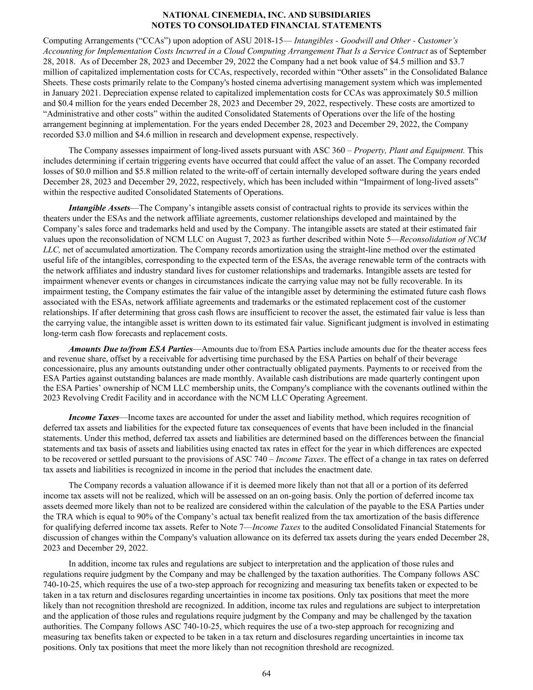 Computing Arrangements (“CCAs”) upon adoption of ASU 2018-15— Intangibles - Goodwill and Other - Customer’s Accounting for Implementation Costs Incurred in a Cloud Computing Arrangement That Is a Service Contract as of September 28, 2018. As of December 28, 2023 and December 29, 2022 the Company had a net book value of $4.5 million and $3.7 million of capitalized implementation costs for CCAs, respectively, recorded within “Other assets” in the Consolidated Balance Sheets. These costs primarily relate to the Company's hosted cinema advertising management system which was implemented in January 2021. Depreciation expense related to capitalized implementation costs for CCAs was approximately $0.5 million and $0.4 million for the years ended December 28, 2023 and December 29, 2022, respectively. These costs are amortized to “Administrative and other costs” within the audited Consolidated Statements of Operations over the life of the hosting arrangement beginning at implementation. For the years ended December 28, 2023 and December 29, 2022, the Company recorded $3.0 million and $4.6 million in research and development expense, respectively. The Company assesses impairment of long-lived assets pursuant with ASC 360 – Property, Plant and Equipment. This includes determining if certain triggering events have occurred that could affect the value of an asset. The Company recorded losses of $0.0 million and $5.8 million related to the write-off of certain internally developed software during the years ended December 28, 2023 and December 29, 2022, respectively, which has been included within “Impairment of long-lived assets” within the respective audited Consolidated Statements of Operations. Intangible Assets—The Company’s intangible assets consist of contractual rights to provide its services within the theaters under the ESAs and the network affiliate agreements, customer relationships developed and maintained by the Company’s sales force and trademarks held and used by the Company. The intangible assets are stated at their estimated fair values upon the reconsolidation of NCM LLC on August 7, 2023 as further described within Note 5—Reconsolidation of NCM LLC, net of accumulated amortization. The Company records amortization using the straight-line method over the estimated useful life of the intangibles, corresponding to the expected term of the ESAs, the average renewable term of the contracts with the network affiliates and industry standard lives for customer relationships and trademarks. Intangible assets are tested for impairment whenever events or changes in circumstances indicate the carrying value may not be fully recoverable. In its impairment testing, the Company estimates the fair value of the intangible asset by determining the estimated future cash flows associated with the ESAs, network affiliate agreements and trademarks or the estimated replacement cost of the customer relationships. If after determining that gross cash flows are insufficient to recover the asset, the estimated fair value is less than the carrying value, the intangible asset is written down to its estimated fair value. Significant judgment is involved in estimating long-term cash flow forecasts and replacement costs. Amounts Due to/from ESA Parties—Amounts due to/from ESA Parties include amounts due for the theater access fees and revenue share, offset by a receivable for advertising time purchased by the ESA Parties on behalf of their beverage concessionaire, plus any amounts outstanding under other contractually obligated payments. Payments to or received from the ESA Parties against outstanding balances are made monthly. Available cash distributions are made quarterly contingent upon the ESA Parties’ ownership of NCM LLC membership units, the Company's compliance with the covenants outlined within the 2023 Revolving Credit Facility and in accordance with the NCM LLC Operating Agreement. Income Taxes—Income taxes are accounted for under the asset and liability method, which requires recognition of deferred tax assets and liabilities for the expected future tax consequences of events that have been included in the financial statements. Under this method, deferred tax assets and liabilities are determined based on the differences between the financial statements and tax basis of assets and liabilities using enacted tax rates in effect for the year in which differences are expected to be recovered or settled pursuant to the provisions of ASC 740 – Income Taxes. The effect of a change in tax rates on deferred tax assets and liabilities is recognized in income in the period that includes the enactment date. The Company records a valuation allowance if it is deemed more likely than not that all or a portion of its deferred income tax assets will not be realized, which will be assessed on an on-going basis. Only the portion of deferred income tax assets deemed more likely than not to be realized are considered within the calculation of the payable to the ESA Parties under the TRA which is equal to 90% of the Company’s actual tax benefit realized from the tax amortization of the basis difference for qualifying deferred income tax assets. Refer to Note 7—Income Taxes to the audited Consolidated Financial Statements for discussion of changes within the Company's valuation allowance on its deferred tax assets during the years ended December 28, 2023 and December 29, 2022. In addition, income tax rules and regulations are subject to interpretation and the application of those rules and regulations require judgment by the Company and may be challenged by the taxation authorities. The Company follows ASC 740-10-25, which requires the use of a two-step approach for recognizing and measuring tax benefits taken or expected to be taken in a tax return and disclosures regarding uncertainties in income tax positions. Only tax positions that meet the more likely than not recognition thre