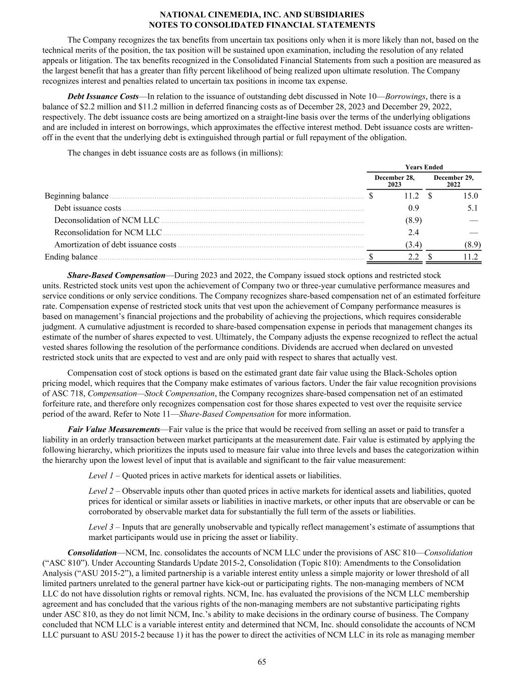 The Company recognizes the tax benefits from uncertain tax positions only when it is more likely than not, based on the technical merits of the position, the tax position will be sustained upon examination, including the resolution of any related appeals or litigation. The tax benefits recognized in the Consolidated Financial Statements from such a position are measured as the largest benefit that has a greater than fifty percent likelihood of being realized upon ultimate resolution. The Company recognizes interest and penalties related to uncertain tax positions in income tax expense. Debt Issuance Costs—In relation to the issuance of outstanding debt discussed in Note 10—Borrowings, there is a balance of $2.2 million and $11.2 million in deferred financing costs as of December 28, 2023 and December 29, 2022, respectively. The debt issuance costs are being amortized on a straight-line basis over the terms of the underlying obligations and are included in interest on borrowings, which approximates the effective interest method. Debt issuance costs are written- off in the event that the underlying debt is extinguished through partial or full repayment of the obligation. The changes in debt issuance costs are as follows (in millions): Years Ended December 28, 2023 December 29, 2022 Beginning balance ....................................................................................................................... $ 11.2 $ 15.0 Debt issuance costs ................................................................................................................. 0.9 5.1 Deconsolidation of NCM LLC ............................................................................................... (8.9) — Reconsolidation for NCM LLC .............................................................................................. 2.4 — Amortization of debt issuance costs ....................................................................................... (3.4) (8.9) Ending balance ............................................................................................................................ $ 2.2 $ 11.2 Share-Based Compensation—During 2023 and 2022, the Company issued stock options and restricted stock units. Restricted stock units vest upon the achievement of Company two or three-year cumulative performance measures and service conditions or only service conditions. The Company recognizes share-based compensation net of an estimated forfeiture rate. Compensation expense of restricted stock units that vest upon the achievement of Company performance measures is based on management’s financial projections and the probability of achieving the projections, which requires considerable judgment. A cumulative adjustment is recorded to share-based compensation expense in periods that management changes its estimate of the number of shares expected to vest. Ultimately, the Company adjusts the expense recognized to reflect the actual vested shares following the resolution of the performance conditions. Dividends are accrued when declared on unvested restricted stock units that are expected to vest and are only paid with respect to shares that actually vest. Compensation cost of stock options is based on the estimated grant date fair value using the Black-Scholes option pricing model, which requires that the Company make estimates of various factors. Under the fair value recognition provisions of ASC 718, Compensation—Stock Compensation, the Company recognizes share-based compensation net of an estimated forfeiture rate, and therefore only recognizes compensation cost for those shares expected to vest over the requisite service period of the award. Refer to Note 11—Share-Based Compensation for more information. Fair Value Measurements—Fair value is the price that would be received from selling an asset or paid to transfer a liability in an orderly transaction between market participants at the measurement date. Fair value is estimated by applying the following hierarchy, which prioritizes the inputs used to measure fair value into three levels and bases the categorization within the hierarchy upon the lowest level of input that is available and significant to the fair value measurement: Level 1 – Quoted prices in active markets for identical assets or liabilities. Level 2 – Observable inputs other than quoted prices in active markets for identical assets and liabilities, quoted prices for identical or similar assets or liabilities in inactive markets, or other inputs that are observable or can be corroborated by observable market data for substantially the full term of the assets or liabilities. Level 3 – Inputs that are generally unobservable and typically reflect management’s estimate of assumptions that market participants would use in pricing the asset or liability. Consolidation—NCM, Inc. consolidates the accounts of NCM LLC under the provisions of ASC 810—Consolidation (“ASC 810”). Under Accounting Standards Update 2015-2, Consolidation (Topic 810): Amendments to the Consolidation Analysis (“ASU 2015-2”), a limited partnership is a variable interest entity unless a simple majority or lower threshold of all limited partners unrelated to the general partner have kick-out or participating rights. The non-managing members of NCM LLC do not have dissolution rights or removal rights. NCM, Inc. has evaluated the provisions of the NCM LLC membership agreement and has concluded that the various rights of the non-managing members are not substantive participating rights under ASC 810, as they do not limit NCM, Inc.’s ability to make decisions in the ordinary course of business. The Company concluded that NCM LLC is a variable interest entity and determined that NCM, Inc. should consolidate the accounts of NCM LLC pursuant to ASU 2015-2 because 1) it has the power to direct the activities of NCM LLC in its role as managing member NATIONAL CINEMEDIA, INC. AND S