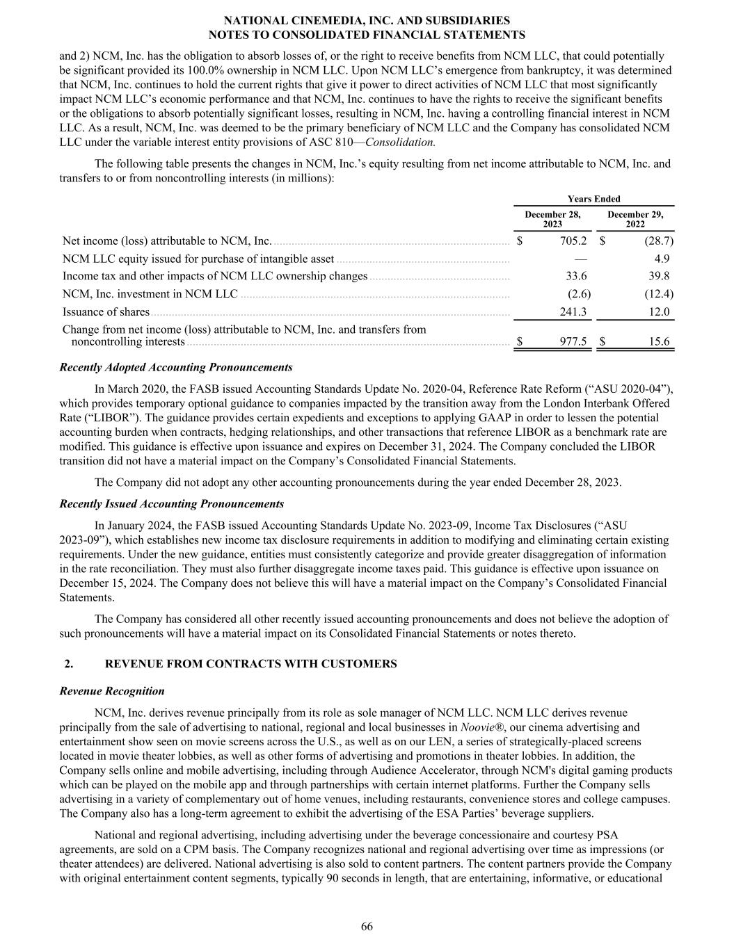 and 2) NCM, Inc. has the obligation to absorb losses of, or the right to receive benefits from NCM LLC, that could potentially be significant provided its 100.0% ownership in NCM LLC. Upon NCM LLC’s emergence from bankruptcy, it was determined that NCM, Inc. continues to hold the current rights that give it power to direct activities of NCM LLC that most significantly impact NCM LLC’s economic performance and that NCM, Inc. continues to have the rights to receive the significant benefits or the obligations to absorb potentially significant losses, resulting in NCM, Inc. having a controlling financial interest in NCM LLC. As a result, NCM, Inc. was deemed to be the primary beneficiary of NCM LLC and the Company has consolidated NCM LLC under the variable interest entity provisions of ASC 810—Consolidation. The following table presents the changes in NCM, Inc.’s equity resulting from net income attributable to NCM, Inc. and transfers to or from noncontrolling interests (in millions): Years Ended December 28, 2023 December 29, 2022 Net income (loss) attributable to NCM, Inc. ............................................................................... $ 705.2 $ (28.7) NCM LLC equity issued for purchase of intangible asset .......................................................... — 4.9 Income tax and other impacts of NCM LLC ownership changes ............................................... 33.6 39.8 NCM, Inc. investment in NCM LLC .......................................................................................... (2.6) (12.4) Issuance of shares ........................................................................................................................ 241.3 12.0 Change from net income (loss) attributable to NCM, Inc. and transfers from noncontrolling interests ............................................................................................................ $ 977.5 $ 15.6 Recently Adopted Accounting Pronouncements In March 2020, the FASB issued Accounting Standards Update No. 2020-04, Reference Rate Reform (“ASU 2020-04”), which provides temporary optional guidance to companies impacted by the transition away from the London Interbank Offered Rate (“LIBOR”). The guidance provides certain expedients and exceptions to applying GAAP in order to lessen the potential accounting burden when contracts, hedging relationships, and other transactions that reference LIBOR as a benchmark rate are modified. This guidance is effective upon issuance and expires on December 31, 2024. The Company concluded the LIBOR transition did not have a material impact on the Company’s Consolidated Financial Statements. The Company did not adopt any other accounting pronouncements during the year ended December 28, 2023. Recently Issued Accounting Pronouncements In January 2024, the FASB issued Accounting Standards Update No. 2023-09, Income Tax Disclosures (“ASU 2023-09”), which establishes new income tax disclosure requirements in addition to modifying and eliminating certain existing requirements. Under the new guidance, entities must consistently categorize and provide greater disaggregation of information in the rate reconciliation. They must also further disaggregate income taxes paid. This guidance is effective upon issuance on December 15, 2024. The Company does not believe this will have a material impact on the Company’s Consolidated Financial Statements. The Company has considered all other recently issued accounting pronouncements and does not believe the adoption of such pronouncements will have a material impact on its Consolidated Financial Statements or notes thereto. 2. REVENUE FROM CONTRACTS WITH CUSTOMERS Revenue Recognition NCM, Inc. derives revenue principally from its role as sole manager of NCM LLC. NCM LLC derives revenue principally from the sale of advertising to national, regional and local businesses in Noovie®, our cinema advertising and entertainment show seen on movie screens across the U.S., as well as on our LEN, a series of strategically-placed screens located in movie theater lobbies, as well as other forms of advertising and promotions in theater lobbies. In addition, the Company sells online and mobile advertising, including through Audience Accelerator, through NCM's digital gaming products which can be played on the mobile app and through partnerships with certain internet platforms. Further the Company sells advertising in a variety of complementary out of home venues, including restaurants, convenience stores and college campuses. The Company also has a long-term agreement to exhibit the advertising of the ESA Parties’ beverage suppliers. National and regional advertising, including advertising under the beverage concessionaire and courtesy PSA agreements, are sold on a CPM basis. The Company recognizes national and regional advertising over time as impressions (or theater attendees) are delivered. National advertising is also sold to content partners. The content partners provide the Company with original entertainment content segments, typically 90 seconds in length, that are entertaining, informative, or educational NATIONAL CINEMEDIA, INC. AND SUBSIDIARIES NOTES TO CONSOLIDATED FINANCIAL STATEMENTS 66