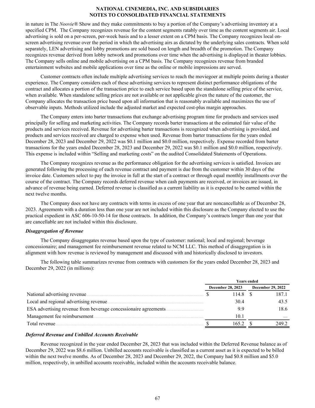 in nature in The Noovie® Show and they make commitments to buy a portion of the Company’s advertising inventory at a specified CPM. The Company recognizes revenue for the content segments ratably over time as the content segments air. Local advertising is sold on a per-screen, per-week basis and to a lesser extent on a CPM basis. The Company recognizes local on- screen advertising revenue over the period in which the advertising airs as dictated by the underlying sales contracts. When sold separately, LEN advertising and lobby promotions are sold based on length and breadth of the promotion. The Company recognizes revenue derived from lobby network and promotions over time when the advertising is displayed in theater lobbies. The Company sells online and mobile advertising on a CPM basis. The Company recognizes revenue from branded entertainment websites and mobile applications over time as the online or mobile impressions are served. Customer contracts often include multiple advertising services to reach the moviegoer at multiple points during a theater experience. The Company considers each of these advertising services to represent distinct performance obligations of the contract and allocates a portion of the transaction price to each service based upon the standalone selling price of the service, when available. When standalone selling prices are not available or not applicable given the nature of the customer, the Company allocates the transaction price based upon all information that is reasonably available and maximizes the use of observable inputs. Methods utilized include the adjusted market and expected cost-plus margin approaches. The Company enters into barter transactions that exchange advertising program time for products and services used principally for selling and marketing activities. The Company records barter transactions at the estimated fair value of the products and services received. Revenue for advertising barter transactions is recognized when advertising is provided, and products and services received are charged to expense when used. Revenue from barter transactions for the years ended December 28, 2023 and December 29, 2022 was $0.1 million and $0.0 million, respectively. Expense recorded from barter transactions for the years ended December 28, 2023 and December 29, 2022 was $0.1 million and $0.0 million, respectively. This expense is included within “Selling and marketing costs” on the audited Consolidated Statements of Operations. The Company recognizes revenue as the performance obligation for the advertising services is satisfied. Invoices are generated following the processing of each revenue contract and payment is due from the customer within 30 days of the invoice date. Customers select to pay the invoice in full at the start of a contract or through equal monthly installments over the course of the contract. The Company records deferred revenue when cash payments are received, or invoices are issued, in advance of revenue being earned. Deferred revenue is classified as a current liability as it is expected to be earned within the next twelve months. The Company does not have any contracts with terms in excess of one year that are noncancellable as of December 28, 2023. Agreements with a duration less than one year are not included within this disclosure as the Company elected to use the practical expedient in ASC 606-10-50-14 for those contracts. In addition, the Company’s contracts longer than one year that are cancellable are not included within this disclosure. Disaggregation of Revenue The Company disaggregates revenue based upon the type of customer: national; local and regional; beverage concessionaire; and management fee reimbursement revenue related to NCM LLC. This method of disaggregation is in alignment with how revenue is reviewed by management and discussed with and historically disclosed to investors. The following table summarizes revenue from contracts with customers for the years ended December 28, 2023 and December 29, 2022 (in millions): Years ended December 28, 2023 December 29, 2022 National advertising revenue ........................................................................................... $ 114.8 $ 187.1 Local and regional advertising revenue ........................................................................... 30.4 43.5 ESA advertising revenue from beverage concessionaire agreements ............................. 9.9 18.6 Management fee reimbursement ..................................................................................... 10.1 — Total revenue ................................................................................................................... $ 165.2 $ 249.2 Deferred Revenue and Unbilled Accounts Receivable Revenue recognized in the year ended December 28, 2023 that was included within the Deferred Revenue balance as of December 29, 2022 was $8.6 million. Unbilled accounts receivable is classified as a current asset as it is expected to be billed within the next twelve months. As of December 28, 2023 and December 29, 2022, the Company had $0.8 million and $5.0 million, respectively, in unbilled accounts receivable, included within the accounts receivable balance. NATIONAL CINEMEDIA, INC. AND SUBSIDIARIES NOTES TO CONSOLIDATED FINANCIAL STATEMENTS 67
