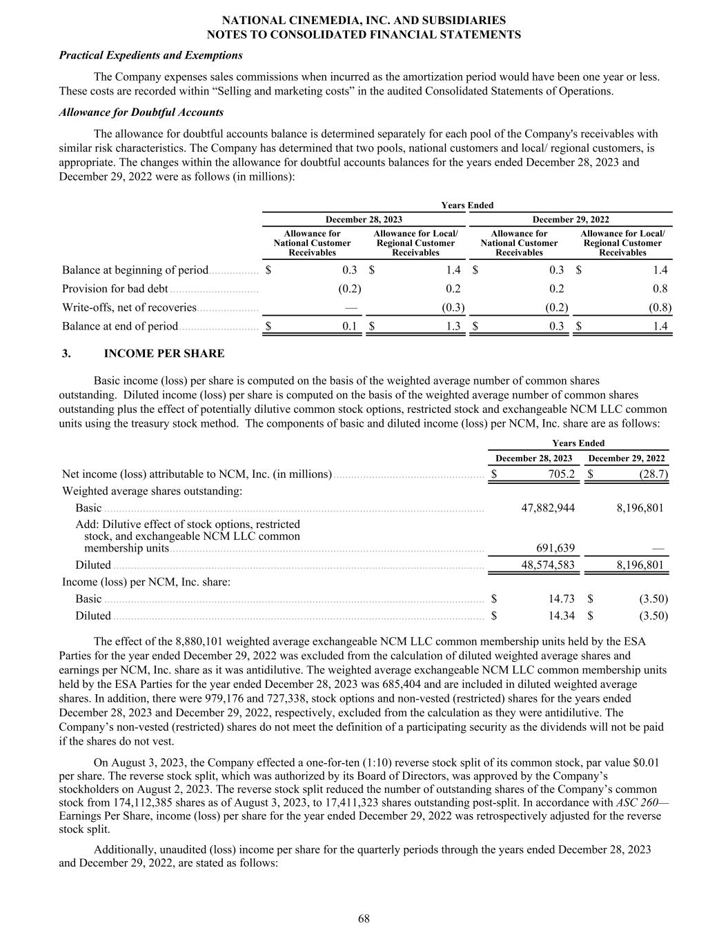 Practical Expedients and Exemptions The Company expenses sales commissions when incurred as the amortization period would have been one year or less. These costs are recorded within “Selling and marketing costs” in the audited Consolidated Statements of Operations. Allowance for Doubtful Accounts The allowance for doubtful accounts balance is determined separately for each pool of the Company's receivables with similar risk characteristics. The Company has determined that two pools, national customers and local/ regional customers, is appropriate. The changes within the allowance for doubtful accounts balances for the years ended December 28, 2023 and December 29, 2022 were as follows (in millions): Years Ended December 28, 2023 December 29, 2022 Allowance for National Customer Receivables Allowance for Local/ Regional Customer Receivables Allowance for National Customer Receivables Allowance for Local/ Regional Customer Receivables Balance at beginning of period ................. $ 0.3 $ 1.4 $ 0.3 $ 1.4 Provision for bad debt .............................. (0.2) 0.2 0.2 0.8 Write-offs, net of recoveries ..................... — (0.3) (0.2) (0.8) Balance at end of period ........................... $ 0.1 $ 1.3 $ 0.3 $ 1.4 3. INCOME PER SHARE Basic income (loss) per share is computed on the basis of the weighted average number of common shares outstanding. Diluted income (loss) per share is computed on the basis of the weighted average number of common shares outstanding plus the effect of potentially dilutive common stock options, restricted stock and exchangeable NCM LLC common units using the treasury stock method. The components of basic and diluted income (loss) per NCM, Inc. share are as follows: Years Ended December 28, 2023 December 29, 2022 Net income (loss) attributable to NCM, Inc. (in millions) ................................................... $ 705.2 $ (28.7) Weighted average shares outstanding: Basic ................................................................................................................................ 47,882,944 8,196,801 Add: Dilutive effect of stock options, restricted stock, and exchangeable NCM LLC common membership units .......................................................................................................... 691,639 — Diluted ............................................................................................................................. 48,574,583 8,196,801 Income (loss) per NCM, Inc. share: Basic ................................................................................................................................ $ 14.73 $ (3.50) Diluted ............................................................................................................................. $ 14.34 $ (3.50) The effect of the 8,880,101 weighted average exchangeable NCM LLC common membership units held by the ESA Parties for the year ended December 29, 2022 was excluded from the calculation of diluted weighted average shares and earnings per NCM, Inc. share as it was antidilutive. The weighted average exchangeable NCM LLC common membership units held by the ESA Parties for the year ended December 28, 2023 was 685,404 and are included in diluted weighted average shares. In addition, there were 979,176 and 727,338, stock options and non-vested (restricted) shares for the years ended December 28, 2023 and December 29, 2022, respectively, excluded from the calculation as they were antidilutive. The Company’s non-vested (restricted) shares do not meet the definition of a participating security as the dividends will not be paid if the shares do not vest. On August 3, 2023, the Company effected a one-for-ten (1:10) reverse stock split of its common stock, par value $0.01 per share. The reverse stock split, which was authorized by its Board of Directors, was approved by the Company’s stockholders on August 2, 2023. The reverse stock split reduced the number of outstanding shares of the Company’s common stock from 174,112,385 shares as of August 3, 2023, to 17,411,323 shares outstanding post-split. In accordance with ASC 260— Earnings Per Share, income (loss) per share for the year ended December 29, 2022 was retrospectively adjusted for the reverse stock split. Additionally, unaudited (loss) income per share for the quarterly periods through the years ended December 28, 2023 and December 29, 2022, are stated as follows: NATIONAL CINEMEDIA, INC. AND SUBSIDIARIES NOTES TO CONSOLIDATED FINANCIAL STATEMENTS 68