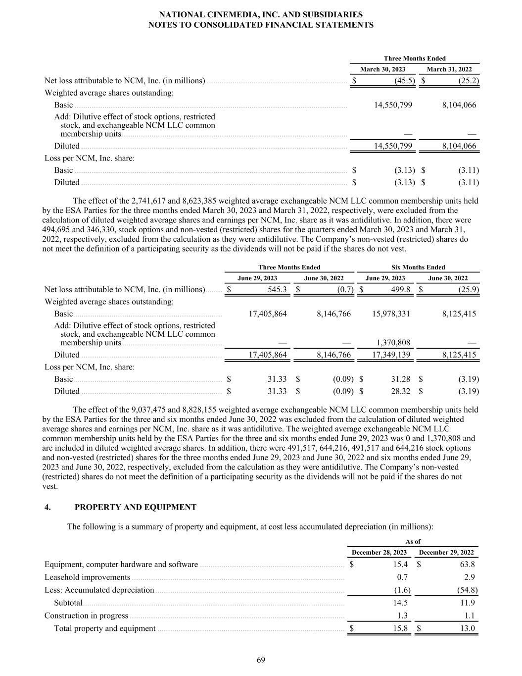 Three Months Ended March 30, 2023 March 31, 2022 Net loss attributable to NCM, Inc. (in millions) .................................................................. $ (45.5) $ (25.2) Weighted average shares outstanding: Basic ................................................................................................................................ 14,550,799 8,104,066 Add: Dilutive effect of stock options, restricted stock, and exchangeable NCM LLC common membership units .......................................................................................................... — — Diluted ............................................................................................................................. 14,550,799 8,104,066 Loss per NCM, Inc. share: Basic ................................................................................................................................ $ (3.13) $ (3.11) Diluted ............................................................................................................................. $ (3.13) $ (3.11) The effect of the 2,741,617 and 8,623,385 weighted average exchangeable NCM LLC common membership units held by the ESA Parties for the three months ended March 30, 2023 and March 31, 2022, respectively, were excluded from the calculation of diluted weighted average shares and earnings per NCM, Inc. share as it was antidilutive. In addition, there were 494,695 and 346,330, stock options and non-vested (restricted) shares for the quarters ended March 30, 2023 and March 31, 2022, respectively, excluded from the calculation as they were antidilutive. The Company’s non-vested (restricted) shares do not meet the definition of a participating security as the dividends will not be paid if the shares do not vest. Three Months Ended Six Months Ended June 29, 2023 June 30, 2022 June 29, 2023 June 30, 2022 Net loss attributable to NCM, Inc. (in millions) ........ $ 545.3 $ (0.7) $ 499.8 $ (25.9) Weighted average shares outstanding: Basic ...................................................................... 17,405,864 8,146,766 15,978,331 8,125,415 Add: Dilutive effect of stock options, restricted stock, and exchangeable NCM LLC common membership units ............................................... — — 1,370,808 — Diluted .................................................................. 17,405,864 8,146,766 17,349,139 8,125,415 Loss per NCM, Inc. share: Basic ...................................................................... $ 31.33 $ (0.09) $ 31.28 $ (3.19) Diluted .................................................................. $ 31.33 $ (0.09) $ 28.32 $ (3.19) The effect of the 9,037,475 and 8,828,155 weighted average exchangeable NCM LLC common membership units held by the ESA Parties for the three and six months ended June 30, 2022 was excluded from the calculation of diluted weighted average shares and earnings per NCM, Inc. share as it was antidilutive. The weighted average exchangeable NCM LLC common membership units held by the ESA Parties for the three and six months ended June 29, 2023 was 0 and 1,370,808 and are included in diluted weighted average shares. In addition, there were 491,517, 644,216, 491,517 and 644,216 stock options and non-vested (restricted) shares for the three months ended June 29, 2023 and June 30, 2022 and six months ended June 29, 2023 and June 30, 2022, respectively, excluded from the calculation as they were antidilutive. The Company’s non-vested (restricted) shares do not meet the definition of a participating security as the dividends will not be paid if the shares do not vest. 4. PROPERTY AND EQUIPMENT The following is a summary of property and equipment, at cost less accumulated depreciation (in millions): As of December 28, 2023 December 29, 2022 Equipment, computer hardware and software .................................................................... $ 15.4 $ 63.8 Leasehold improvements .................................................................................................... 0.7 2.9 Less: Accumulated depreciation ......................................................................................... (1.6) (54.8) Subtotal ........................................................................................................................... 14.5 11.9 Construction in progress ..................................................................................................... 1.3 1.1 Total property and equipment ........................................................................................ $ 15.8 $ 13.0 NATIONAL CINEMEDIA, INC. AND SUBSIDIARIES NOTES TO CONSOLIDATED FINANCIAL STATEMENTS 69
