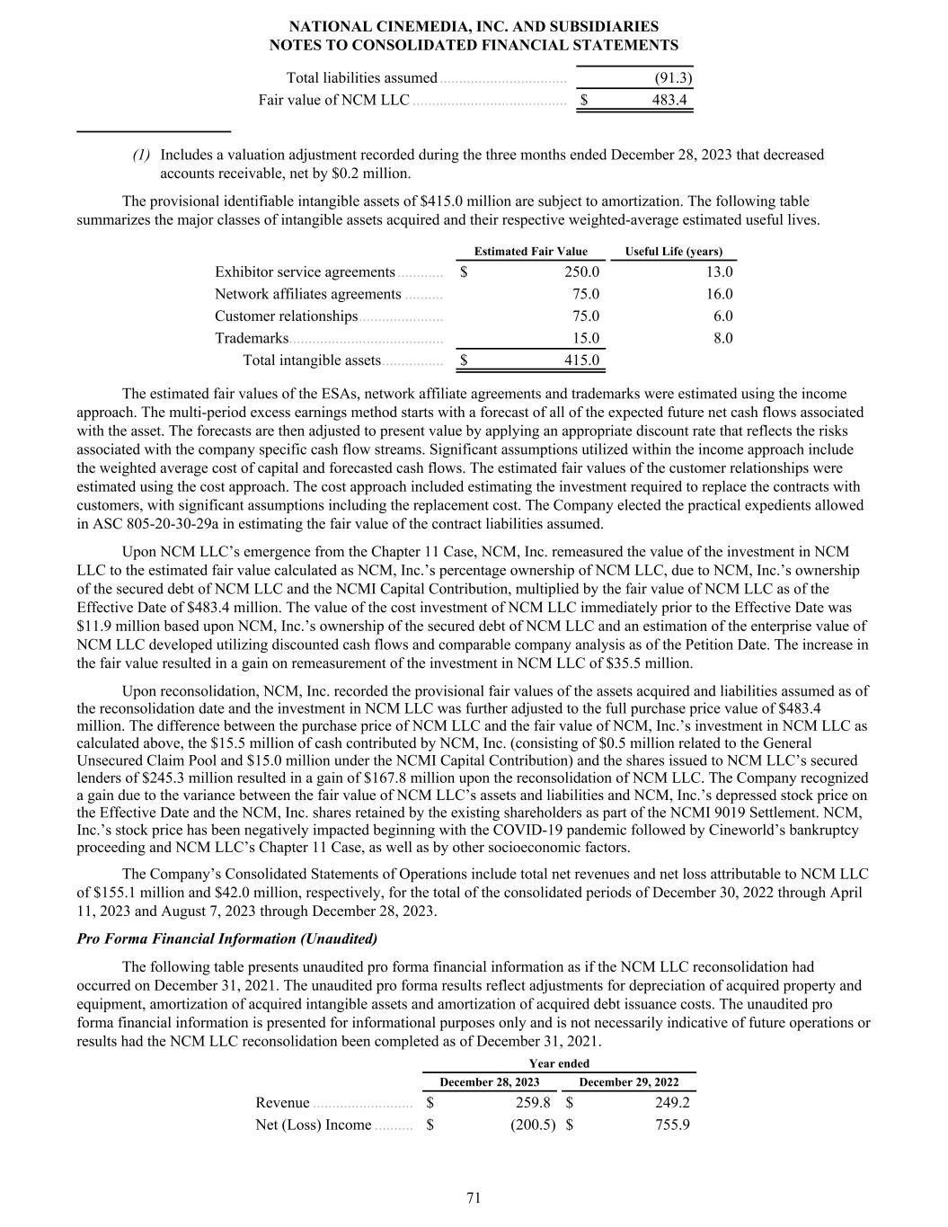 Total liabilities assumed ................................. (91.3) Fair value of NCM LLC ........................................ $ 483.4 (1) Includes a valuation adjustment recorded during the three months ended December 28, 2023 that decreased accounts receivable, net by $0.2 million. The provisional identifiable intangible assets of $415.0 million are subject to amortization. The following table summarizes the major classes of intangible assets acquired and their respective weighted-average estimated useful lives. Estimated Fair Value Useful Life (years) Exhibitor service agreements ............ $ 250.0 13.0 Network affiliates agreements .......... 75.0 16.0 Customer relationships ...................... 75.0 6.0 Trademarks ........................................ 15.0 8.0 Total intangible assets ................ $ 415.0 The estimated fair values of the ESAs, network affiliate agreements and trademarks were estimated using the income approach. The multi-period excess earnings method starts with a forecast of all of the expected future net cash flows associated with the asset. The forecasts are then adjusted to present value by applying an appropriate discount rate that reflects the risks associated with the company specific cash flow streams. Significant assumptions utilized within the income approach include the weighted average cost of capital and forecasted cash flows. The estimated fair values of the customer relationships were estimated using the cost approach. The cost approach included estimating the investment required to replace the contracts with customers, with significant assumptions including the replacement cost. The Company elected the practical expedients allowed in ASC 805-20-30-29a in estimating the fair value of the contract liabilities assumed. Upon NCM LLC’s emergence from the Chapter 11 Case, NCM, Inc. remeasured the value of the investment in NCM LLC to the estimated fair value calculated as NCM, Inc.’s percentage ownership of NCM LLC, due to NCM, Inc.’s ownership of the secured debt of NCM LLC and the NCMI Capital Contribution, multiplied by the fair value of NCM LLC as of the Effective Date of $483.4 million. The value of the cost investment of NCM LLC immediately prior to the Effective Date was $11.9 million based upon NCM, Inc.’s ownership of the secured debt of NCM LLC and an estimation of the enterprise value of NCM LLC developed utilizing discounted cash flows and comparable company analysis as of the Petition Date. The increase in the fair value resulted in a gain on remeasurement of the investment in NCM LLC of $35.5 million. Upon reconsolidation, NCM, Inc. recorded the provisional fair values of the assets acquired and liabilities assumed as of the reconsolidation date and the investment in NCM LLC was further adjusted to the full purchase price value of $483.4 million. The difference between the purchase price of NCM LLC and the fair value of NCM, Inc.’s investment in NCM LLC as calculated above, the $15.5 million of cash contributed by NCM, Inc. (consisting of $0.5 million related to the General Unsecured Claim Pool and $15.0 million under the NCMI Capital Contribution) and the shares issued to NCM LLC’s secured lenders of $245.3 million resulted in a gain of $167.8 million upon the reconsolidation of NCM LLC. The Company recognized a gain due to the variance between the fair value of NCM LLC’s assets and liabilities and NCM, Inc.’s depressed stock price on the Effective Date and the NCM, Inc. shares retained by the existing shareholders as part of the NCMI 9019 Settlement. NCM, Inc.’s stock price has been negatively impacted beginning with the COVID-19 pandemic followed by Cineworld’s bankruptcy proceeding and NCM LLC’s Chapter 11 Case, as well as by other socioeconomic factors. The Company’s Consolidated Statements of Operations include total net revenues and net loss attributable to NCM LLC of $155.1 million and $42.0 million, respectively, for the total of the consolidated periods of December 30, 2022 through April 11, 2023 and August 7, 2023 through December 28, 2023. Pro Forma Financial Information (Unaudited) The following table presents unaudited pro forma financial information as if the NCM LLC reconsolidation had occurred on December 31, 2021. The unaudited pro forma results reflect adjustments for depreciation of acquired property and equipment, amortization of acquired intangible assets and amortization of acquired debt issuance costs. The unaudited pro forma financial information is presented for informational purposes only and is not necessarily indicative of future operations or results had the NCM LLC reconsolidation been completed as of December 31, 2021. Year ended December 28, 2023 December 29, 2022 Revenue .......................... $ 259.8 $ 249.2 Net (Loss) Income .......... $ (200.5) $ 755.9 NATIONAL CINEMEDIA, INC. AND SUBSIDIARIES NOTES TO CONSOLIDATED FINANCIAL STATEMENTS 71