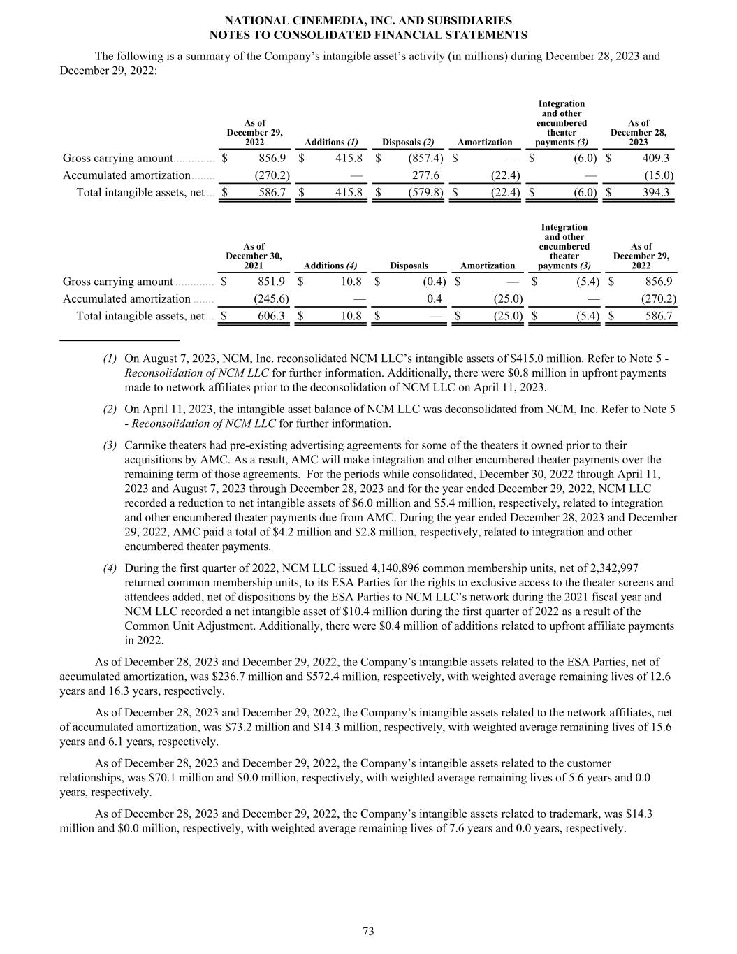 The following is a summary of the Company’s intangible asset’s activity (in millions) during December 28, 2023 and December 29, 2022: As of December 29, 2022 Additions (1) Disposals (2) Amortization Integration and other encumbered theater payments (3) As of December 28, 2023 Gross carrying amount .............. $ 856.9 $ 415.8 $ (857.4) $ — $ (6.0) $ 409.3 Accumulated amortization ........ (270.2) — 277.6 (22.4) — (15.0) Total intangible assets, net ... $ 586.7 $ 415.8 $ (579.8) $ (22.4) $ (6.0) $ 394.3 As of December 30, 2021 Additions (4) Disposals Amortization Integration and other encumbered theater payments (3) As of December 29, 2022 Gross carrying amount ............. $ 851.9 $ 10.8 $ (0.4) $ — $ (5.4) $ 856.9 Accumulated amortization ....... (245.6) — 0.4 (25.0) — (270.2) Total intangible assets, net ... $ 606.3 $ 10.8 $ — $ (25.0) $ (5.4) $ 586.7 (1) On August 7, 2023, NCM, Inc. reconsolidated NCM LLC’s intangible assets of $415.0 million. Refer to Note 5 - Reconsolidation of NCM LLC for further information. Additionally, there were $0.8 million in upfront payments made to network affiliates prior to the deconsolidation of NCM LLC on April 11, 2023. (2) On April 11, 2023, the intangible asset balance of NCM LLC was deconsolidated from NCM, Inc. Refer to Note 5 - Reconsolidation of NCM LLC for further information. (3) Carmike theaters had pre-existing advertising agreements for some of the theaters it owned prior to their acquisitions by AMC. As a result, AMC will make integration and other encumbered theater payments over the remaining term of those agreements. For the periods while consolidated, December 30, 2022 through April 11, 2023 and August 7, 2023 through December 28, 2023 and for the year ended December 29, 2022, NCM LLC recorded a reduction to net intangible assets of $6.0 million and $5.4 million, respectively, related to integration and other encumbered theater payments due from AMC. During the year ended December 28, 2023 and December 29, 2022, AMC paid a total of $4.2 million and $2.8 million, respectively, related to integration and other encumbered theater payments. (4) During the first quarter of 2022, NCM LLC issued 4,140,896 common membership units, net of 2,342,997 returned common membership units, to its ESA Parties for the rights to exclusive access to the theater screens and attendees added, net of dispositions by the ESA Parties to NCM LLC’s network during the 2021 fiscal year and NCM LLC recorded a net intangible asset of $10.4 million during the first quarter of 2022 as a result of the Common Unit Adjustment. Additionally, there were $0.4 million of additions related to upfront affiliate payments in 2022. As of December 28, 2023 and December 29, 2022, the Company’s intangible assets related to the ESA Parties, net of accumulated amortization, was $236.7 million and $572.4 million, respectively, with weighted average remaining lives of 12.6 years and 16.3 years, respectively. As of December 28, 2023 and December 29, 2022, the Company’s intangible assets related to the network affiliates, net of accumulated amortization, was $73.2 million and $14.3 million, respectively, with weighted average remaining lives of 15.6 years and 6.1 years, respectively. As of December 28, 2023 and December 29, 2022, the Company’s intangible assets related to the customer relationships, was $70.1 million and $0.0 million, respectively, with weighted average remaining lives of 5.6 years and 0.0 years, respectively. As of December 28, 2023 and December 29, 2022, the Company’s intangible assets related to trademark, was $14.3 million and $0.0 million, respectively, with weighted average remaining lives of 7.6 years and 0.0 years, respectively. NATIONAL CINEMEDIA, INC. AND SUBSIDIARIES NOTES TO CONSOLIDATED FINANCIAL STATEMENTS 73