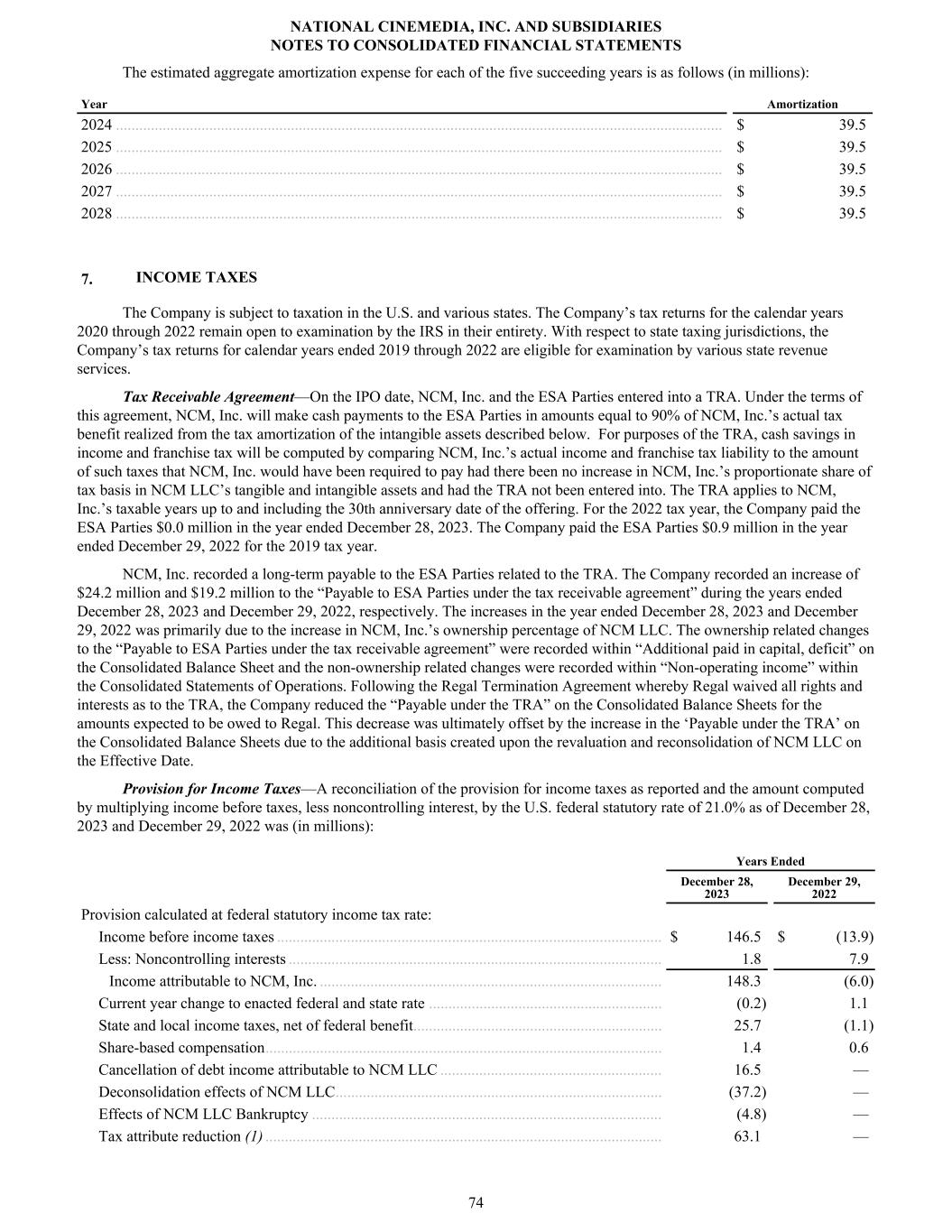 The estimated aggregate amortization expense for each of the five succeeding years is as follows (in millions): Year Amortization 2024 ............................................................................................................................................................ $ 39.5 2025 ............................................................................................................................................................ $ 39.5 2026 ............................................................................................................................................................ $ 39.5 2027 ............................................................................................................................................................ $ 39.5 2028 ............................................................................................................................................................ $ 39.5 7. INCOME TAXES The Company is subject to taxation in the U.S. and various states. The Company’s tax returns for the calendar years 2020 through 2022 remain open to examination by the IRS in their entirety. With respect to state taxing jurisdictions, the Company’s tax returns for calendar years ended 2019 through 2022 are eligible for examination by various state revenue services. Tax Receivable Agreement—On the IPO date, NCM, Inc. and the ESA Parties entered into a TRA. Under the terms of this agreement, NCM, Inc. will make cash payments to the ESA Parties in amounts equal to 90% of NCM, Inc.’s actual tax benefit realized from the tax amortization of the intangible assets described below. For purposes of the TRA, cash savings in income and franchise tax will be computed by comparing NCM, Inc.’s actual income and franchise tax liability to the amount of such taxes that NCM, Inc. would have been required to pay had there been no increase in NCM, Inc.’s proportionate share of tax basis in NCM LLC’s tangible and intangible assets and had the TRA not been entered into. The TRA applies to NCM, Inc.’s taxable years up to and including the 30th anniversary date of the offering. For the 2022 tax year, the Company paid the ESA Parties $0.0 million in the year ended December 28, 2023. The Company paid the ESA Parties $0.9 million in the year ended December 29, 2022 for the 2019 tax year. NCM, Inc. recorded a long-term payable to the ESA Parties related to the TRA. The Company recorded an increase of $24.2 million and $19.2 million to the “Payable to ESA Parties under the tax receivable agreement” during the years ended December 28, 2023 and December 29, 2022, respectively. The increases in the year ended December 28, 2023 and December 29, 2022 was primarily due to the increase in NCM, Inc.’s ownership percentage of NCM LLC. The ownership related changes to the “Payable to ESA Parties under the tax receivable agreement” were recorded within “Additional paid in capital, deficit” on the Consolidated Balance Sheet and the non-ownership related changes were recorded within “Non-operating income” within the Consolidated Statements of Operations. Following the Regal Termination Agreement whereby Regal waived all rights and interests as to the TRA, the Company reduced the “Payable under the TRA” on the Consolidated Balance Sheets for the amounts expected to be owed to Regal. This decrease was ultimately offset by the increase in the ‘Payable under the TRA’ on the Consolidated Balance Sheets due to the additional basis created upon the revaluation and reconsolidation of NCM LLC on the Effective Date. Provision for Income Taxes—A reconciliation of the provision for income taxes as reported and the amount computed by multiplying income before taxes, less noncontrolling interest, by the U.S. federal statutory rate of 21.0% as of December 28, 2023 and December 29, 2022 was (in millions): Years Ended December 28, 2023 December 29, 2022 Provision calculated at federal statutory income tax rate: Income before income taxes ................................................................................................... $ 146.5 $ (13.9) Less: Noncontrolling interests ................................................................................................ 1.8 7.9 Income attributable to NCM, Inc. ........................................................................................ 148.3 (6.0) Current year change to enacted federal and state rate ............................................................ (0.2) 1.1 State and local income taxes, net of federal benefit ................................................................ 25.7 (1.1) Share-based compensation ...................................................................................................... 1.4 0.6 Cancellation of debt income attributable to NCM LLC ......................................................... 16.5 — Deconsolidation effects of NCM LLC .................................................................................... (37.2) — Effects of NCM LLC Bankruptcy .......................................................................................... (4.8) — Tax attribute reduction (1) ...................................................................................................... 63.1 — NATIONAL CINEMEDIA, INC. AND SUBSIDIARIES NOTES TO CONSOLIDATED FINANCIAL STATEMENTS 74