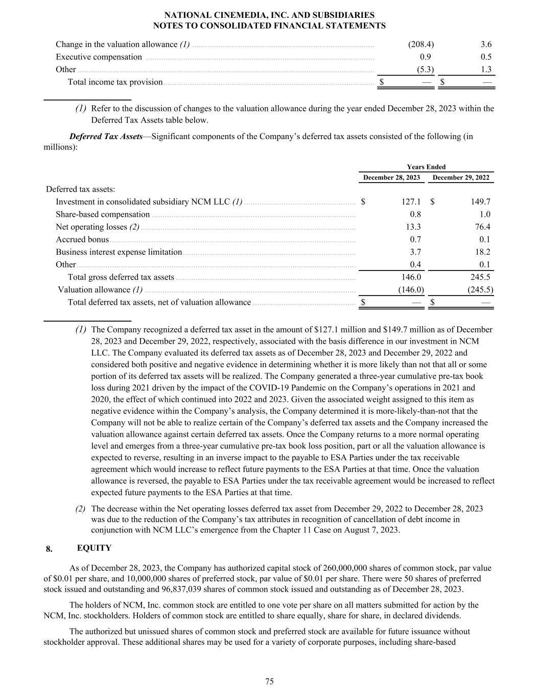 Change in the valuation allowance (1) ................................................................................... (208.4) 3.6 Executive compensation ........................................................................................................ 0.9 0.5 Other ....................................................................................................................................... (5.3) 1.3 Total income tax provision ................................................................................................ $ — $ — (1) Refer to the discussion of changes to the valuation allowance during the year ended December 28, 2023 within the Deferred Tax Assets table below. Deferred Tax Assets—Significant components of the Company’s deferred tax assets consisted of the following (in millions): Years Ended December 28, 2023 December 29, 2022 Deferred tax assets: Investment in consolidated subsidiary NCM LLC (1) ................................................... $ 127.1 $ 149.7 Share-based compensation ............................................................................................. 0.8 1.0 Net operating losses (2) .................................................................................................. 13.3 76.4 Accrued bonus ................................................................................................................ 0.7 0.1 Business interest expense limitation ............................................................................... 3.7 18.2 Other ............................................................................................................................... 0.4 0.1 Total gross deferred tax assets .................................................................................. 146.0 245.5 Valuation allowance (1) ................................................................................................ (146.0) (245.5) Total deferred tax assets, net of valuation allowance ............................................... $ — $ — (1) The Company recognized a deferred tax asset in the amount of $127.1 million and $149.7 million as of December 28, 2023 and December 29, 2022, respectively, associated with the basis difference in our investment in NCM LLC. The Company evaluated its deferred tax assets as of December 28, 2023 and December 29, 2022 and considered both positive and negative evidence in determining whether it is more likely than not that all or some portion of its deferred tax assets will be realized. The Company generated a three-year cumulative pre-tax book loss during 2021 driven by the impact of the COVID-19 Pandemic on the Company’s operations in 2021 and 2020, the effect of which continued into 2022 and 2023. Given the associated weight assigned to this item as negative evidence within the Company’s analysis, the Company determined it is more-likely-than-not that the Company will not be able to realize certain of the Company’s deferred tax assets and the Company increased the valuation allowance against certain deferred tax assets. Once the Company returns to a more normal operating level and emerges from a three-year cumulative pre-tax book loss position, part or all the valuation allowance is expected to reverse, resulting in an inverse impact to the payable to ESA Parties under the tax receivable agreement which would increase to reflect future payments to the ESA Parties at that time. Once the valuation allowance is reversed, the payable to ESA Parties under the tax receivable agreement would be increased to reflect expected future payments to the ESA Parties at that time. (2) The decrease within the Net operating losses deferred tax asset from December 29, 2022 to December 28, 2023 was due to the reduction of the Company’s tax attributes in recognition of cancellation of debt income in conjunction with NCM LLC’s emergence from the Chapter 11 Case on August 7, 2023. 8. EQUITY As of December 28, 2023, the Company has authorized capital stock of 260,000,000 shares of common stock, par value of $0.01 per share, and 10,000,000 shares of preferred stock, par value of $0.01 per share. There were 50 shares of preferred stock issued and outstanding and 96,837,039 shares of common stock issued and outstanding as of December 28, 2023. The holders of NCM, Inc. common stock are entitled to one vote per share on all matters submitted for action by the NCM, Inc. stockholders. Holders of common stock are entitled to share equally, share for share, in declared dividends. The authorized but unissued shares of common stock and preferred stock are available for future issuance without stockholder approval. These additional shares may be used for a variety of corporate purposes, including share-based NATIONAL CINEMEDIA, INC. AND SUBSIDIARIES NOTES TO CONSOLIDATED FINANCIAL STATEMENTS 75