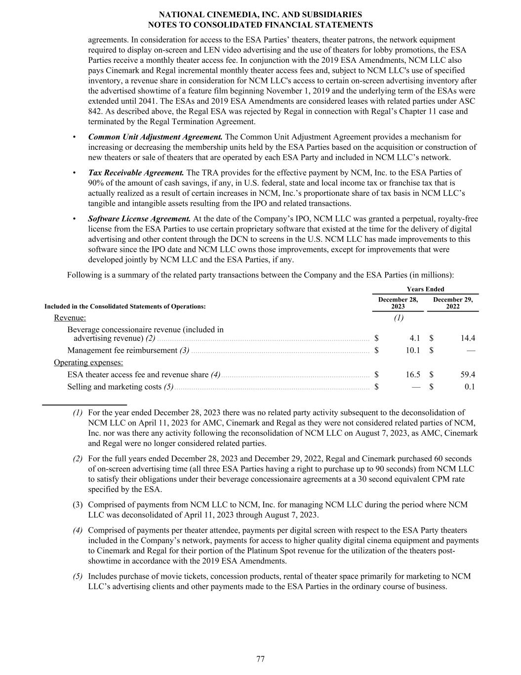 agreements. In consideration for access to the ESA Parties’ theaters, theater patrons, the network equipment required to display on-screen and LEN video advertising and the use of theaters for lobby promotions, the ESA Parties receive a monthly theater access fee. In conjunction with the 2019 ESA Amendments, NCM LLC also pays Cinemark and Regal incremental monthly theater access fees and, subject to NCM LLC's use of specified inventory, a revenue share in consideration for NCM LLC's access to certain on-screen advertising inventory after the advertised showtime of a feature film beginning November 1, 2019 and the underlying term of the ESAs were extended until 2041. The ESAs and 2019 ESA Amendments are considered leases with related parties under ASC 842. As described above, the Regal ESA was rejected by Regal in connection with Regal’s Chapter 11 case and terminated by the Regal Termination Agreement. • Common Unit Adjustment Agreement. The Common Unit Adjustment Agreement provides a mechanism for increasing or decreasing the membership units held by the ESA Parties based on the acquisition or construction of new theaters or sale of theaters that are operated by each ESA Party and included in NCM LLC’s network. • Tax Receivable Agreement. The TRA provides for the effective payment by NCM, Inc. to the ESA Parties of 90% of the amount of cash savings, if any, in U.S. federal, state and local income tax or franchise tax that is actually realized as a result of certain increases in NCM, Inc.’s proportionate share of tax basis in NCM LLC’s tangible and intangible assets resulting from the IPO and related transactions. • Software License Agreement. At the date of the Company’s IPO, NCM LLC was granted a perpetual, royalty-free license from the ESA Parties to use certain proprietary software that existed at the time for the delivery of digital advertising and other content through the DCN to screens in the U.S. NCM LLC has made improvements to this software since the IPO date and NCM LLC owns those improvements, except for improvements that were developed jointly by NCM LLC and the ESA Parties, if any. Following is a summary of the related party transactions between the Company and the ESA Parties (in millions): Years Ended Included in the Consolidated Statements of Operations: December 28, 2023 December 29, 2022 Revenue: (1) Beverage concessionaire revenue (included in advertising revenue) (2) .................................................................................................... $ 4.1 $ 14.4 Management fee reimbursement (3) .................................................................................... $ 10.1 $ — Operating expenses: ESA theater access fee and revenue share (4) ...................................................................... $ 16.5 $ 59.4 Selling and marketing costs (5) ............................................................................................ $ — $ 0.1 (1) For the year ended December 28, 2023 there was no related party activity subsequent to the deconsolidation of NCM LLC on April 11, 2023 for AMC, Cinemark and Regal as they were not considered related parties of NCM, Inc. nor was there any activity following the reconsolidation of NCM LLC on August 7, 2023, as AMC, Cinemark and Regal were no longer considered related parties. (2) For the full years ended December 28, 2023 and December 29, 2022, Regal and Cinemark purchased 60 seconds of on-screen advertising time (all three ESA Parties having a right to purchase up to 90 seconds) from NCM LLC to satisfy their obligations under their beverage concessionaire agreements at a 30 second equivalent CPM rate specified by the ESA. (3) Comprised of payments from NCM LLC to NCM, Inc. for managing NCM LLC during the period where NCM LLC was deconsolidated of April 11, 2023 through August 7, 2023. (4) Comprised of payments per theater attendee, payments per digital screen with respect to the ESA Party theaters included in the Company’s network, payments for access to higher quality digital cinema equipment and payments to Cinemark and Regal for their portion of the Platinum Spot revenue for the utilization of the theaters post- showtime in accordance with the 2019 ESA Amendments. (5) Includes purchase of movie tickets, concession products, rental of theater space primarily for marketing to NCM LLC’s advertising clients and other payments made to the ESA Parties in the ordinary course of business. NATIONAL CINEMEDIA, INC. AND SUBSIDIARIES NOTES TO CONSOLIDATED FINANCIAL STATEMENTS 77