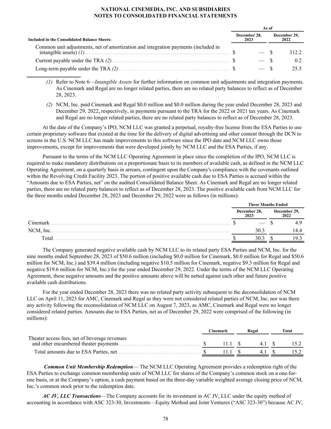 As of Included in the Consolidated Balance Sheets: December 28, 2023 December 29, 2022 Common unit adjustments, net of amortization and integration payments (included in intangible assets) (1) ........................................................................................................... $ — $ 312.2 Current payable under the TRA (2) ....................................................................................... $ — $ 0.2 Long-term payable under the TRA (2) .................................................................................. $ — $ 25.5 (1) Refer to Note 6—Intangible Assets for further information on common unit adjustments and integration payments. As Cinemark and Regal are no longer related parties, there are no related party balances to reflect as of December 28, 2023. (2) NCM, Inc. paid Cinemark and Regal $0.0 million and $0.0 million during the year ended December 28, 2023 and December 29, 2022, respectively, in payments pursuant to the TRA for the 2022 or 2021 tax years. As Cinemark and Regal are no longer related parties, there are no related party balances to reflect as of December 28, 2023. At the date of the Company’s IPO, NCM LLC was granted a perpetual, royalty-free license from the ESA Parties to use certain proprietary software that existed at the time for the delivery of digital advertising and other content through the DCN to screens in the U.S. NCM LLC has made improvements to this software since the IPO date and NCM LLC owns those improvements, except for improvements that were developed jointly by NCM LLC and the ESA Parties, if any. Pursuant to the terms of the NCM LLC Operating Agreement in place since the completion of the IPO, NCM LLC is required to make mandatory distributions on a proportionate basis to its members of available cash, as defined in the NCM LLC Operating Agreement, on a quarterly basis in arrears, contingent upon the Company's compliance with the covenants outlined within the Revolving Credit Facility 2023. The portion of positive available cash due to ESA Parties is accrued within the “Amounts due to ESA Parties, net” on the audited Consolidated Balance Sheet. As Cinemark and Regal are no longer related parties, there are no related party balances to reflect as of December 28, 2023. The positive available cash from NCM LLC for the three months ended December 28, 2023 and December 29, 2022 were as follows (in millions): Three Months Ended December 28, 2023 December 29, 2022 Cinemark ..................................................................................................................................... $ — $ 4.9 NCM, Inc. .................................................................................................................................... 30.3 14.4 Total ................................................................................................................................... $ 30.3 $ 19.3 The Company generated negative available cash by NCM LLC to its related party ESA Parties and NCM, Inc. for the nine months ended September 28, 2023 of $50.6 million (including $0.0 million for Cinemark, $0.0 million for Regal and $50.6 million for NCM, Inc.) and $39.4 million (including negative $10.5 million for Cinemark, negative $9.3 million for Regal and negative $19.6 million for NCM, Inc.) for the year ended December 29, 2022. Under the terms of the NCM LLC Operating Agreement, these negative amounts and the positive amounts above will be netted against each other and future positive available cash distributions. For the year ended December 28, 2023 there was no related party activity subsequent to the deconsolidation of NCM LLC on April 11, 2023 for AMC, Cinemark and Regal as they were not considered related parties of NCM, Inc. nor was there any activity following the reconsolidation of NCM LLC on August 7, 2023, as AMC, Cinemark and Regal were no longer considered related parties. Amounts due to ESA Parties, net as of December 29, 2022 were comprised of the following (in millions): Cinemark Regal Total Theater access fees, net of beverage revenues and other encumbered theater payments ............................................................ $ 11.1 $ 4.1 $ 15.2 Total amounts due to ESA Parties, net ............................................................. $ 11.1 $ 4.1 $ 15.2 Common Unit Membership Redemption— The NCM LLC Operating Agreement provides a redemption right of the ESA Parties to exchange common membership units of NCM LLC for shares of the Company’s common stock on a one-for- one basis, or at the Company’s option, a cash payment based on the three-day variable weighted average closing price of NCM, Inc.’s common stock prior to the redemption date. AC JV, LLC Transactions—The Company accounts for its investment in AC JV, LLC under the equity method of accounting in accordance with ASC 323-30, Investments—Equity Method and Joint Ventures (“ASC 323-30”) because AC JV, NATIONAL CINEMEDIA, INC. AND SUBSIDIARIES NOTES TO CONSOLIDATED FINANCIAL STATEMENTS 78