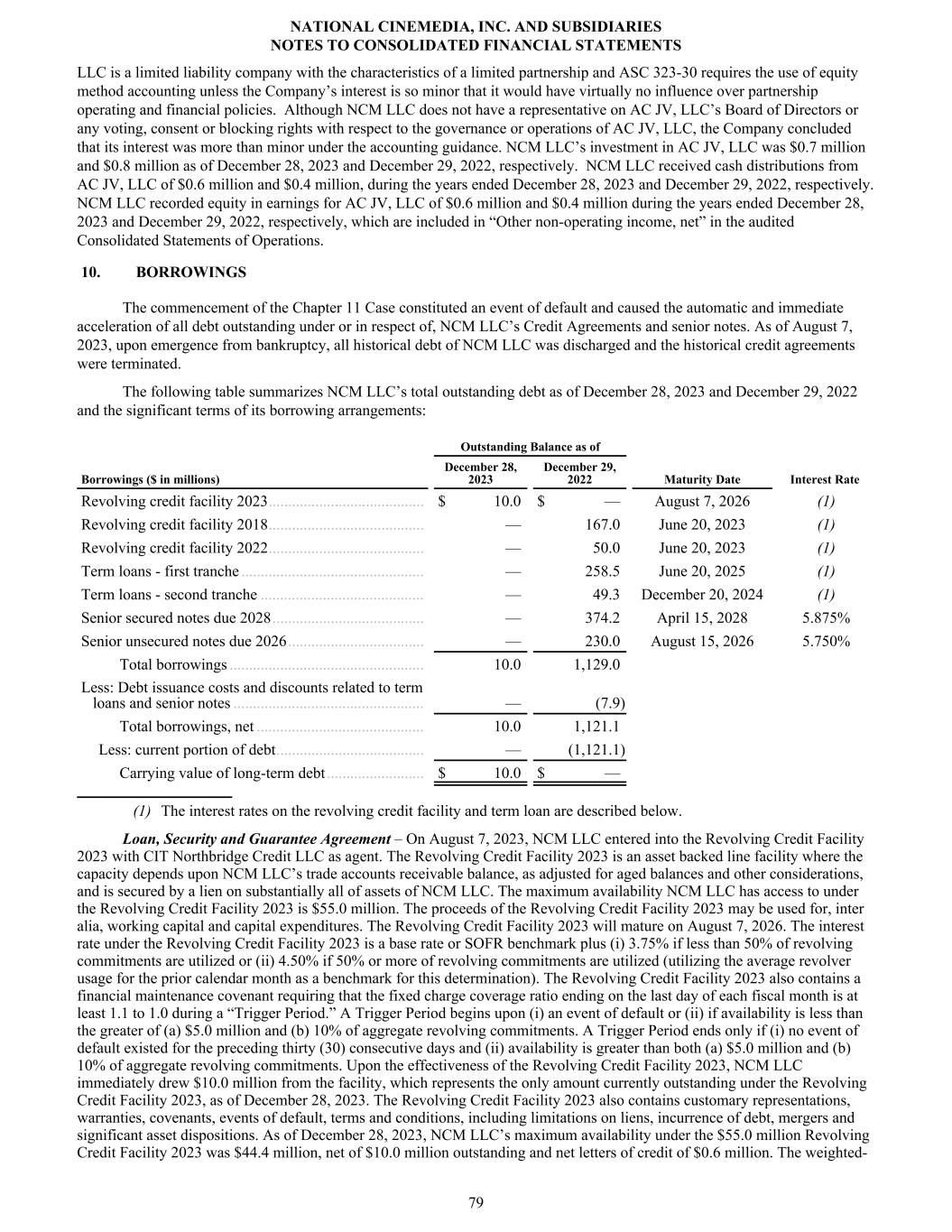 LLC is a limited liability company with the characteristics of a limited partnership and ASC 323-30 requires the use of equity method accounting unless the Company’s interest is so minor that it would have virtually no influence over partnership operating and financial policies. Although NCM LLC does not have a representative on AC JV, LLC’s Board of Directors or any voting, consent or blocking rights with respect to the governance or operations of AC JV, LLC, the Company concluded that its interest was more than minor under the accounting guidance. NCM LLC’s investment in AC JV, LLC was $0.7 million and $0.8 million as of December 28, 2023 and December 29, 2022, respectively. NCM LLC received cash distributions from AC JV, LLC of $0.6 million and $0.4 million, during the years ended December 28, 2023 and December 29, 2022, respectively. NCM LLC recorded equity in earnings for AC JV, LLC of $0.6 million and $0.4 million during the years ended December 28, 2023 and December 29, 2022, respectively, which are included in “Other non-operating income, net” in the audited Consolidated Statements of Operations. 10. BORROWINGS The commencement of the Chapter 11 Case constituted an event of default and caused the automatic and immediate acceleration of all debt outstanding under or in respect of, NCM LLC’s Credit Agreements and senior notes. As of August 7, 2023, upon emergence from bankruptcy, all historical debt of NCM LLC was discharged and the historical credit agreements were terminated. The following table summarizes NCM LLC’s total outstanding debt as of December 28, 2023 and December 29, 2022 and the significant terms of its borrowing arrangements: Outstanding Balance as of Borrowings ($ in millions) December 28, 2023 December 29, 2022 Maturity Date Interest Rate Revolving credit facility 2023 ........................................ $ 10.0 $ — August 7, 2026 (1) Revolving credit facility 2018 ........................................ — 167.0 June 20, 2023 (1) Revolving credit facility 2022 ........................................ — 50.0 June 20, 2023 (1) Term loans - first tranche ............................................... — 258.5 June 20, 2025 (1) Term loans - second tranche .......................................... — 49.3 December 20, 2024 (1) Senior secured notes due 2028 ....................................... — 374.2 April 15, 2028 5.875% Senior unsecured notes due 2026 ................................... — 230.0 August 15, 2026 5.750% Total borrowings .................................................. 10.0 1,129.0 Less: Debt issuance costs and discounts related to term loans and senior notes ................................................. — (7.9) Total borrowings, net ........................................... 10.0 1,121.1 Less: current portion of debt ...................................... — (1,121.1) Carrying value of long-term debt ......................... $ 10.0 $ — (1) The interest rates on the revolving credit facility and term loan are described below. Loan, Security and Guarantee Agreement – On August 7, 2023, NCM LLC entered into the Revolving Credit Facility 2023 with CIT Northbridge Credit LLC as agent. The Revolving Credit Facility 2023 is an asset backed line facility where the capacity depends upon NCM LLC’s trade accounts receivable balance, as adjusted for aged balances and other considerations, and is secured by a lien on substantially all of assets of NCM LLC. The maximum availability NCM LLC has access to under the Revolving Credit Facility 2023 is $55.0 million. The proceeds of the Revolving Credit Facility 2023 may be used for, inter alia, working capital and capital expenditures. The Revolving Credit Facility 2023 will mature on August 7, 2026. The interest rate under the Revolving Credit Facility 2023 is a base rate or SOFR benchmark plus (i) 3.75% if less than 50% of revolving commitments are utilized or (ii) 4.50% if 50% or more of revolving commitments are utilized (utilizing the average revolver usage for the prior calendar month as a benchmark for this determination). The Revolving Credit Facility 2023 also contains a financial maintenance covenant requiring that the fixed charge coverage ratio ending on the last day of each fiscal month is at least 1.1 to 1.0 during a “Trigger Period.” A Trigger Period begins upon (i) an event of default or (ii) if availability is less than the greater of (a) $5.0 million and (b) 10% of aggregate revolving commitments. A Trigger Period ends only if (i) no event of default existed for the preceding thirty (30) consecutive days and (ii) availability is greater than both (a) $5.0 million and (b) 10% of aggregate revolving commitments. Upon the effectiveness of the Revolving Credit Facility 2023, NCM LLC immediately drew $10.0 million from the facility, which represents the only amount currently outstanding under the Revolving Credit Facility 2023, as of December 28, 2023. The Revolving Credit Facility 2023 also contains customary representations, warranties, covenants, events of default, terms and conditions, including limitations on liens, incurrence of debt, mergers and significant asset dispositions. As of December 28, 2023, NCM LLC’s maximum availability under the $55.0 million Revolving Credit Facility 2023 was $44.4 million, net of $10.0 million outstanding and net letters of credit of $0.6 million. The weighted- NATIONAL CINEMEDIA, INC. AND SUBSIDIARIES NOTES TO CONSOLIDATED FINANCIAL STATEMENTS 79