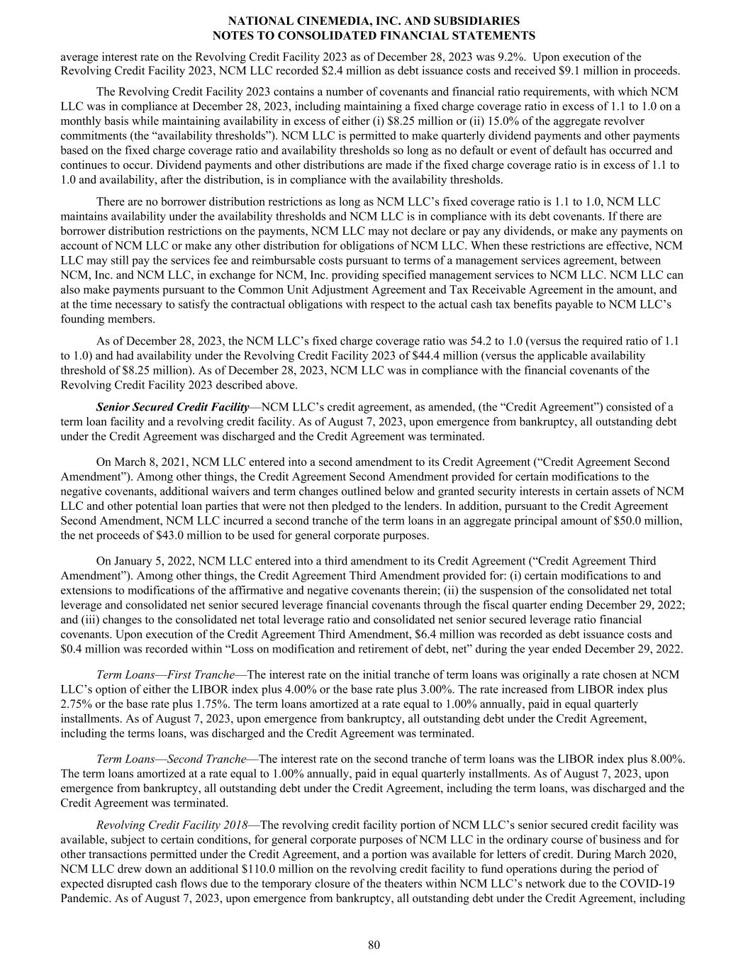 average interest rate on the Revolving Credit Facility 2023 as of December 28, 2023 was 9.2%. Upon execution of the Revolving Credit Facility 2023, NCM LLC recorded $2.4 million as debt issuance costs and received $9.1 million in proceeds. The Revolving Credit Facility 2023 contains a number of covenants and financial ratio requirements, with which NCM LLC was in compliance at December 28, 2023, including maintaining a fixed charge coverage ratio in excess of 1.1 to 1.0 on a monthly basis while maintaining availability in excess of either (i) $8.25 million or (ii) 15.0% of the aggregate revolver commitments (the “availability thresholds”). NCM LLC is permitted to make quarterly dividend payments and other payments based on the fixed charge coverage ratio and availability thresholds so long as no default or event of default has occurred and continues to occur. Dividend payments and other distributions are made if the fixed charge coverage ratio is in excess of 1.1 to 1.0 and availability, after the distribution, is in compliance with the availability thresholds. There are no borrower distribution restrictions as long as NCM LLC’s fixed coverage ratio is 1.1 to 1.0, NCM LLC maintains availability under the availability thresholds and NCM LLC is in compliance with its debt covenants. If there are borrower distribution restrictions on the payments, NCM LLC may not declare or pay any dividends, or make any payments on account of NCM LLC or make any other distribution for obligations of NCM LLC. When these restrictions are effective, NCM LLC may still pay the services fee and reimbursable costs pursuant to terms of a management services agreement, between NCM, Inc. and NCM LLC, in exchange for NCM, Inc. providing specified management services to NCM LLC. NCM LLC can also make payments pursuant to the Common Unit Adjustment Agreement and Tax Receivable Agreement in the amount, and at the time necessary to satisfy the contractual obligations with respect to the actual cash tax benefits payable to NCM LLC’s founding members. As of December 28, 2023, the NCM LLC’s fixed charge coverage ratio was 54.2 to 1.0 (versus the required ratio of 1.1 to 1.0) and had availability under the Revolving Credit Facility 2023 of $44.4 million (versus the applicable availability threshold of $8.25 million). As of December 28, 2023, NCM LLC was in compliance with the financial covenants of the Revolving Credit Facility 2023 described above. Senior Secured Credit Facility—NCM LLC’s credit agreement, as amended, (the “Credit Agreement”) consisted of a term loan facility and a revolving credit facility. As of August 7, 2023, upon emergence from bankruptcy, all outstanding debt under the Credit Agreement was discharged and the Credit Agreement was terminated. On March 8, 2021, NCM LLC entered into a second amendment to its Credit Agreement (“Credit Agreement Second Amendment”). Among other things, the Credit Agreement Second Amendment provided for certain modifications to the negative covenants, additional waivers and term changes outlined below and granted security interests in certain assets of NCM LLC and other potential loan parties that were not then pledged to the lenders. In addition, pursuant to the Credit Agreement Second Amendment, NCM LLC incurred a second tranche of the term loans in an aggregate principal amount of $50.0 million, the net proceeds of $43.0 million to be used for general corporate purposes. On January 5, 2022, NCM LLC entered into a third amendment to its Credit Agreement (“Credit Agreement Third Amendment”). Among other things, the Credit Agreement Third Amendment provided for: (i) certain modifications to and extensions to modifications of the affirmative and negative covenants therein; (ii) the suspension of the consolidated net total leverage and consolidated net senior secured leverage financial covenants through the fiscal quarter ending December 29, 2022; and (iii) changes to the consolidated net total leverage ratio and consolidated net senior secured leverage ratio financial covenants. Upon execution of the Credit Agreement Third Amendment, $6.4 million was recorded as debt issuance costs and $0.4 million was recorded within “Loss on modification and retirement of debt, net” during the year ended December 29, 2022. Term Loans—First Tranche—The interest rate on the initial tranche of term loans was originally a rate chosen at NCM LLC’s option of either the LIBOR index plus 4.00% or the base rate plus 3.00%. The rate increased from LIBOR index plus 2.75% or the base rate plus 1.75%. The term loans amortized at a rate equal to 1.00% annually, paid in equal quarterly installments. As of August 7, 2023, upon emergence from bankruptcy, all outstanding debt under the Credit Agreement, including the terms loans, was discharged and the Credit Agreement was terminated. Term Loans—Second Tranche—The interest rate on the second tranche of term loans was the LIBOR index plus 8.00%. The term loans amortized at a rate equal to 1.00% annually, paid in equal quarterly installments. As of August 7, 2023, upon emergence from bankruptcy, all outstanding debt under the Credit Agreement, including the term loans, was discharged and the Credit Agreement was terminated. Revolving Credit Facility 2018—The revolving credit facility portion of NCM LLC’s senior secured credit facility was available, subject to certain conditions, for general corporate purposes of NCM LLC in the ordinary course of business and for other transactions permitted under the Credit Agreement, and a portion was available for letters of credit. During March 2020, NCM LLC drew down an additional $110.0 million on the revolving credit facility to fund operations during the period of expected disrupted cash flows due to the temporary closure of the theaters within NCM LLC’s network due to the COVID-19 Pandemic. As of August 7, 2023, upon emergence from bankruptcy, all outstanding debt under the