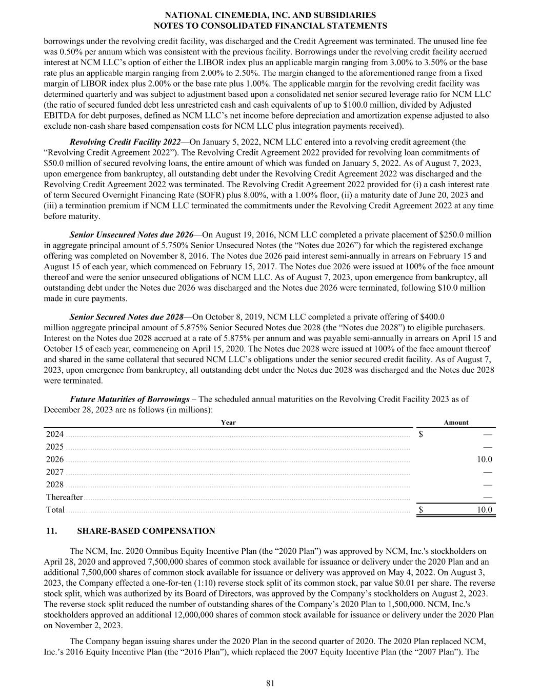 borrowings under the revolving credit facility, was discharged and the Credit Agreement was terminated. The unused line fee was 0.50% per annum which was consistent with the previous facility. Borrowings under the revolving credit facility accrued interest at NCM LLC’s option of either the LIBOR index plus an applicable margin ranging from 3.00% to 3.50% or the base rate plus an applicable margin ranging from 2.00% to 2.50%. The margin changed to the aforementioned range from a fixed margin of LIBOR index plus 2.00% or the base rate plus 1.00%. The applicable margin for the revolving credit facility was determined quarterly and was subject to adjustment based upon a consolidated net senior secured leverage ratio for NCM LLC (the ratio of secured funded debt less unrestricted cash and cash equivalents of up to $100.0 million, divided by Adjusted EBITDA for debt purposes, defined as NCM LLC’s net income before depreciation and amortization expense adjusted to also exclude non-cash share based compensation costs for NCM LLC plus integration payments received). Revolving Credit Facility 2022—On January 5, 2022, NCM LLC entered into a revolving credit agreement (the “Revolving Credit Agreement 2022”). The Revolving Credit Agreement 2022 provided for revolving loan commitments of $50.0 million of secured revolving loans, the entire amount of which was funded on January 5, 2022. As of August 7, 2023, upon emergence from bankruptcy, all outstanding debt under the Revolving Credit Agreement 2022 was discharged and the Revolving Credit Agreement 2022 was terminated. The Revolving Credit Agreement 2022 provided for (i) a cash interest rate of term Secured Overnight Financing Rate (SOFR) plus 8.00%, with a 1.00% floor, (ii) a maturity date of June 20, 2023 and (iii) a termination premium if NCM LLC terminated the commitments under the Revolving Credit Agreement 2022 at any time before maturity. Senior Unsecured Notes due 2026—On August 19, 2016, NCM LLC completed a private placement of $250.0 million in aggregate principal amount of 5.750% Senior Unsecured Notes (the “Notes due 2026”) for which the registered exchange offering was completed on November 8, 2016. The Notes due 2026 paid interest semi-annually in arrears on February 15 and August 15 of each year, which commenced on February 15, 2017. The Notes due 2026 were issued at 100% of the face amount thereof and were the senior unsecured obligations of NCM LLC. As of August 7, 2023, upon emergence from bankruptcy, all outstanding debt under the Notes due 2026 was discharged and the Notes due 2026 were terminated, following $10.0 million made in cure payments. Senior Secured Notes due 2028—On October 8, 2019, NCM LLC completed a private offering of $400.0 million aggregate principal amount of 5.875% Senior Secured Notes due 2028 (the “Notes due 2028”) to eligible purchasers. Interest on the Notes due 2028 accrued at a rate of 5.875% per annum and was payable semi-annually in arrears on April 15 and October 15 of each year, commencing on April 15, 2020. The Notes due 2028 were issued at 100% of the face amount thereof and shared in the same collateral that secured NCM LLC’s obligations under the senior secured credit facility. As of August 7, 2023, upon emergence from bankruptcy, all outstanding debt under the Notes due 2028 was discharged and the Notes due 2028 were terminated. Future Maturities of Borrowings – The scheduled annual maturities on the Revolving Credit Facility 2023 as of December 28, 2023 are as follows (in millions): Year Amount 2024 ............................................................................................................................................................ $ — 2025 ............................................................................................................................................................ — 2026 ............................................................................................................................................................ 10.0 2027 ............................................................................................................................................................ — 2028 ............................................................................................................................................................ — Thereafter .................................................................................................................................................... — Total ............................................................................................................................................................ $ 10.0 11. SHARE-BASED COMPENSATION The NCM, Inc. 2020 Omnibus Equity Incentive Plan (the “2020 Plan”) was approved by NCM, Inc.'s stockholders on April 28, 2020 and approved 7,500,000 shares of common stock available for issuance or delivery under the 2020 Plan and an additional 7,500,000 shares of common stock available for issuance or delivery was approved on May 4, 2022. On August 3, 2023, the Company effected a one-for-ten (1:10) reverse stock split of its common stock, par value $0.01 per share. The reverse stock split, which was authorized by its Board of Directors, was approved by the Company’s stockholders on August 2, 2023. The reverse stock split reduced the number of outstanding shares of the Company’s 2020 Plan to 1,500,000. NCM, Inc.'s stockholders approved an additional 12,000,000 shares of common stock available for issuance or delivery under the 2020 Plan on November 2, 2023. The Company began issuing shares under the 2020 Plan in the second quarter of 2020. The 2020 Plan replaced NCM, Inc.’s 2016 Equity Incentive Plan (the “2016 Plan”), which replaced the 2007 Equity Incentive Plan (the “2007 Plan”). The NATIONAL CINEMEDIA, INC. AND SUBSIDIARIES NOTES TO CONSOLIDATED FINANCIAL STATEMENTS 81