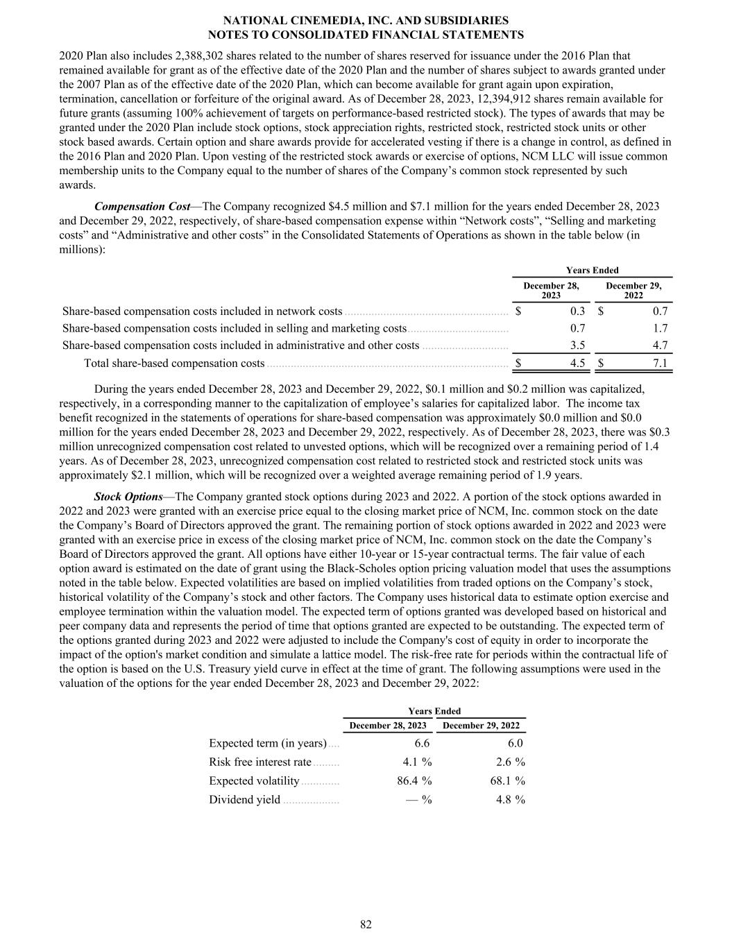 2020 Plan also includes 2,388,302 shares related to the number of shares reserved for issuance under the 2016 Plan that remained available for grant as of the effective date of the 2020 Plan and the number of shares subject to awards granted under the 2007 Plan as of the effective date of the 2020 Plan, which can become available for grant again upon expiration, termination, cancellation or forfeiture of the original award. As of December 28, 2023, 12,394,912 shares remain available for future grants (assuming 100% achievement of targets on performance-based restricted stock). The types of awards that may be granted under the 2020 Plan include stock options, stock appreciation rights, restricted stock, restricted stock units or other stock based awards. Certain option and share awards provide for accelerated vesting if there is a change in control, as defined in the 2016 Plan and 2020 Plan. Upon vesting of the restricted stock awards or exercise of options, NCM LLC will issue common membership units to the Company equal to the number of shares of the Company’s common stock represented by such awards. Compensation Cost—The Company recognized $4.5 million and $7.1 million for the years ended December 28, 2023 and December 29, 2022, respectively, of share-based compensation expense within “Network costs”, “Selling and marketing costs” and “Administrative and other costs” in the Consolidated Statements of Operations as shown in the table below (in millions): Years Ended December 28, 2023 December 29, 2022 Share-based compensation costs included in network costs ....................................................... $ 0.3 $ 0.7 Share-based compensation costs included in selling and marketing costs .................................. 0.7 1.7 Share-based compensation costs included in administrative and other costs ............................. 3.5 4.7 Total share-based compensation costs ................................................................................. $ 4.5 $ 7.1 During the years ended December 28, 2023 and December 29, 2022, $0.1 million and $0.2 million was capitalized, respectively, in a corresponding manner to the capitalization of employee’s salaries for capitalized labor. The income tax benefit recognized in the statements of operations for share-based compensation was approximately $0.0 million and $0.0 million for the years ended December 28, 2023 and December 29, 2022, respectively. As of December 28, 2023, there was $0.3 million unrecognized compensation cost related to unvested options, which will be recognized over a remaining period of 1.4 years. As of December 28, 2023, unrecognized compensation cost related to restricted stock and restricted stock units was approximately $2.1 million, which will be recognized over a weighted average remaining period of 1.9 years. Stock Options—The Company granted stock options during 2023 and 2022. A portion of the stock options awarded in 2022 and 2023 were granted with an exercise price equal to the closing market price of NCM, Inc. common stock on the date the Company’s Board of Directors approved the grant. The remaining portion of stock options awarded in 2022 and 2023 were granted with an exercise price in excess of the closing market price of NCM, Inc. common stock on the date the Company’s Board of Directors approved the grant. All options have either 10-year or 15-year contractual terms. The fair value of each option award is estimated on the date of grant using the Black-Scholes option pricing valuation model that uses the assumptions noted in the table below. Expected volatilities are based on implied volatilities from traded options on the Company’s stock, historical volatility of the Company’s stock and other factors. The Company uses historical data to estimate option exercise and employee termination within the valuation model. The expected term of options granted was developed based on historical and peer company data and represents the period of time that options granted are expected to be outstanding. The expected term of the options granted during 2023 and 2022 were adjusted to include the Company's cost of equity in order to incorporate the impact of the option's market condition and simulate a lattice model. The risk-free rate for periods within the contractual life of the option is based on the U.S. Treasury yield curve in effect at the time of grant. The following assumptions were used in the valuation of the options for the year ended December 28, 2023 and December 29, 2022: Years Ended December 28, 2023 December 29, 2022 Expected term (in years) .... 6.6 6.0 Risk free interest rate ......... 4.1 % 2.6 % Expected volatility ............. 86.4 % 68.1 % Dividend yield ................... — % 4.8 % NATIONAL CINEMEDIA, INC. AND SUBSIDIARIES NOTES TO CONSOLIDATED FINANCIAL STATEMENTS 82