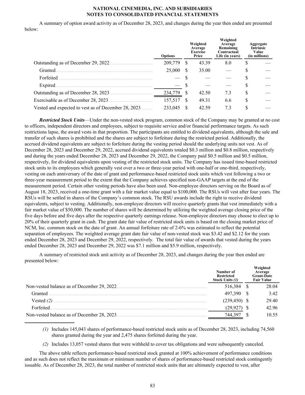 A summary of option award activity as of December 28, 2023, and changes during the year then ended are presented below: Options Weighted Average Exercise Price Weighted Average Remaining Contractual Life (in years) Aggregate Intrinsic Value (in millions) Outstanding as of December 29, 2022 .................................. 209,779 $ 43.39 8.0 $ — Granted .............................................................................. 25,000 $ 35.00 — $ — Forfeited ............................................................................ — $ — — $ — Expired .............................................................................. — $ — — $ — Outstanding as of December 28, 2023 .................................. 234,779 $ 42.50 7.3 $ — Exercisable as of December 28, 2023 ................................... 157,517 $ 49.31 6.6 $ — Vested and expected to vest as of December 28, 2023 ......... 233,045 $ 42.59 7.3 $ — Restricted Stock Units—Under the non-vested stock program, common stock of the Company may be granted at no cost to officers, independent directors and employees, subject to requisite service and/or financial performance targets. As such restrictions lapse, the award vests in that proportion. The participants are entitled to dividend equivalents, although the sale and transfer of such shares is prohibited and the shares are subject to forfeiture during the restricted period. Additionally, the accrued dividend equivalents are subject to forfeiture during the vesting period should the underlying units not vest. As of December 28, 2023 and December 29, 2022, accrued dividend equivalents totaled $0.3 million and $0.8 million, respectively and during the years ended December 28, 2023 and December 29, 2022, the Company paid $0.5 million and $0.5 million, respectively, for dividend equivalents upon vesting of the restricted stock units. The Company has issued time-based restricted stock units to its employees which generally vest over a two or three-year period with one-half or one-third, respectively, vesting on each anniversary of the date of grant and performance-based restricted stock units which vest following a two or three-year measurement period to the extent that the Company achieves specified non-GAAP targets at the end of the measurement period. Certain other vesting periods have also been used. Non-employee directors serving on the Board as of August 18, 2023, received a one-time grant with a fair market value equal to $100,000. The RSUs will vest after four years. The RSUs will be settled in shares of the Company’s common stock. The RSU awards include the right to receive dividend equivalents, subject to vesting. Additionally, non-employee directors will receive quarterly grants that vest immediately with a fair market value of $50,000. The number of shares will be determined by utilizing the weighted average closing price of the five days before and five days after the respective quarterly earnings release. Non-employee directors may choose to elect up to 20% of their quarterly grant in cash. The grant date fair value of restricted stock units is based on the closing market price of NCM, Inc. common stock on the date of grant. An annual forfeiture rate of 2-6% was estimated to reflect the potential separation of employees. The weighted average grant date fair value of non-vested stock was $3.42 and $2.12 for the years ended December 28, 2023 and December 29, 2022, respectively. The total fair value of awards that vested during the years ended December 28, 2023 and December 29, 2022 was $7.1 million and $5.9 million, respectively. A summary of restricted stock unit activity as of December 28, 2023, and changes during the year then ended are presented below: Number of Restricted Stock Units (1) Weighted Average Grant-Date Fair Value Non-vested balance as of December 29, 2022 ........................................................................ 516,384 $ 28.04 Granted ............................................................................................................................... 497,390 $ 3.42 Vested (2) ........................................................................................................................... (239,450) $ 29.40 Forfeited .............................................................................................................................. (29,927) $ 42.96 Non-vested balance as of December 28, 2023 ........................................................................ 744,397 $ 10.55 (1) Includes 145,043 shares of performance-based restricted stock units as of December 28, 2023, including 74,560 shares granted during the year and 2,475 shares forfeited during the year. (2) Includes 13,057 vested shares that were withheld to cover tax obligations and were subsequently canceled. The above table reflects performance-based restricted stock granted at 100% achievement of performance conditions and as such does not reflect the maximum or minimum number of shares of performance-based restricted stock contingently issuable. As of December 28, 2023, the total number of restricted stock units that are ultimately expected to vest, after NATIONAL CINEMEDIA, INC. AND SUBSIDIARIES NOTES TO CONSOLIDATED FINANCIAL STATEMENTS 83
