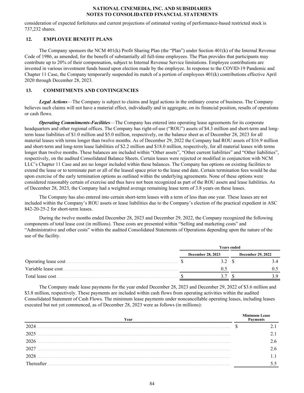 consideration of expected forfeitures and current projections of estimated vesting of performance-based restricted stock is 737,232 shares. 12. EMPLOYEE BENEFIT PLANS The Company sponsors the NCM 401(k) Profit Sharing Plan (the “Plan”) under Section 401(k) of the Internal Revenue Code of 1986, as amended, for the benefit of substantially all full-time employees. The Plan provides that participants may contribute up to 20% of their compensation, subject to Internal Revenue Service limitations. Employee contributions are invested in various investment funds based upon election made by the employee. In response to the COVID-19 Pandemic and Chapter 11 Case, the Company temporarily suspended its match of a portion of employees 401(k) contributions effective April 2020 through December 28, 2023. 13. COMMITMENTS AND CONTINGENCIES Legal Actions—The Company is subject to claims and legal actions in the ordinary course of business. The Company believes such claims will not have a material effect, individually and in aggregate, on its financial position, results of operations or cash flows. Operating Commitments-Facilities—The Company has entered into operating lease agreements for its corporate headquarters and other regional offices. The Company has right-of-use (“ROU”) assets of $4.3 million and short-term and long- term lease liabilities of $1.0 million and $5.0 million, respectively, on the balance sheet as of December 28, 2023 for all material leases with terms longer than twelve months. As of December 29, 2022 the Company had ROU assets of $16.9 million and short-term and long-term lease liabilities of $2.2 million and $18.0 million, respectively, for all material leases with terms longer than twelve months. These balances are included within “Other assets”, “Other current liabilities” and “Other liabilities”, respectively, on the audited Consolidated Balance Sheets. Certain leases were rejected or modified in conjunction with NCM LLC’s Chapter 11 Case and are no longer included within these balances. The Company has options on existing facilities to extend the lease or to terminate part or all of the leased space prior to the lease end date. Certain termination fees would be due upon exercise of the early termination options as outlined within the underlying agreements. None of these options were considered reasonably certain of exercise and thus have not been recognized as part of the ROU assets and lease liabilities. As of December 28, 2023, the Company had a weighted average remaining lease term of 3.8 years on these leases. The Company has also entered into certain short-term leases with a term of less than one year. These leases are not included within the Company’s ROU assets or lease liabilities due to the Company’s election of the practical expedient in ASC 842-20-25-2 for short-term leases. During the twelve months ended December 28, 2023 and December 29, 2022, the Company recognized the following components of total lease cost (in millions). These costs are presented within “Selling and marketing costs” and “Administrative and other costs” within the audited Consolidated Statements of Operations depending upon the nature of the use of the facility. Years ended December 28, 2023 December 29, 2022 Operating lease cost .......................................................................................... $ 3.2 $ 3.4 Variable lease cost ............................................................................................. 0.5 0.5 Total lease cost .................................................................................................. $ 3.7 $ 3.9 The Company made lease payments for the year ended December 28, 2023 and December 29, 2022 of $3.6 million and $3.8 million, respectively. These payments are included within cash flows from operating activities within the audited Consolidated Statement of Cash Flows. The minimum lease payments under noncancellable operating leases, including leases executed but not yet commenced, as of December 28, 2023 were as follows (in millions): Year Minimum Lease Payments 2024 ............................................................................................................................................................ $ 2.1 2025 ............................................................................................................................................................ 2.1 2026 ............................................................................................................................................................ 2.6 2027 ............................................................................................................................................................ 2.6 2028 ............................................................................................................................................................ 1.1 Thereafter .................................................................................................................................................... 5.5 NATIONAL CINEMEDIA, INC. AND SUBSIDIARIES NOTES TO CONSOLIDATED FINANCIAL STATEMENTS 84